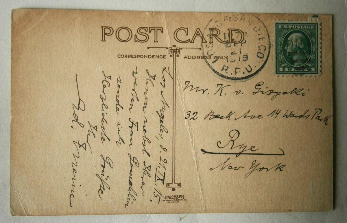 Camino real Playhouse California from the early 1900's, posted 1915 with a RPO cancellation.