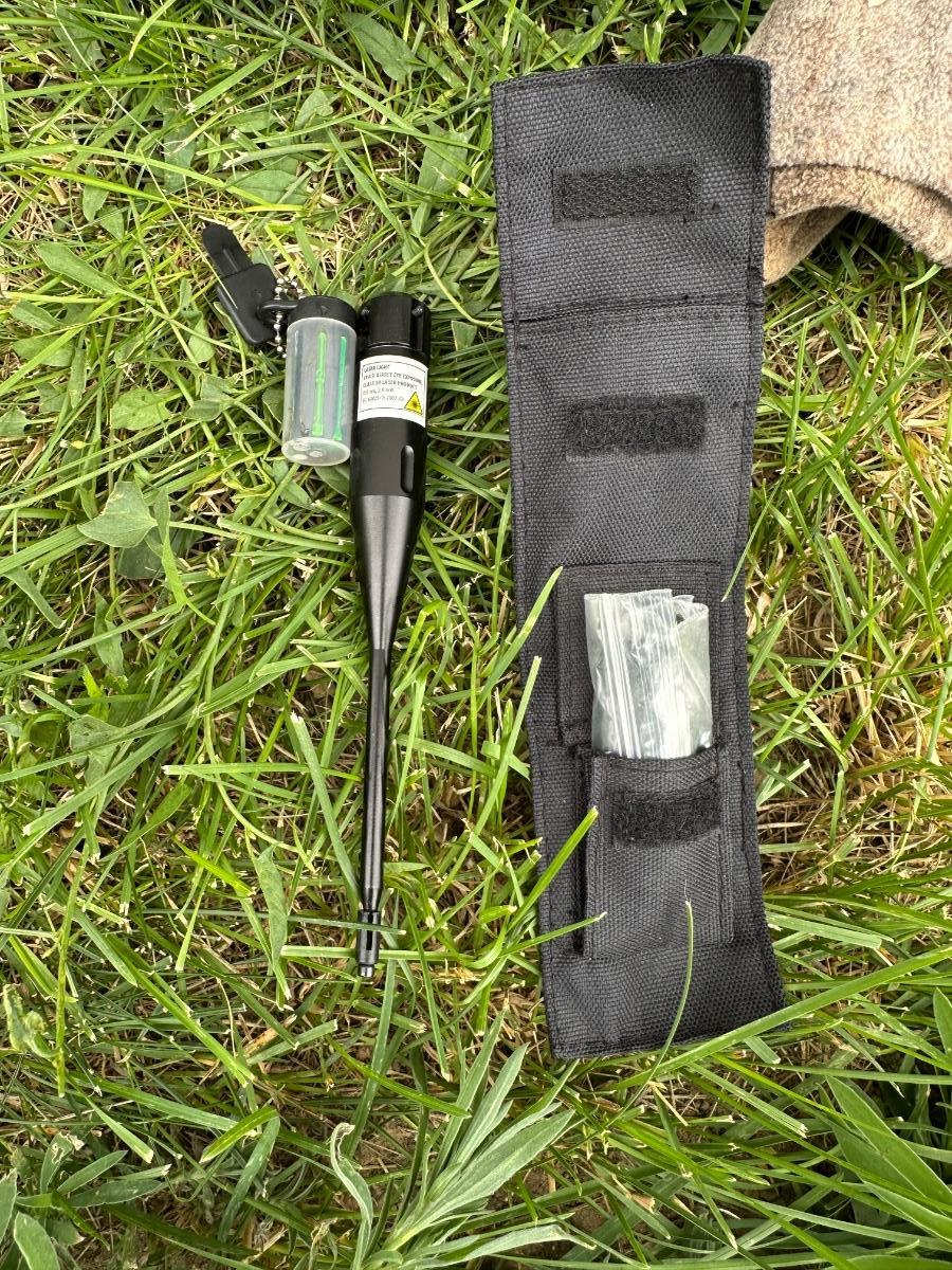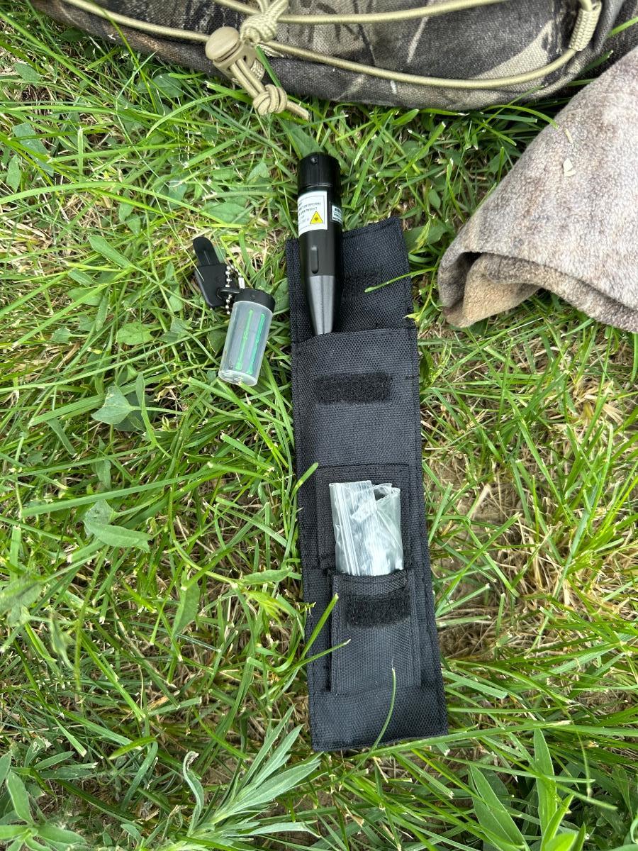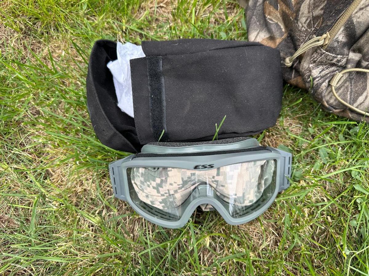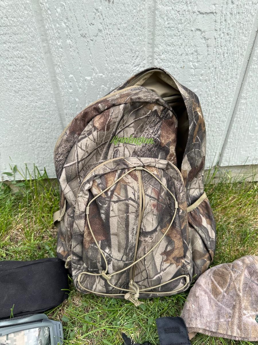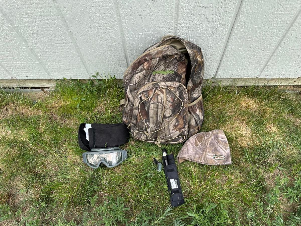 CAMO BACKPACK, LASER LIGHT, CAMO KNIT HAT AND SAFETY GOGGLES