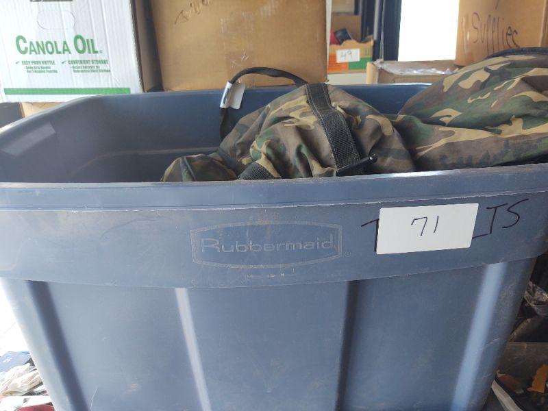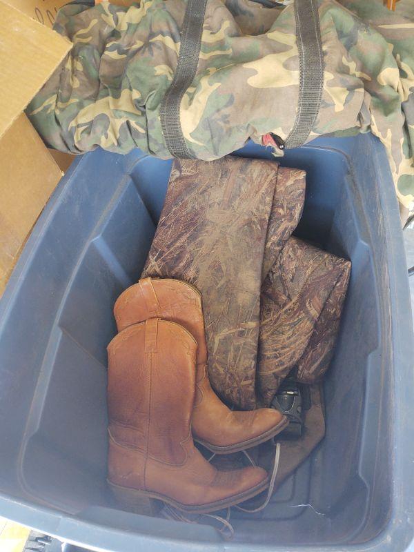 Men's large camo waders, size 9+ boots, bow and arrows(no tips) in blue bin