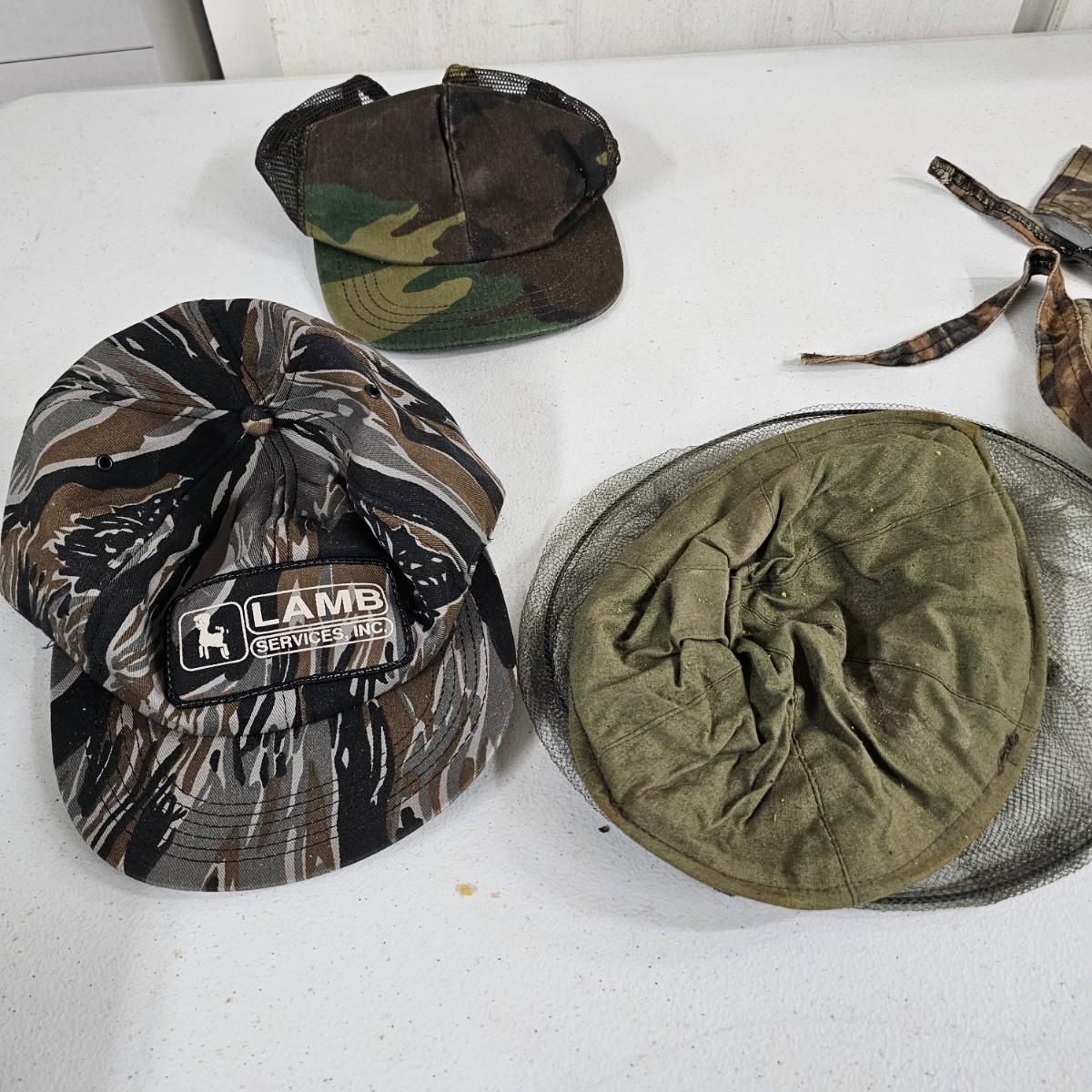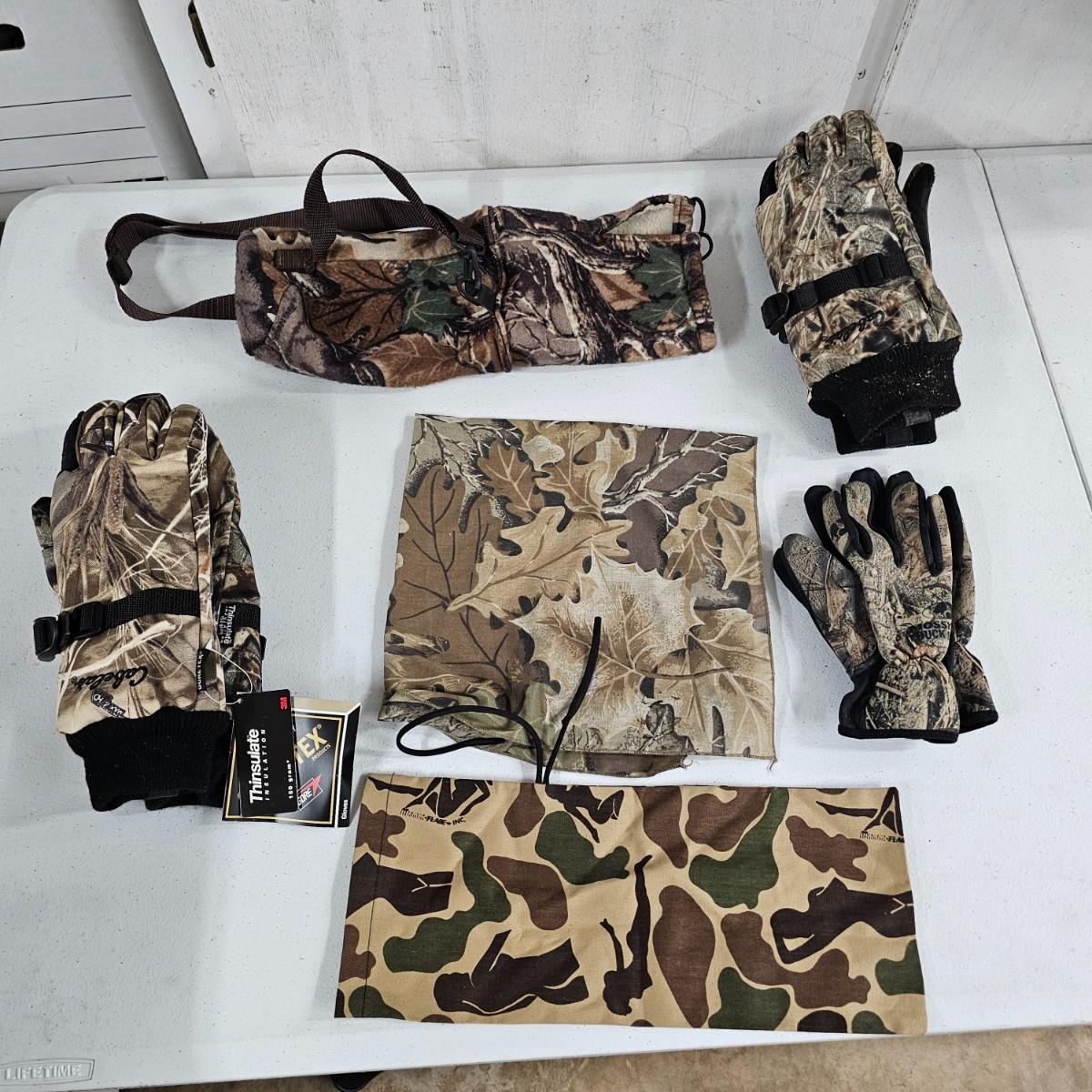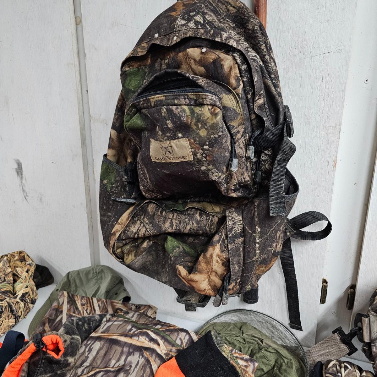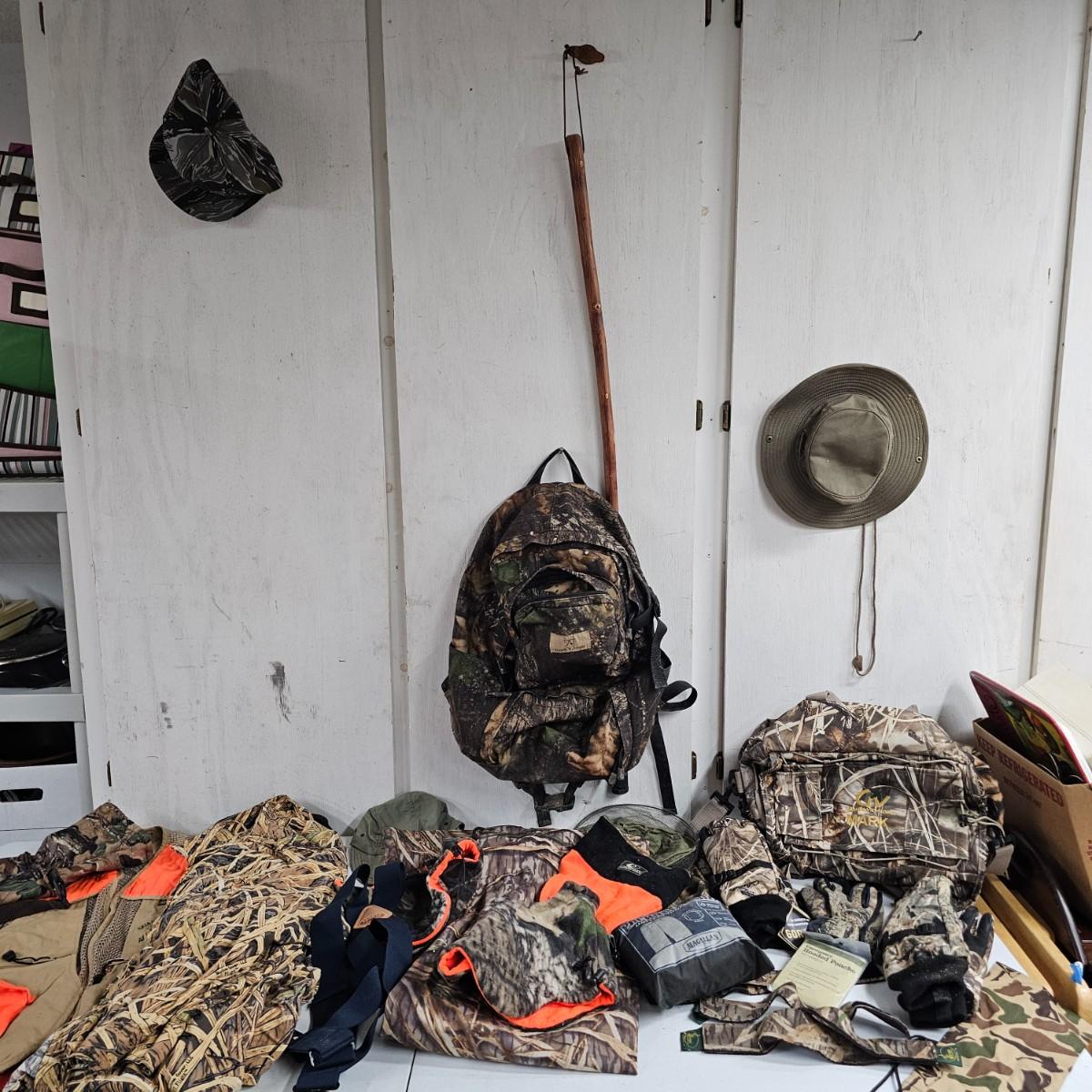 Large assortment of hunting gear, clothes, hats, bags and more. Most items are size L or XL. Remington game vest with multi pockets and ventilated back. One pair Hodgman over pants, size L, includes suspenders to hold them up. A few pairs of size L gloves with Goretex and Thermolite insulation. One XL bug resistant shirt in light camouflage colors. Ball caps, net head gear, insulated neck collars and more. One 48" long Great Smoky Mountains walking stick. See photos for details. Local pickup only.