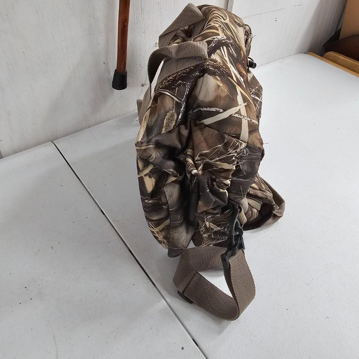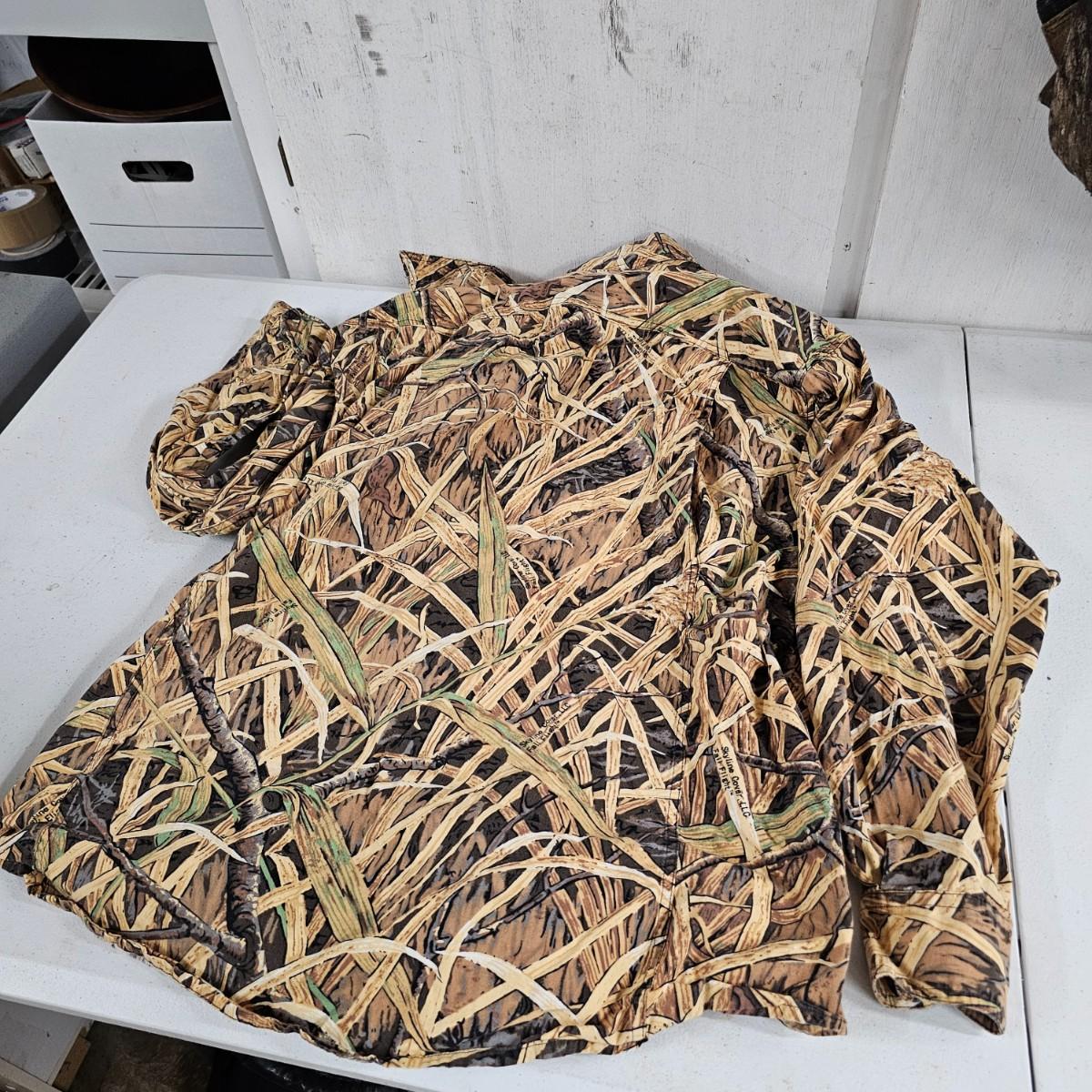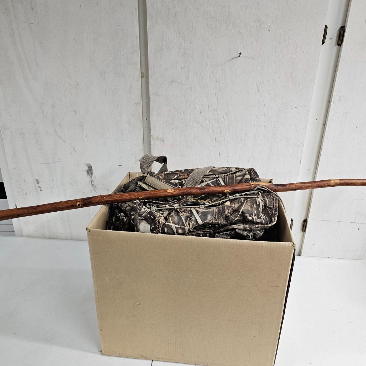 Large assortment of hunting gear, clothes, hats, bags and more. Most items are size L or XL. Remington game vest with multi pockets and ventilated back. One pair Hodgman over pants, size L, includes suspenders to hold them up. A few pairs of size L gloves with Goretex and Thermolite insulation. One XL bug resistant shirt in light camouflage colors. Ball caps, net head gear, insulated neck collars and more. One 48" long Great Smoky Mountains walking stick. See photos for details. Local pickup only.