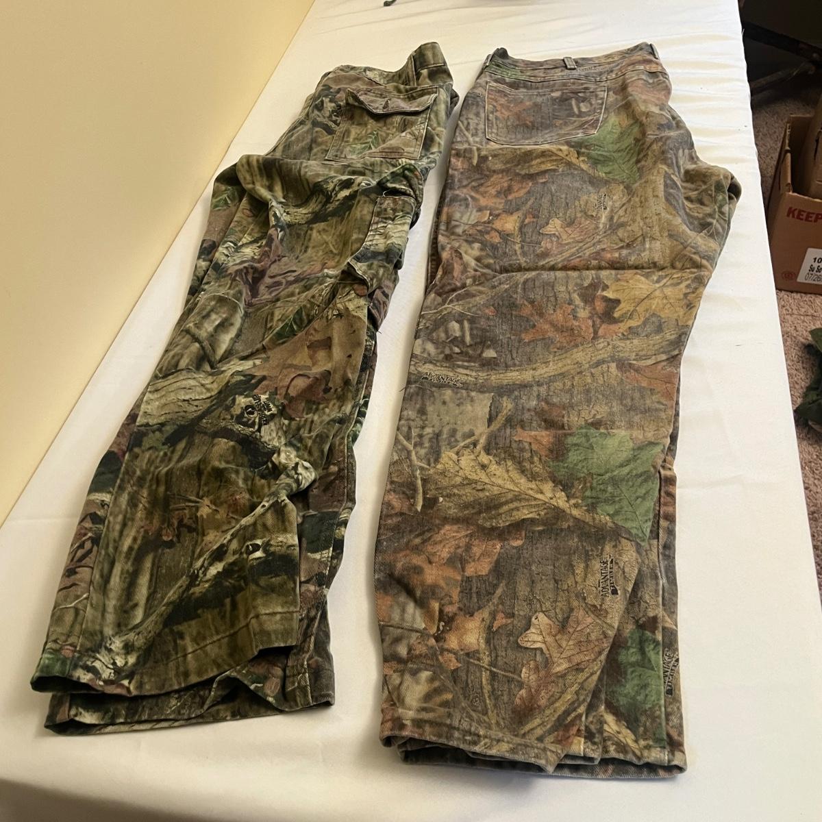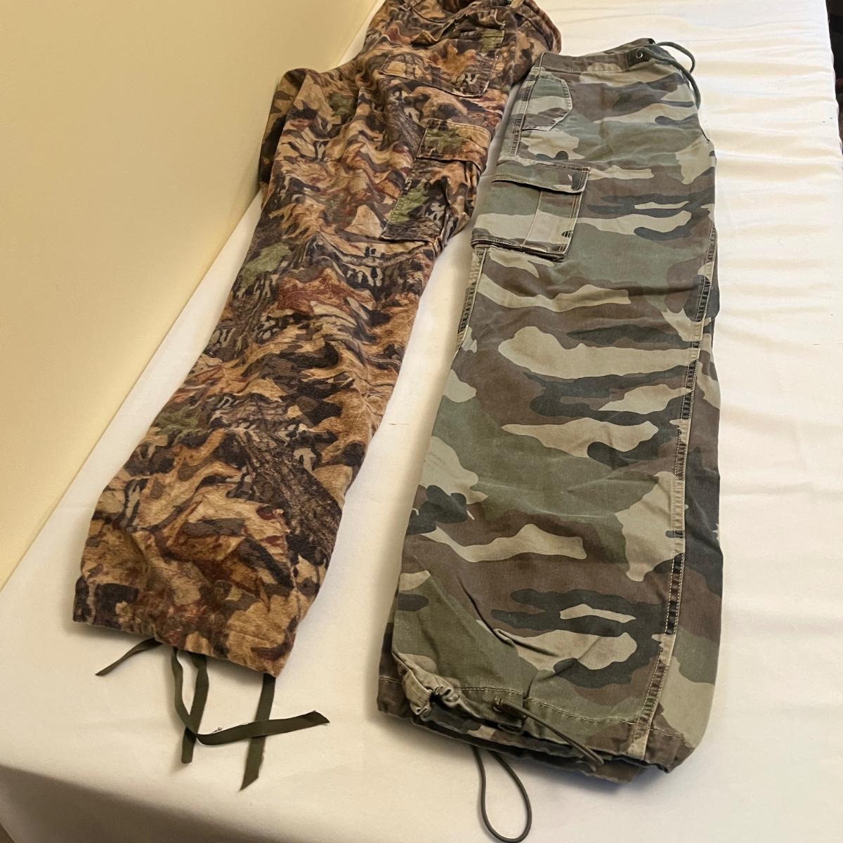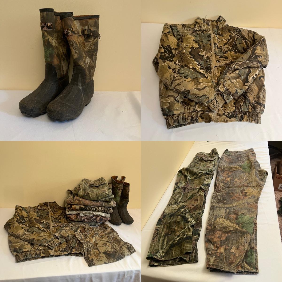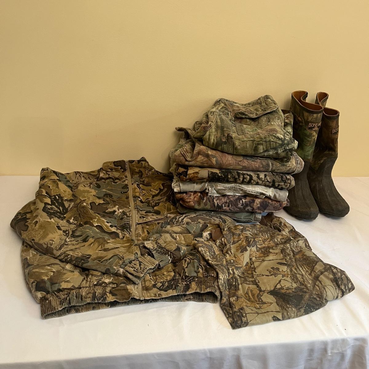 Lot includes six pairs of camouflage pants in size medium to x large, medium size jacket, size 6 Bone Dry Redhead rubber boots, and a xxl shirt.