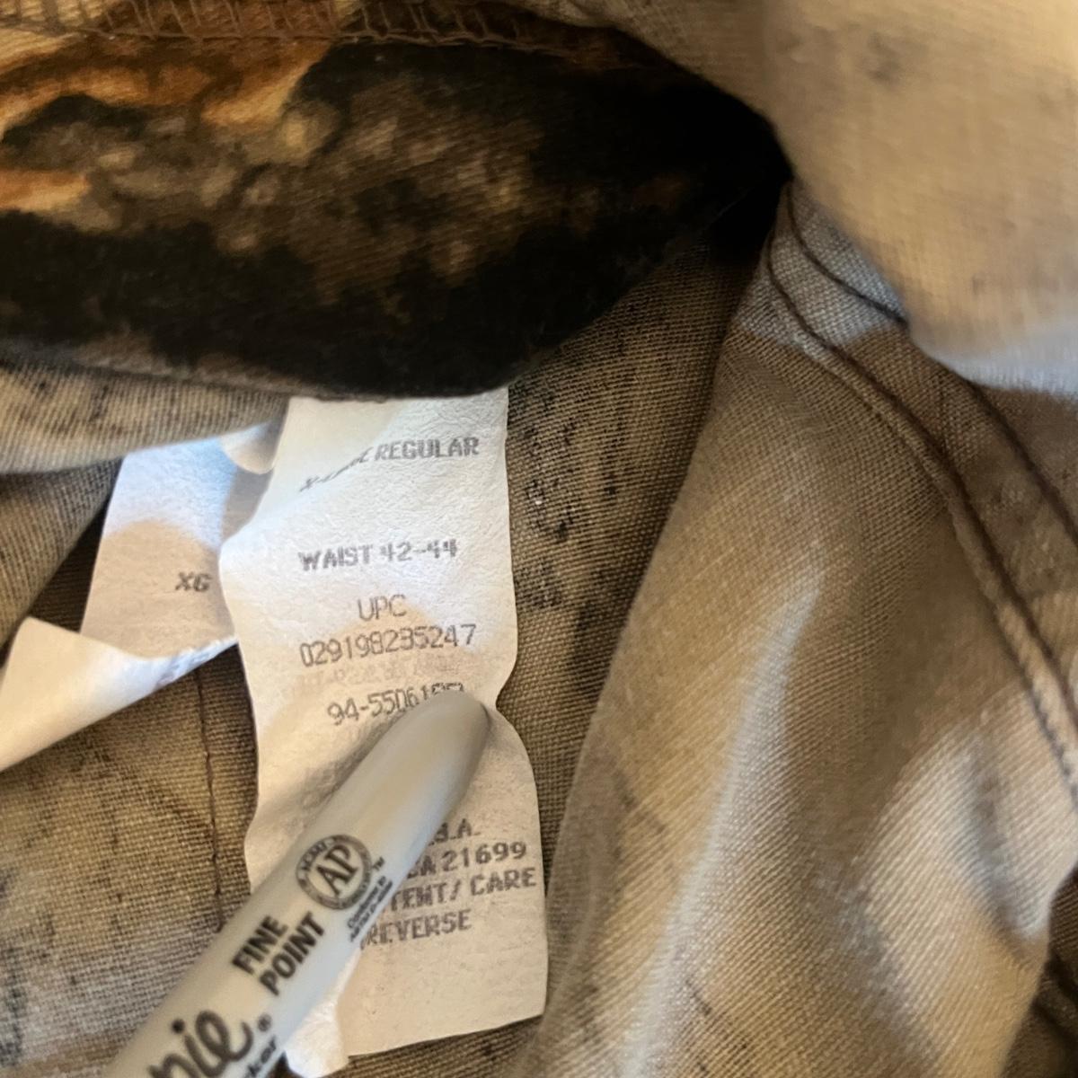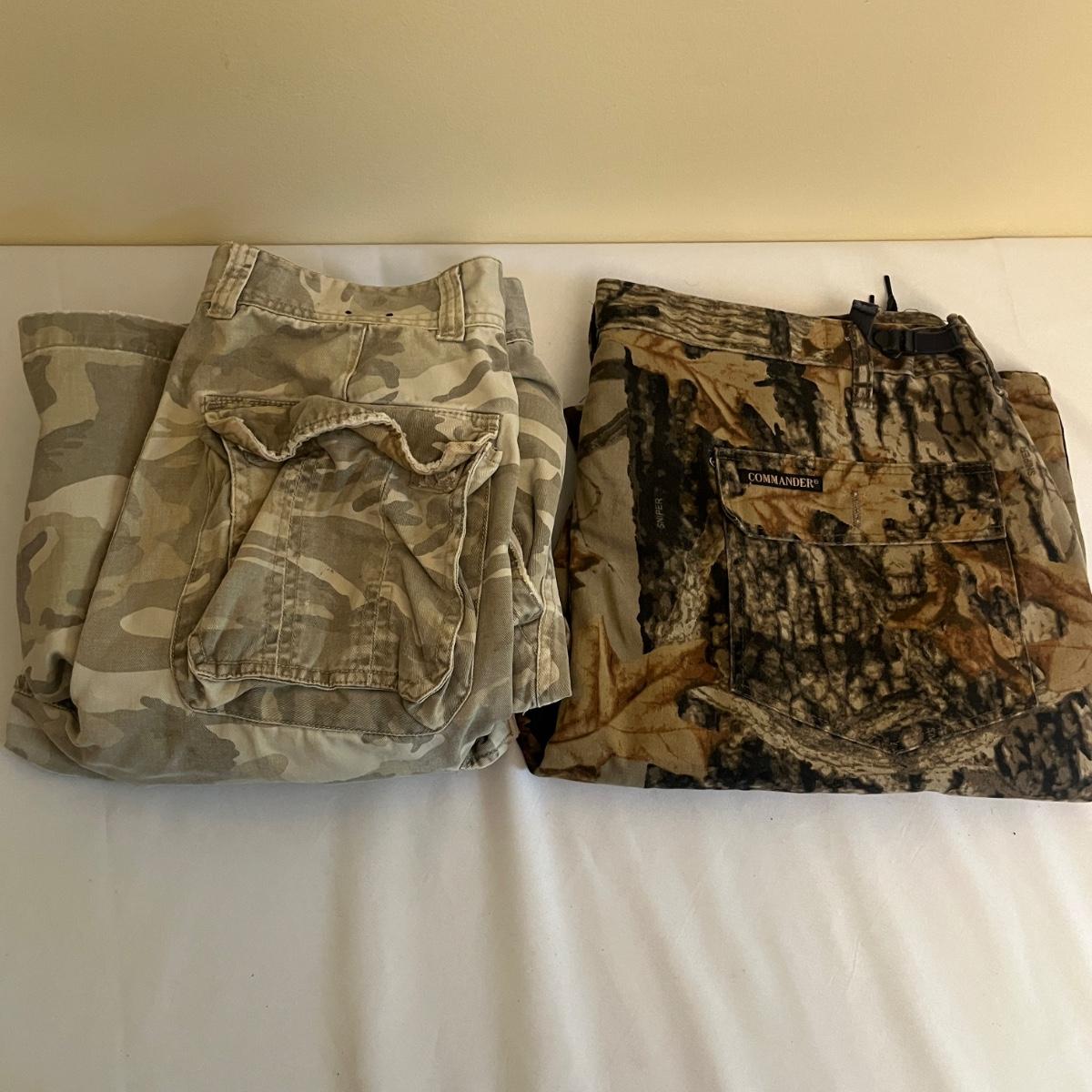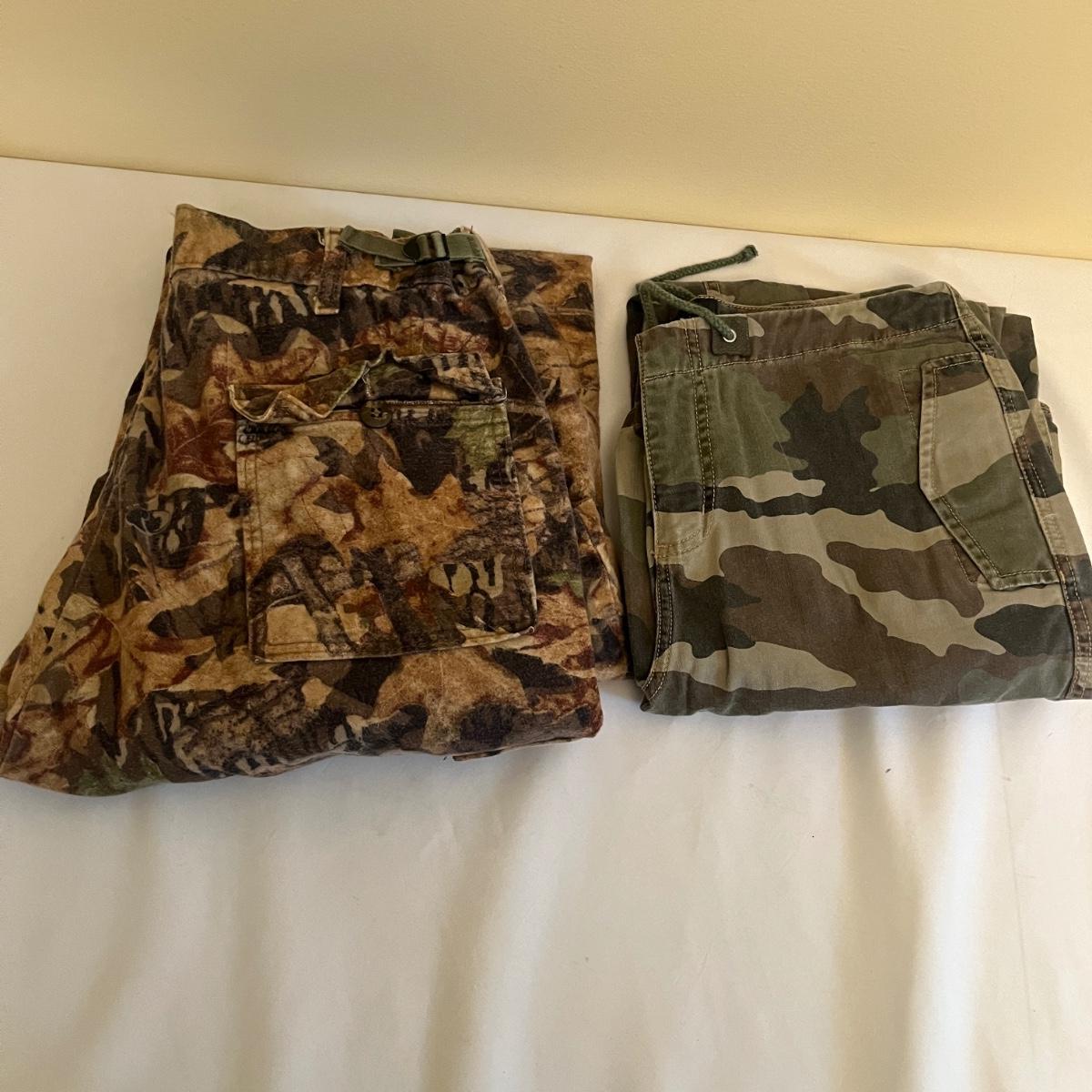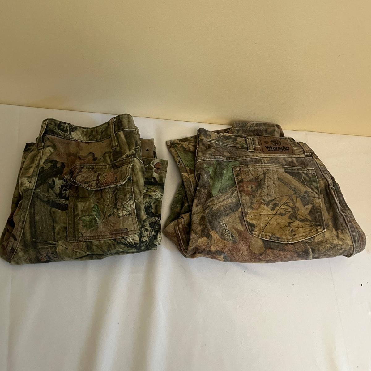 Lot includes six pairs of camouflage pants in size medium to x large, medium size jacket, size 6 Bone Dry Redhead rubber boots, and a xxl shirt.