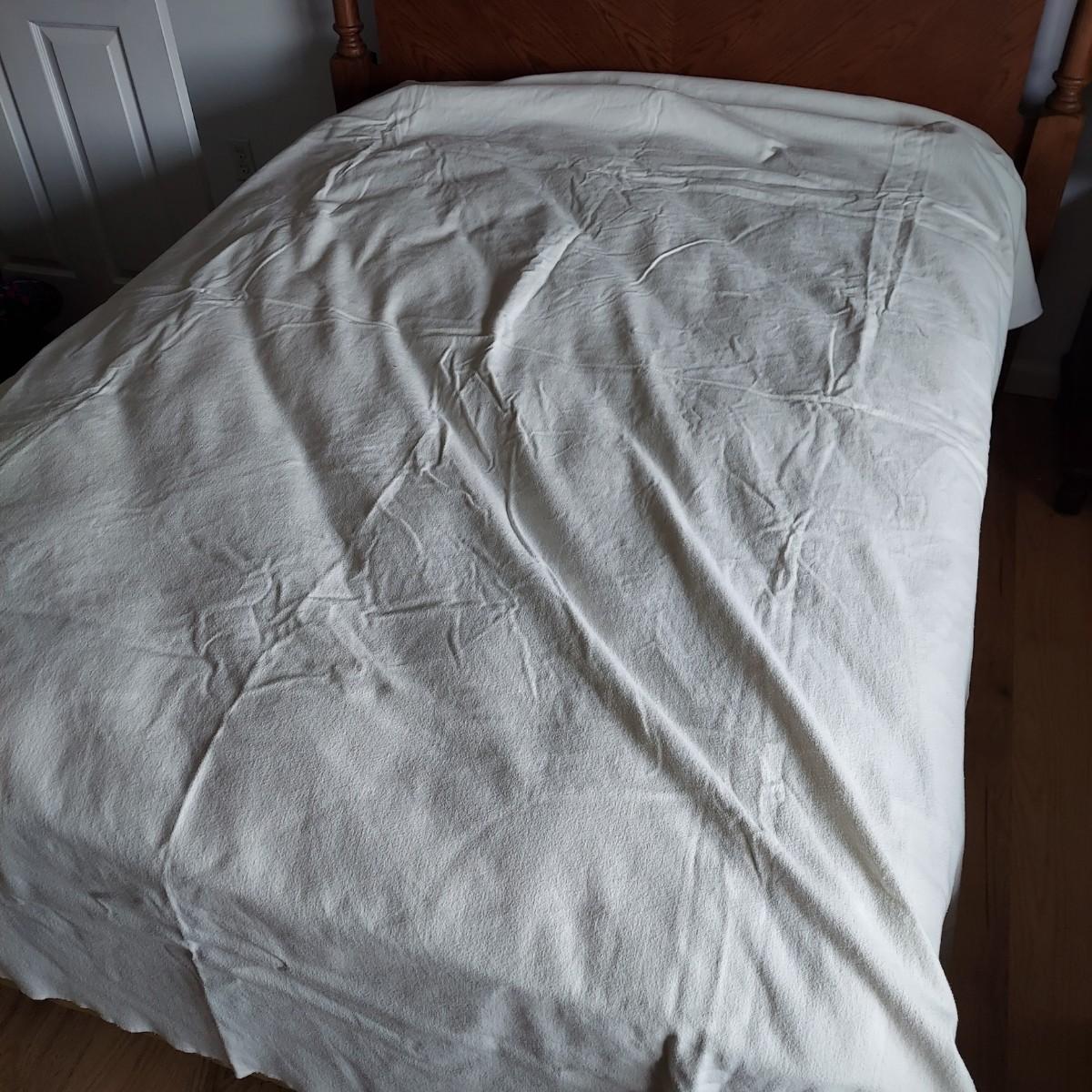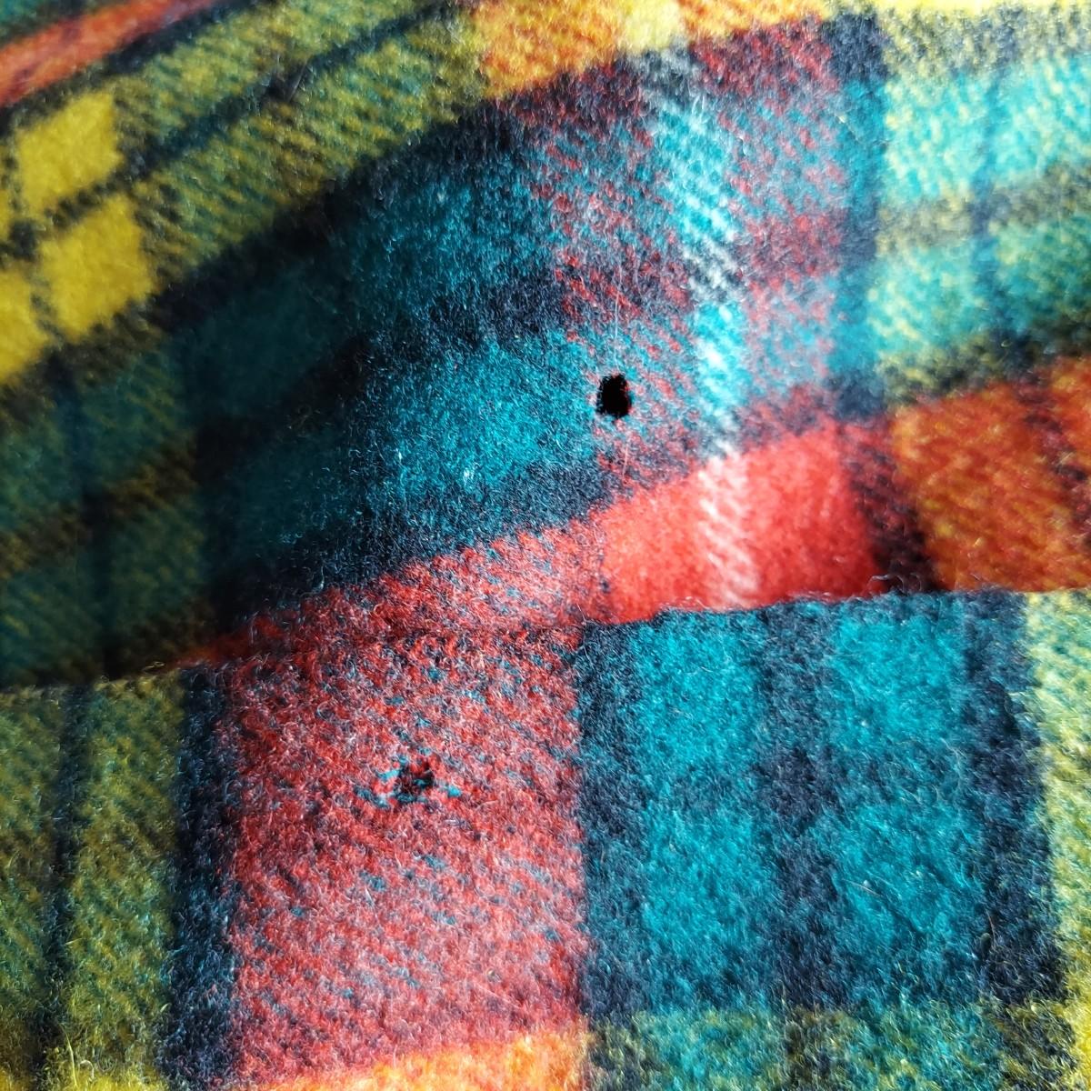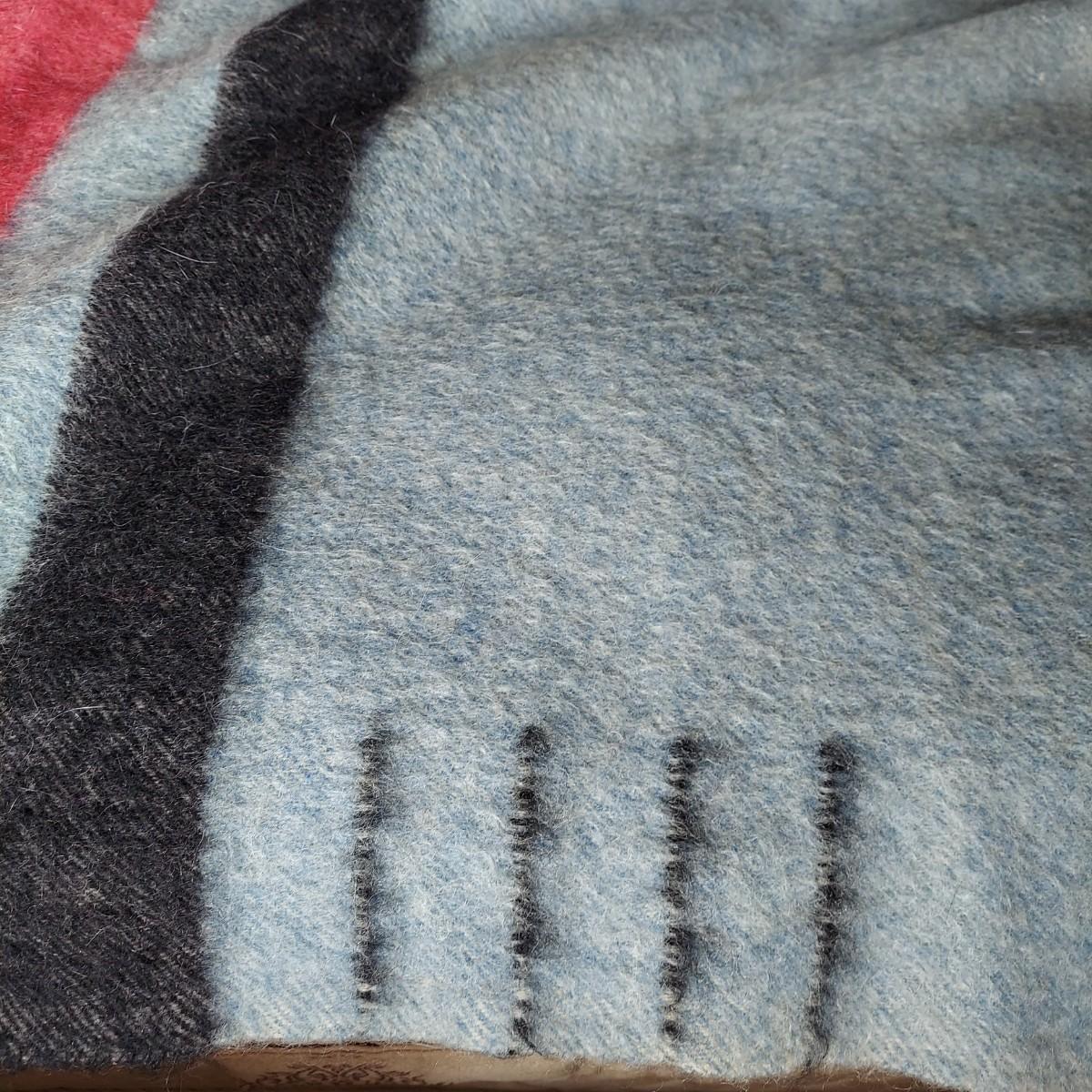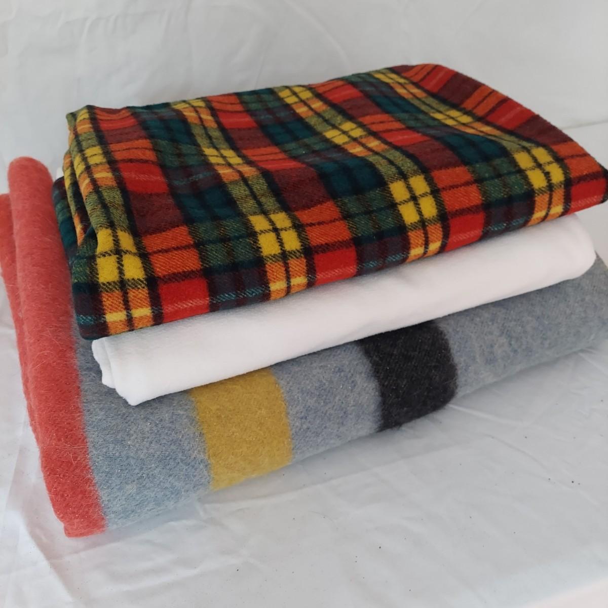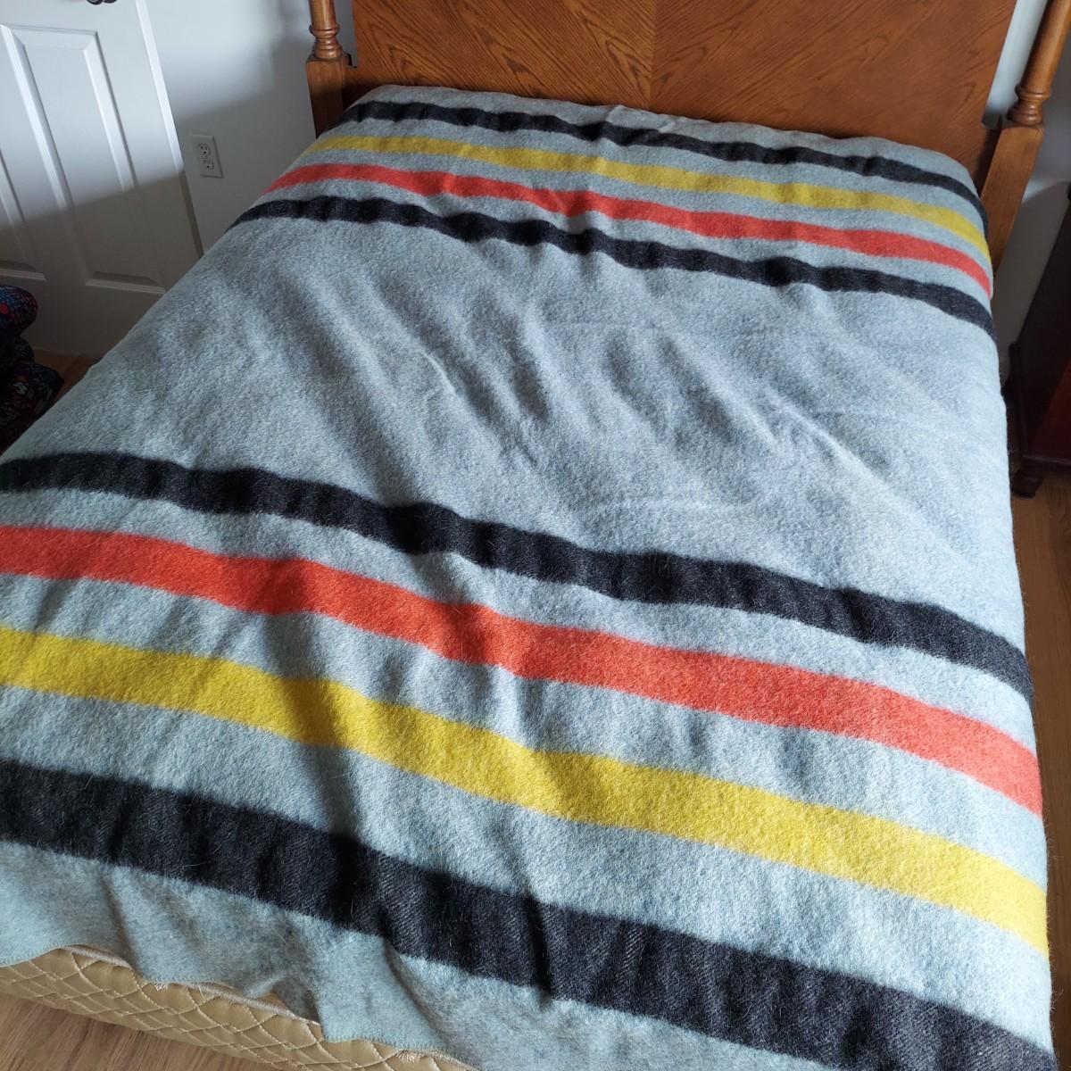 Three camp style blankets. Large, striped wool four points Hudson Bay style does not have a label. It measures 68” x 84"H. There are some moth holes in the wool blankets. Shown on full size bed. Please see photos for details. Shipping available