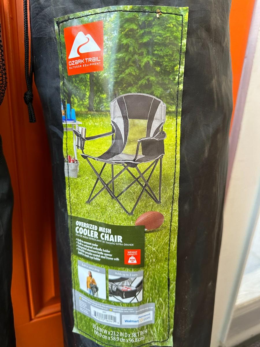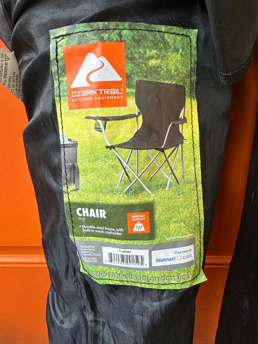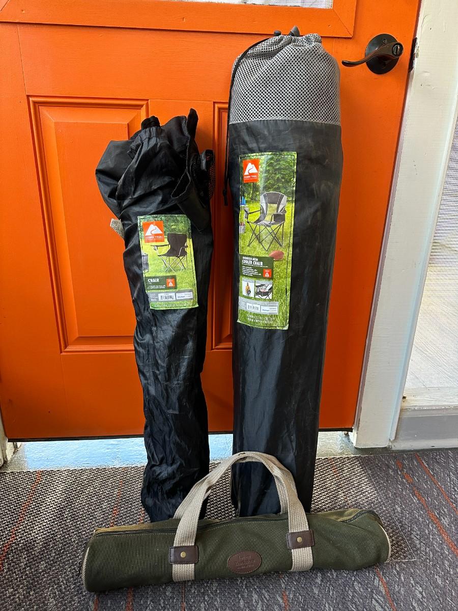 2 Ozark Trail Camp Chairs in/Carry Bags. 1 set of BBQ Tools in Green Zipper Canvas Bag