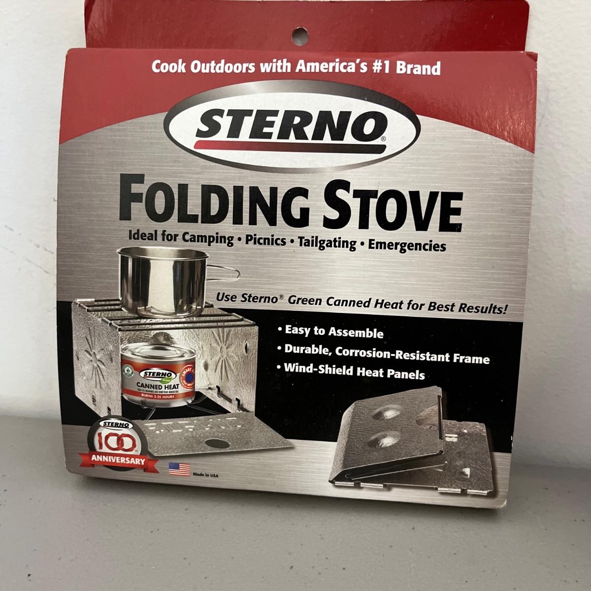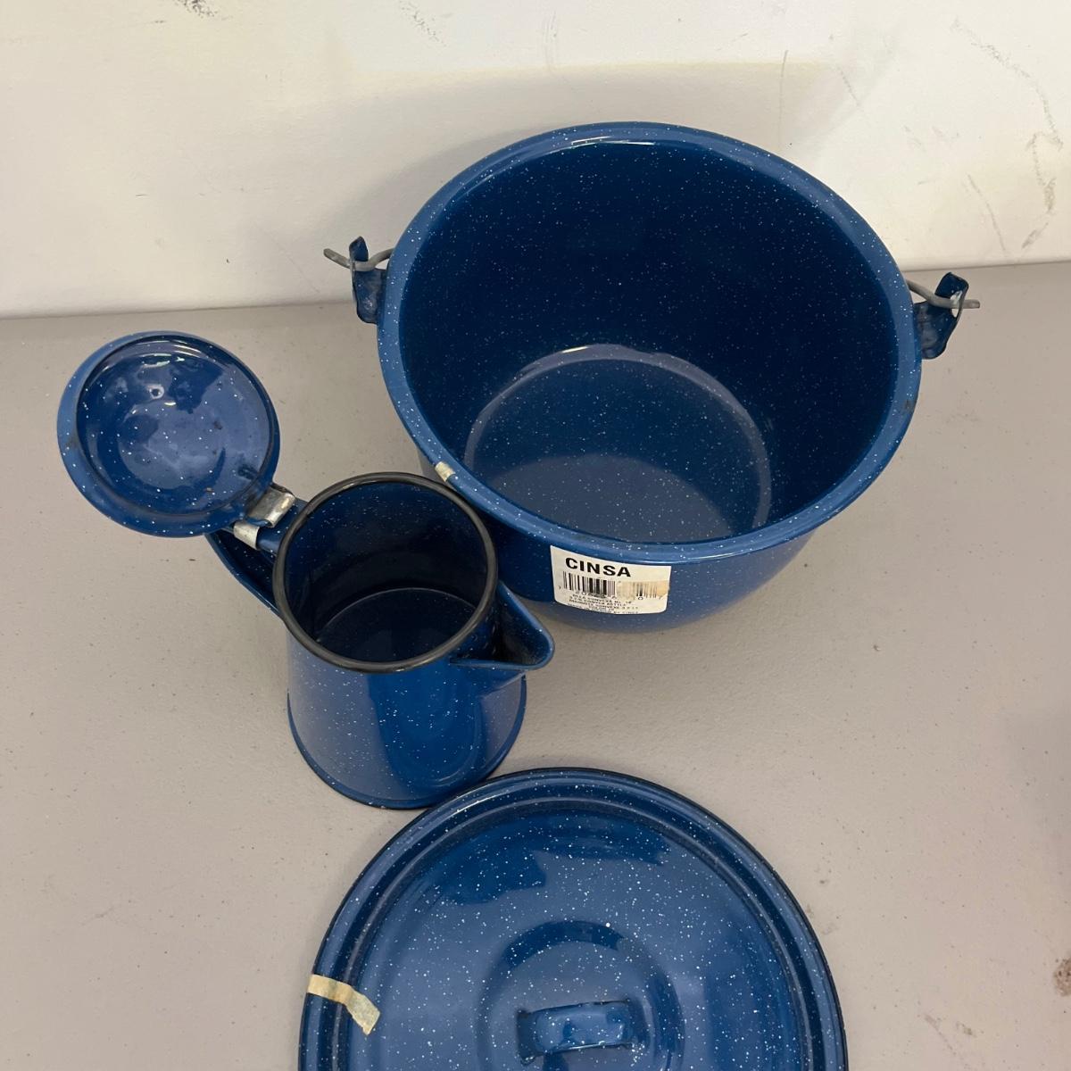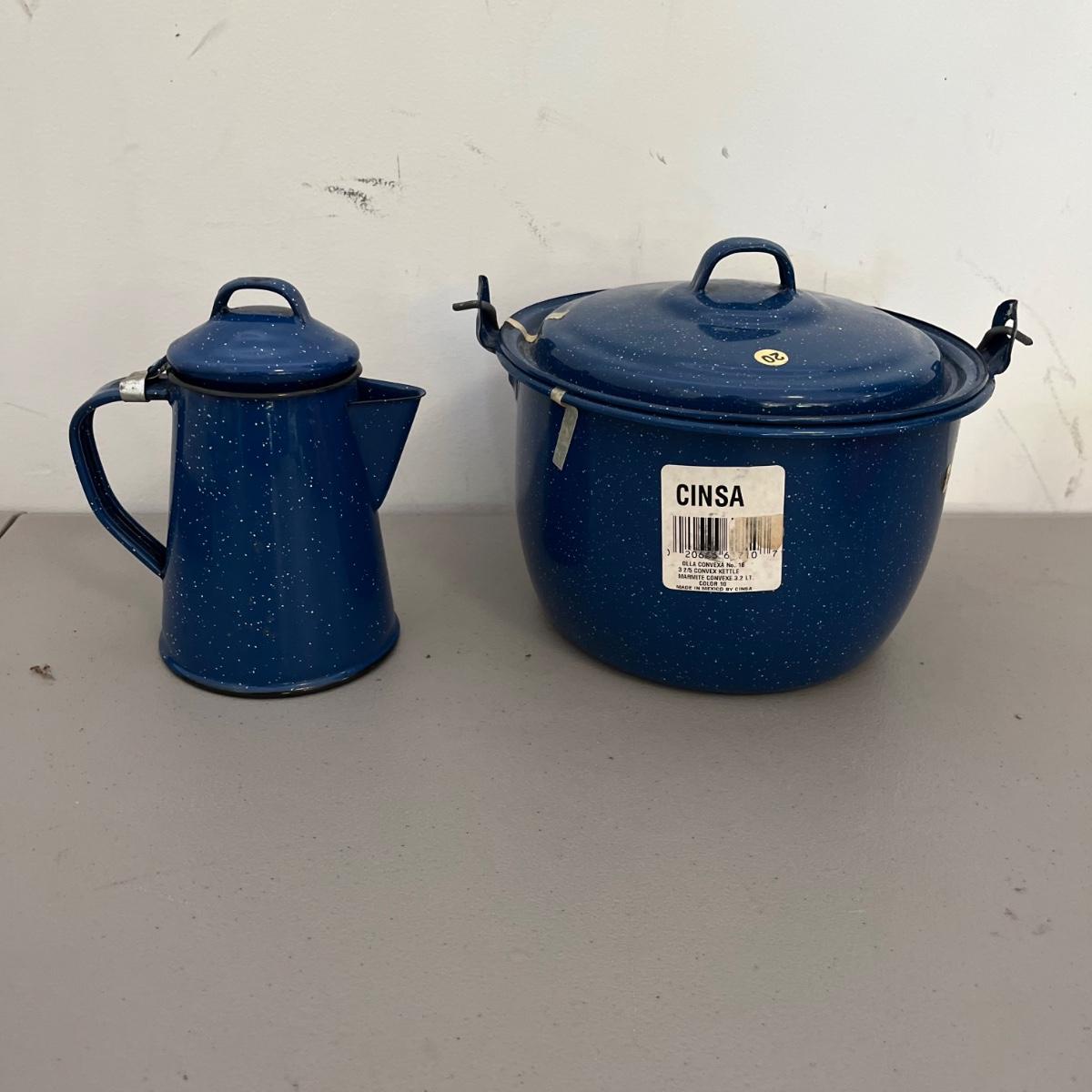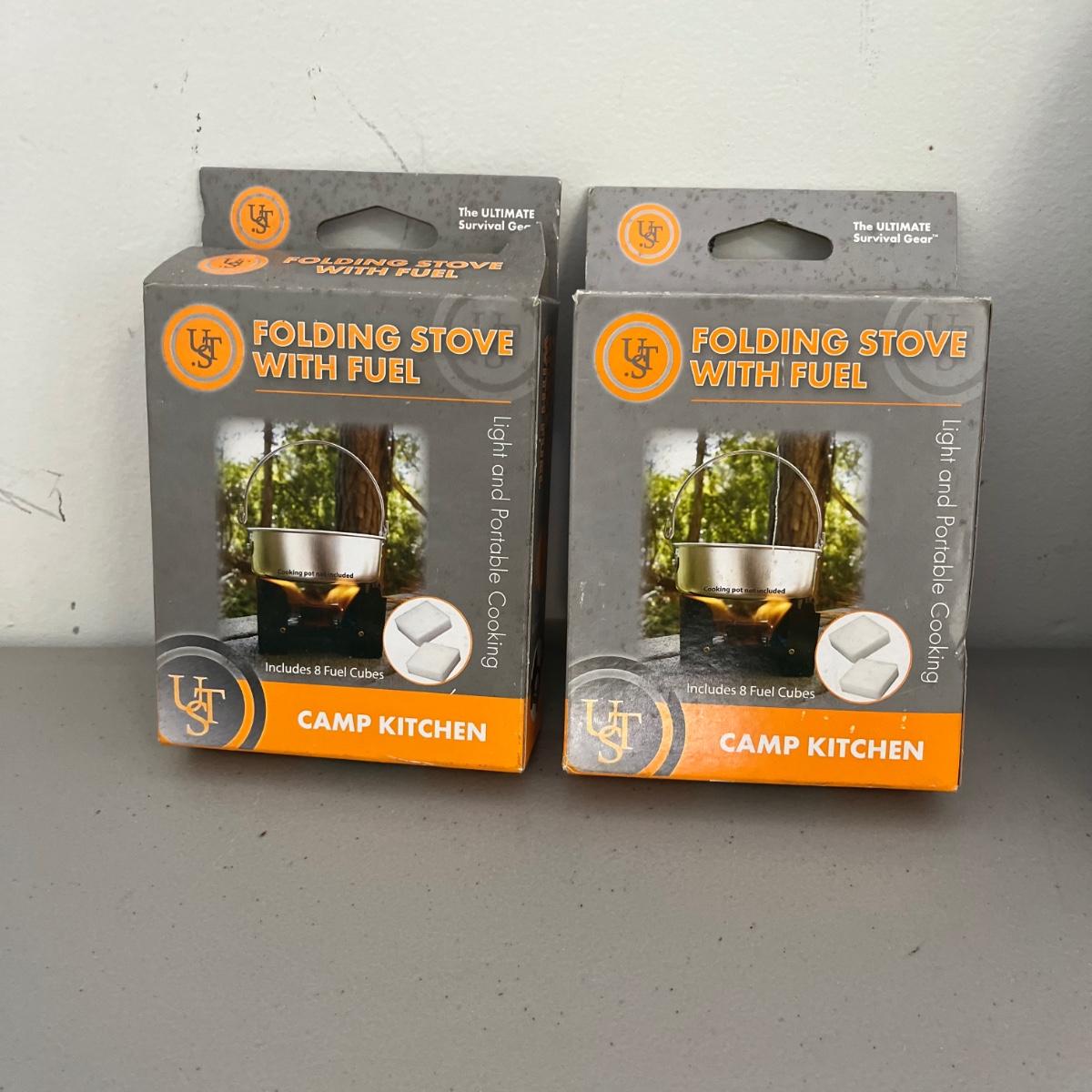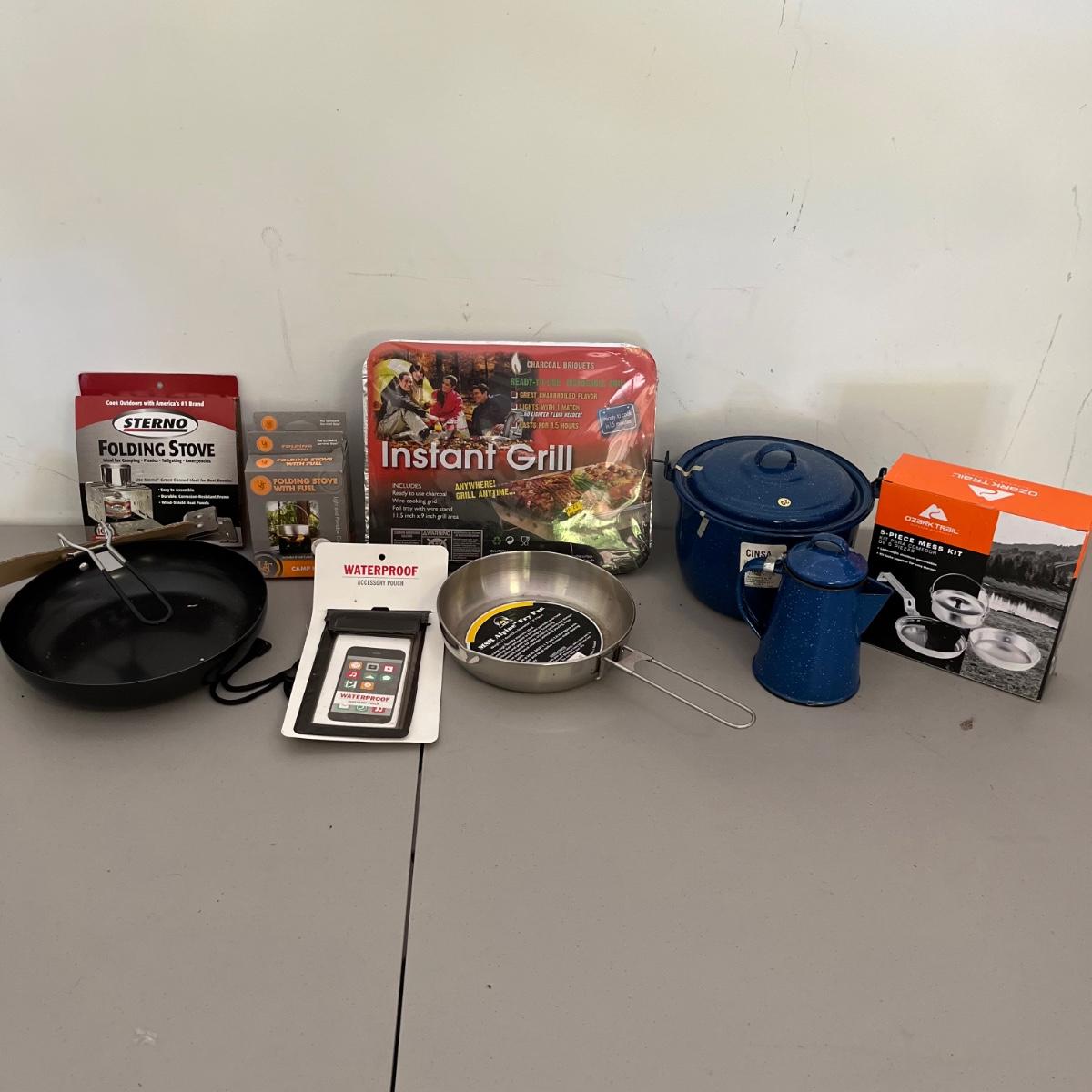 Lot includes Sterno stove, folding fuel stoves, Instant grill, two frying pans, blue speckled enamel coffee pot and pot and a mess kit.