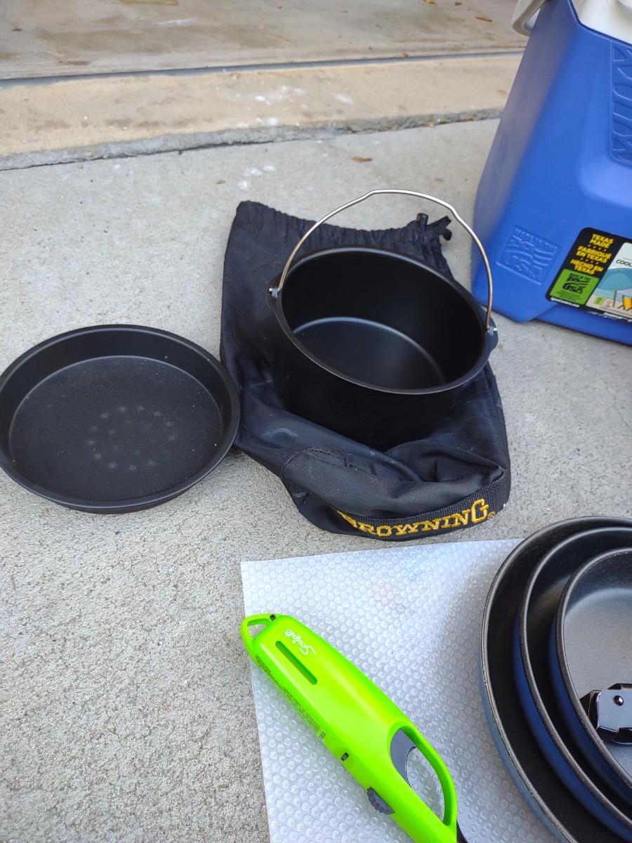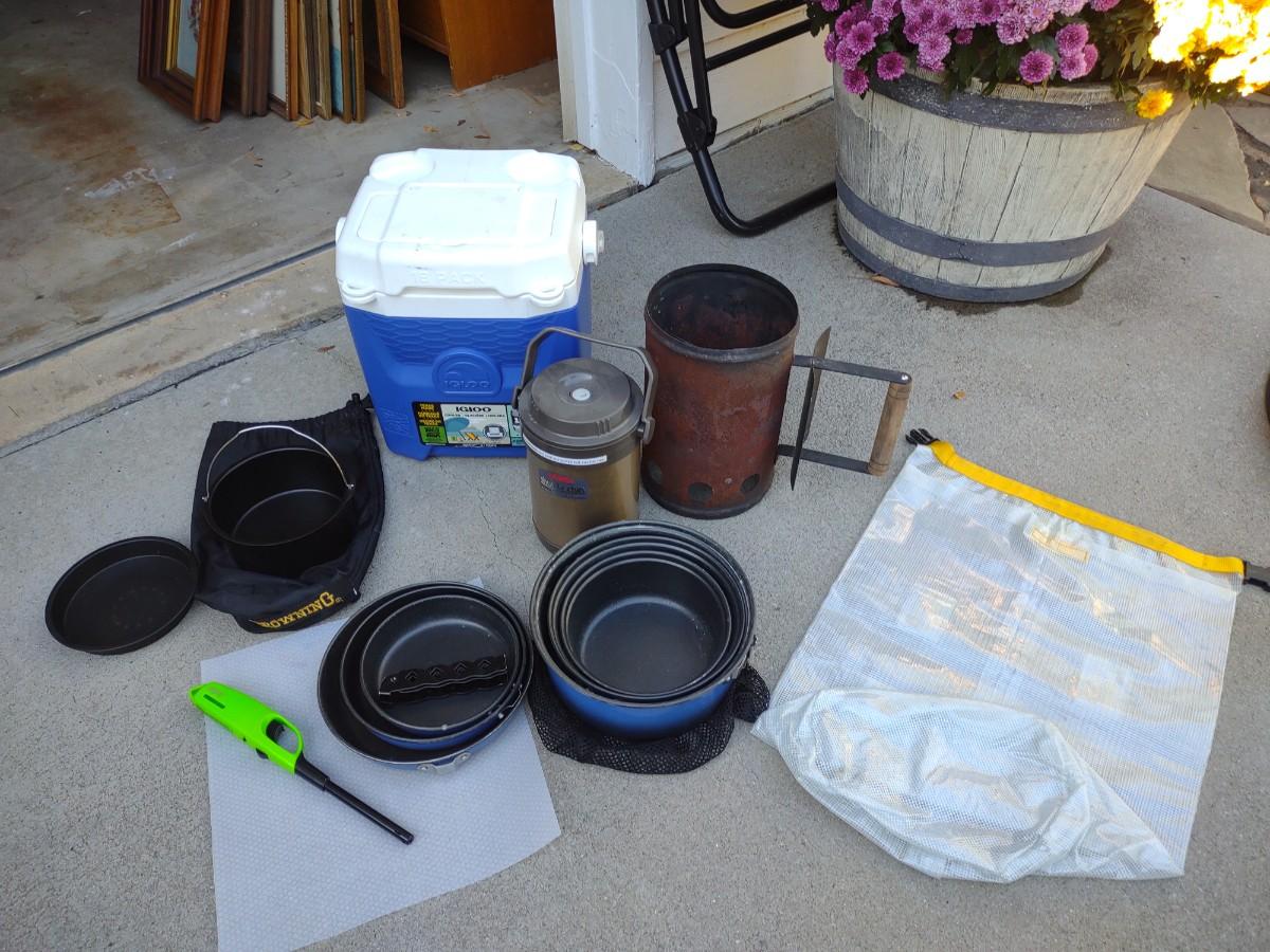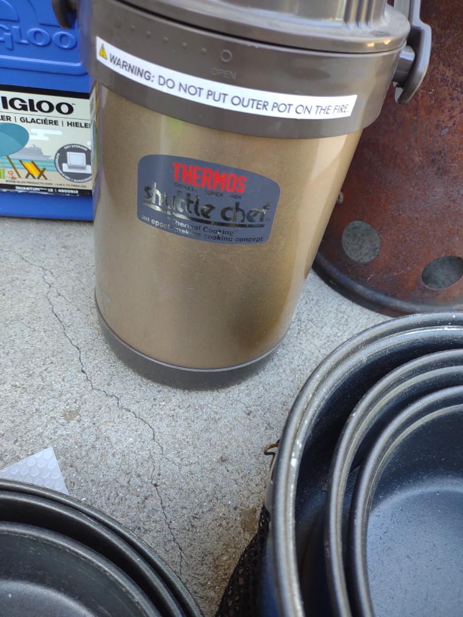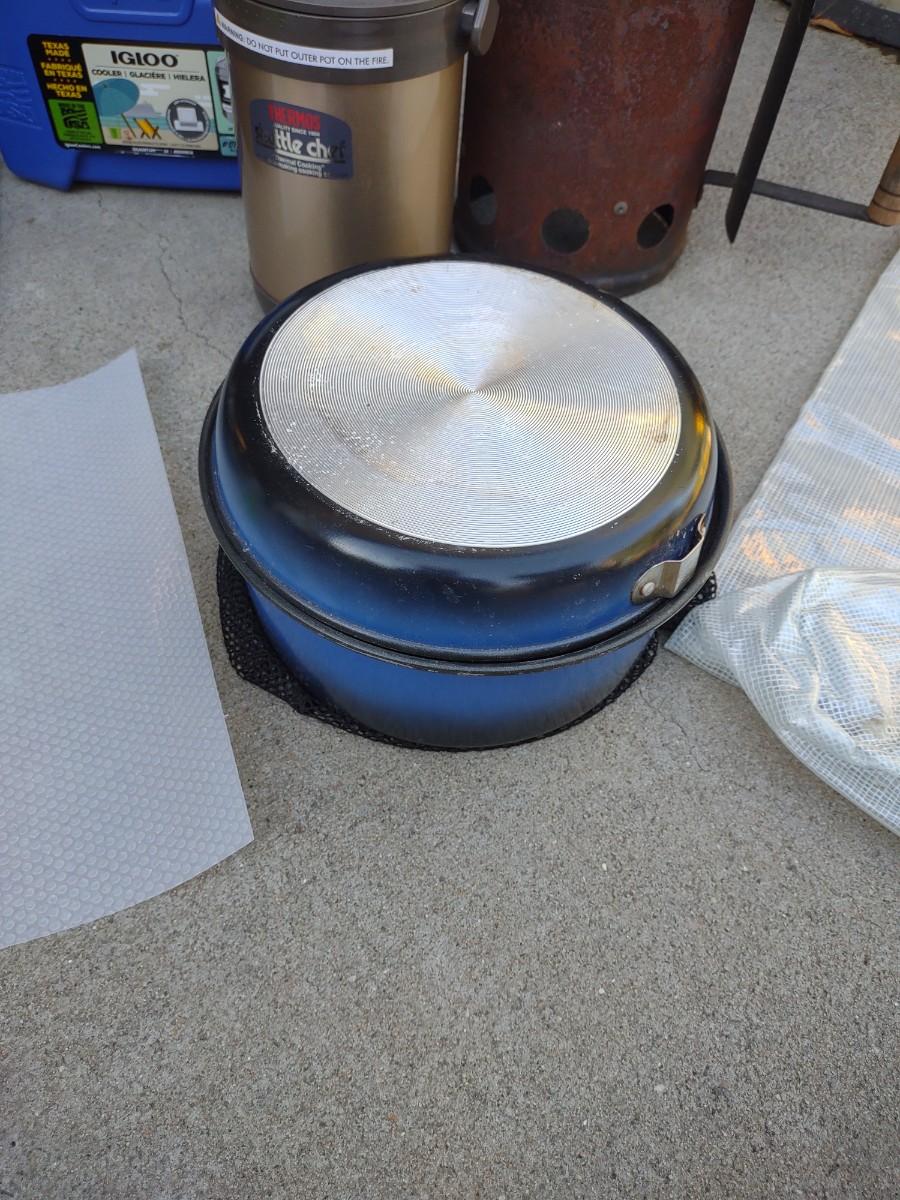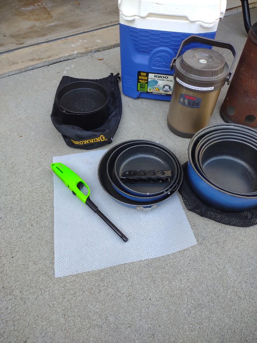 CAMP FIRE COOKING ITEMS, COOLER AND THERMOS