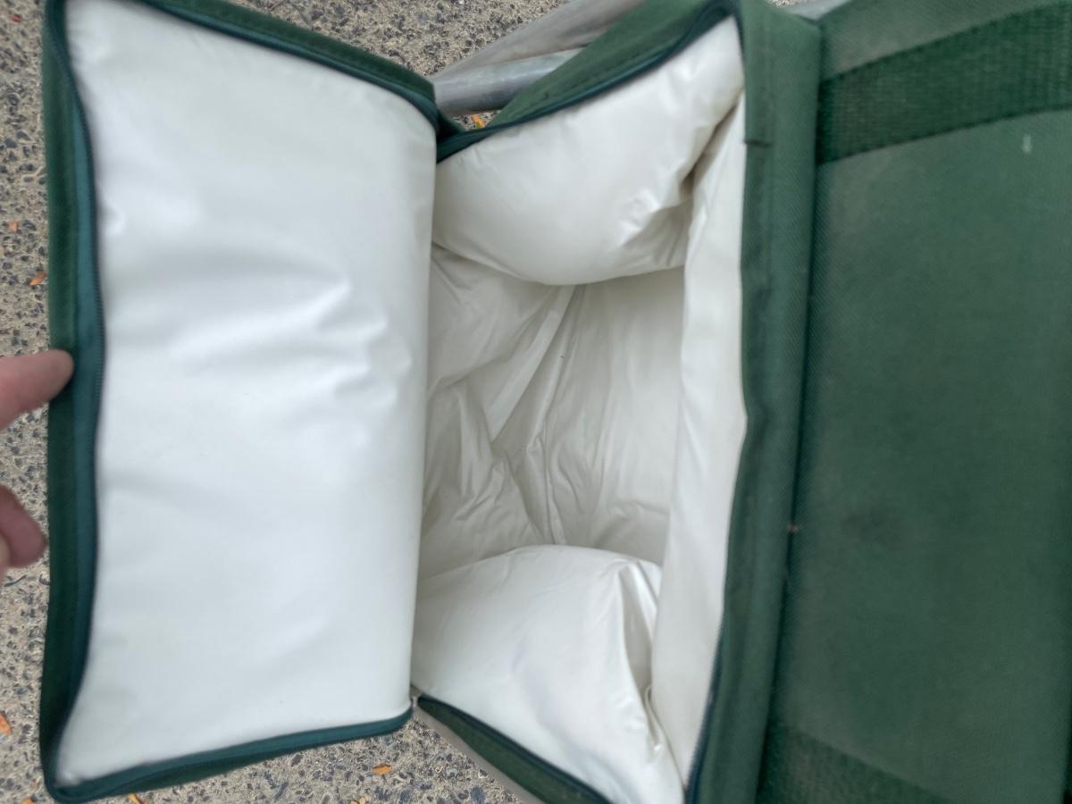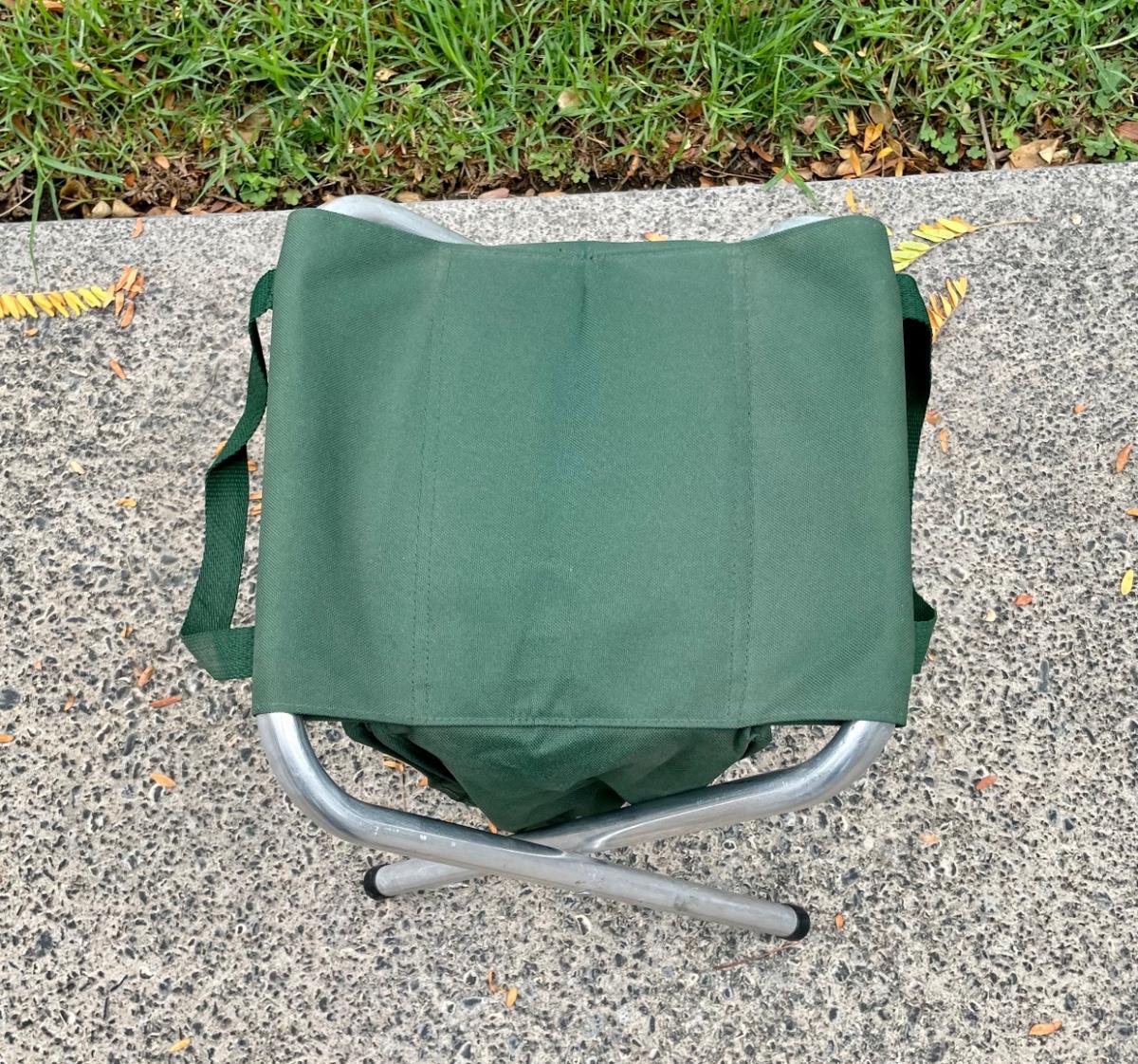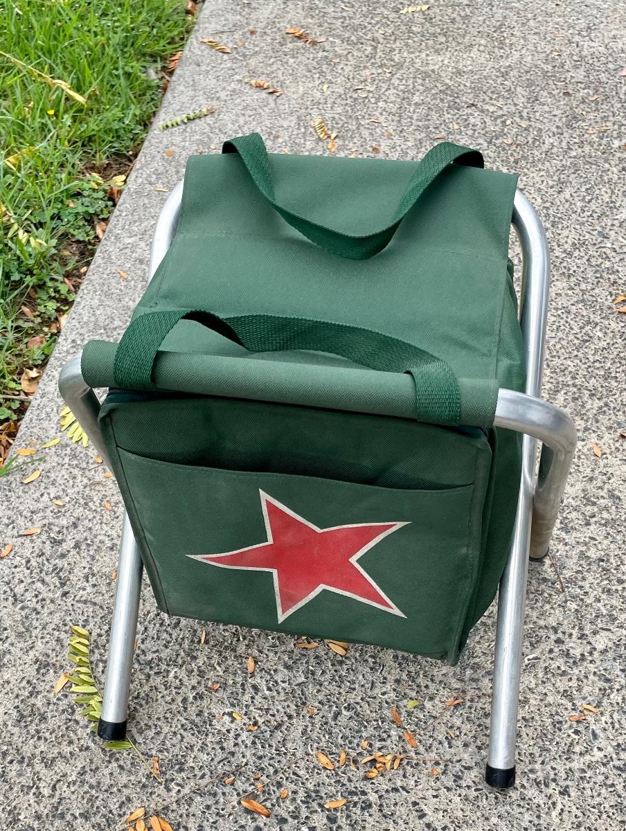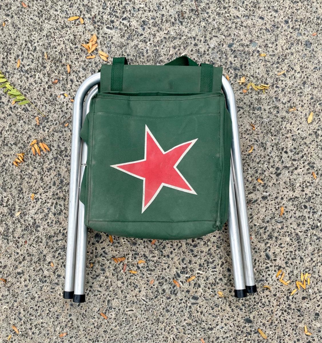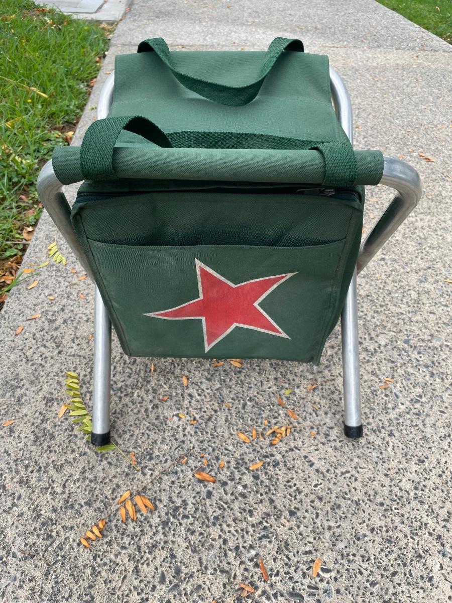 Folding camp-style chair in green ballistic nylon, has a large red star that looks like a Heineken Beer logo. Waterproof Cooler could easily hold a six pack of cans or bottles, and ice.