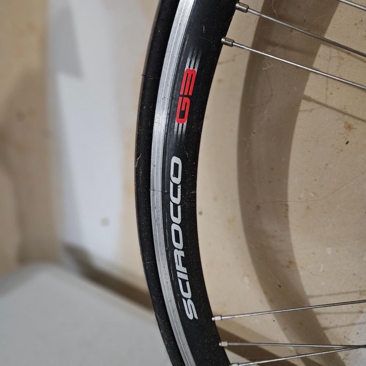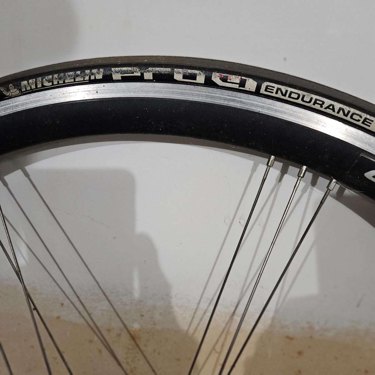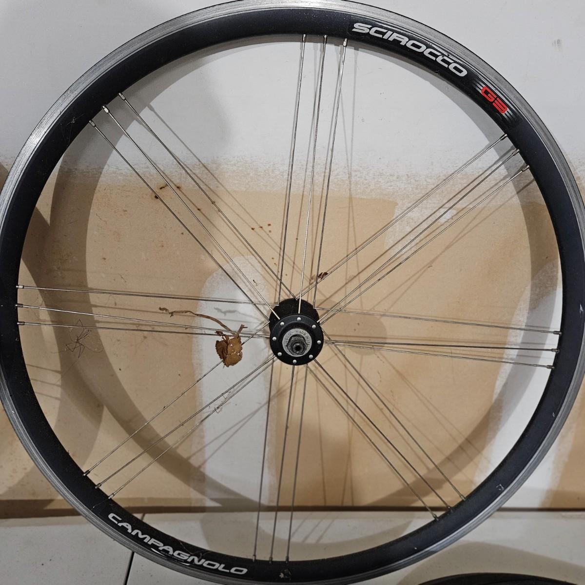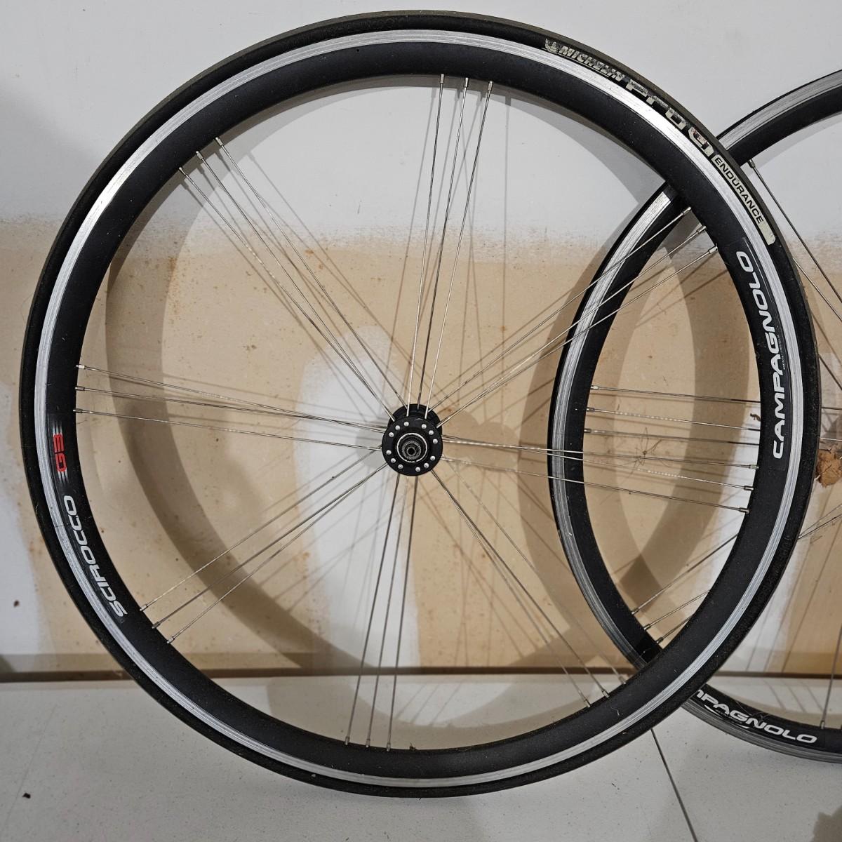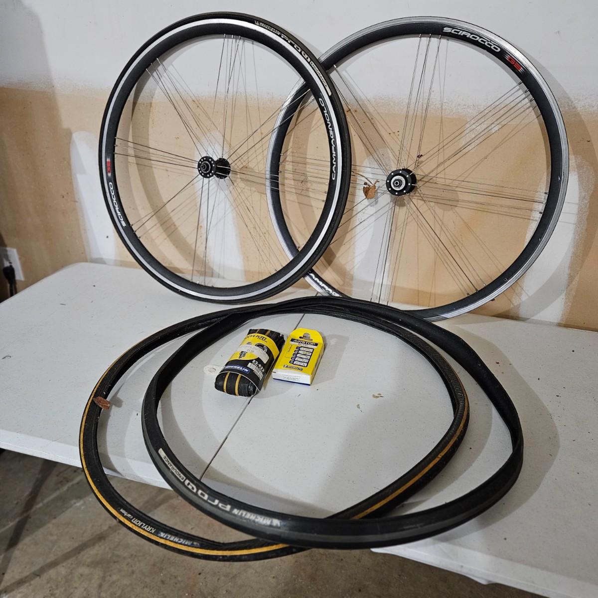 A Campagnolo Scirocco G3 wheels etc that appear to be 700 x 23 and both hubs spin freely. Also includes a Michelin tube, a pair of Michelan Krylion tires and a pair of Michelan Pro 4 Endurance tires. Shipping available