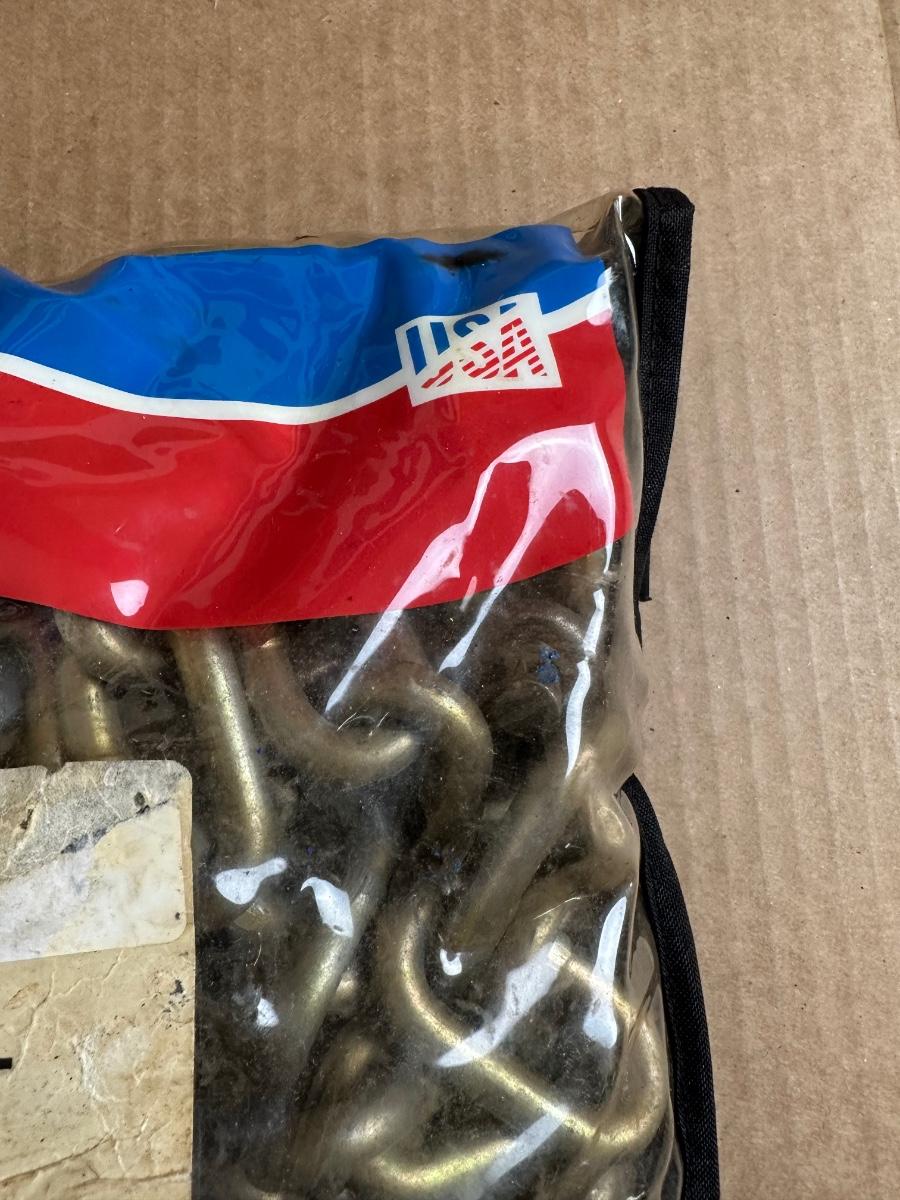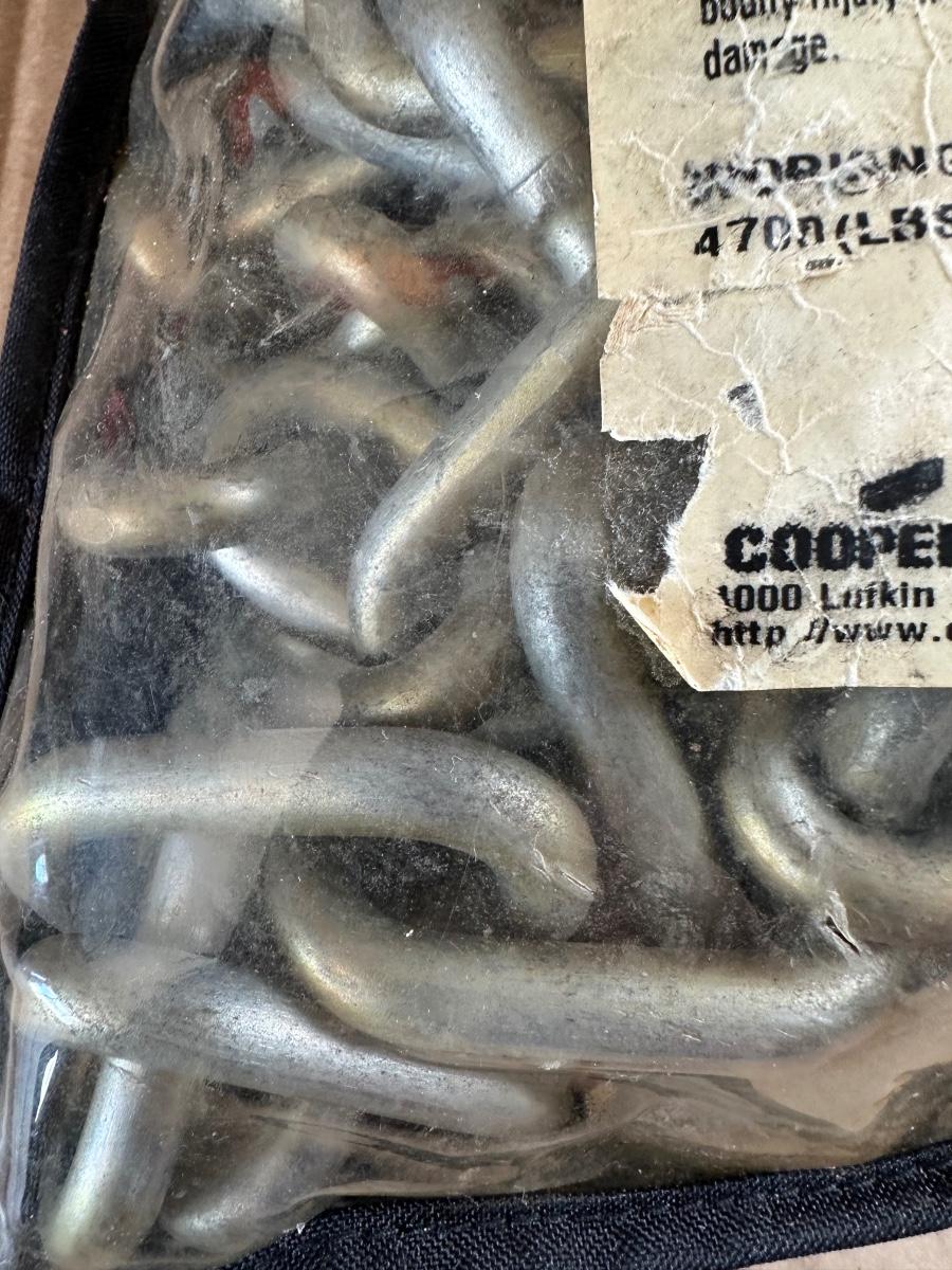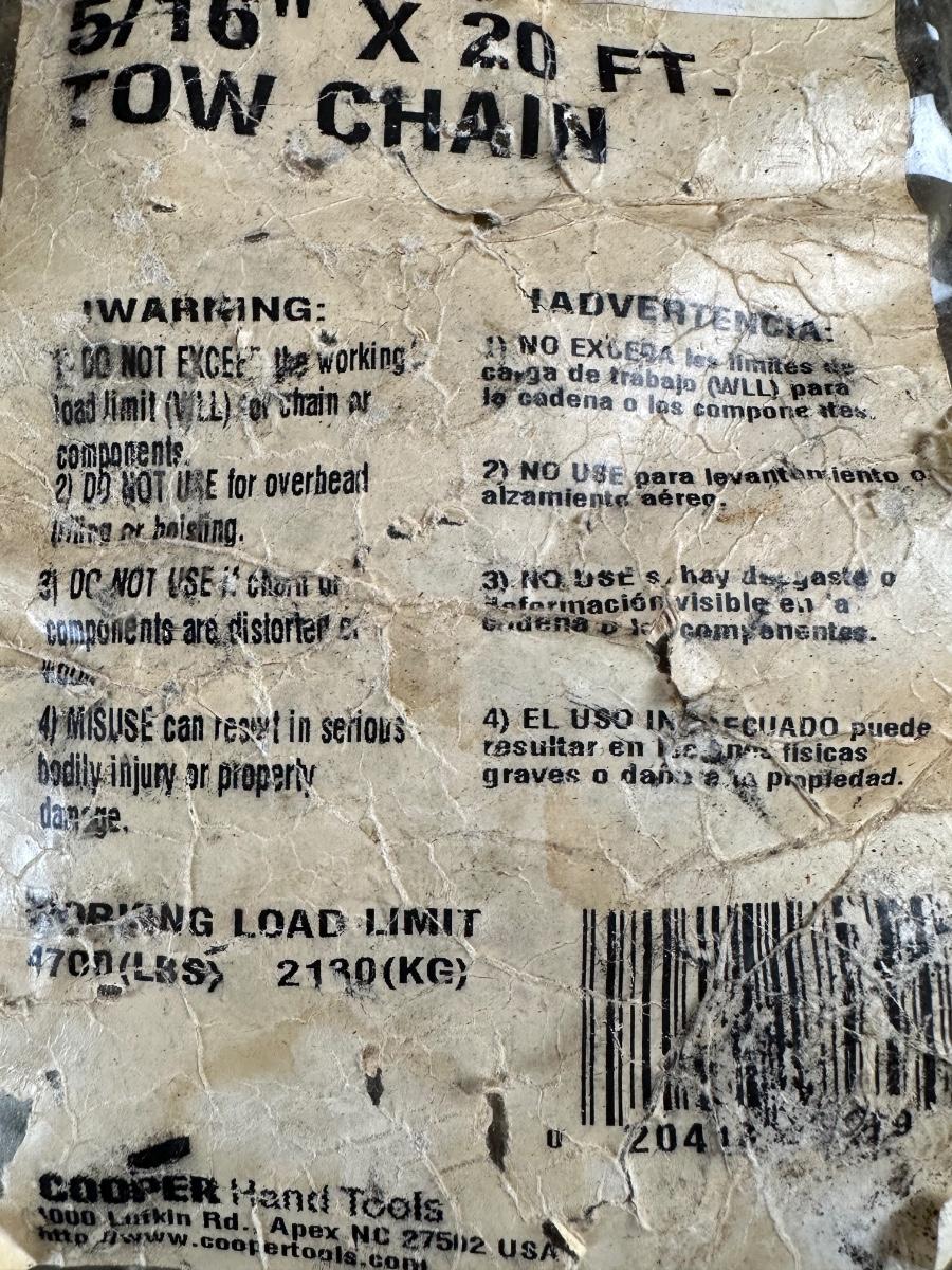 Chain appears unused and is still in the original package (packaging shows wear from storage). Ideal for towing, pulling, farm use, or equipment recovery.