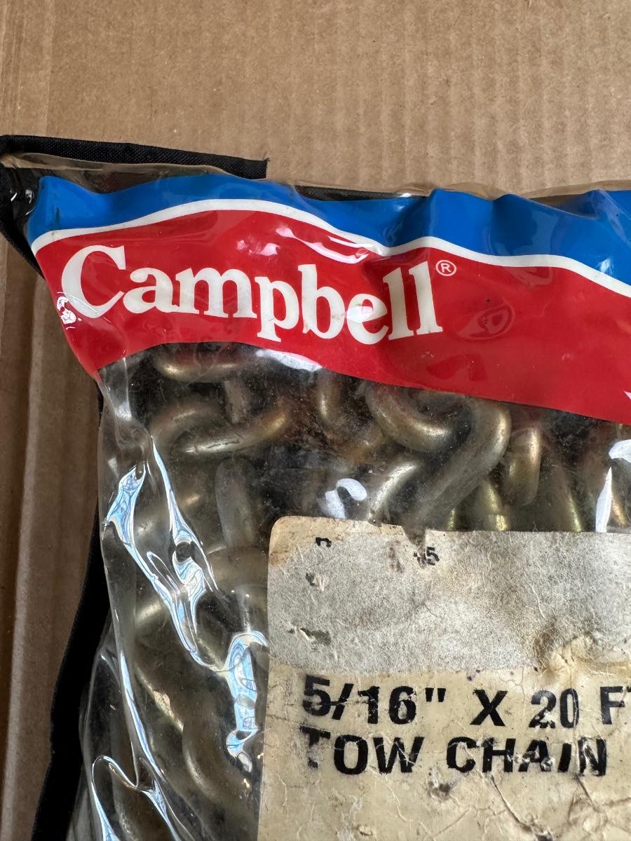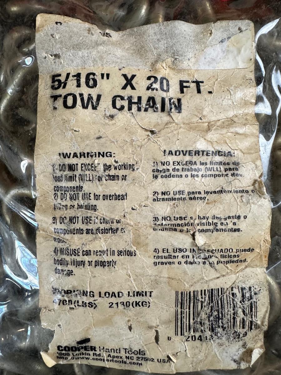 Heavy-duty Campbell tow chain measuring 5/16” diameter x 20 feet long.