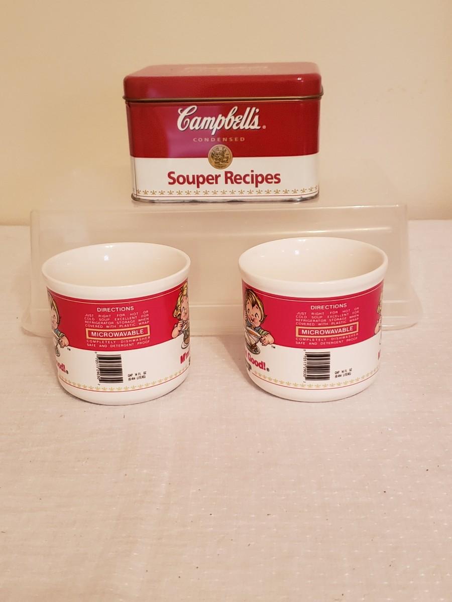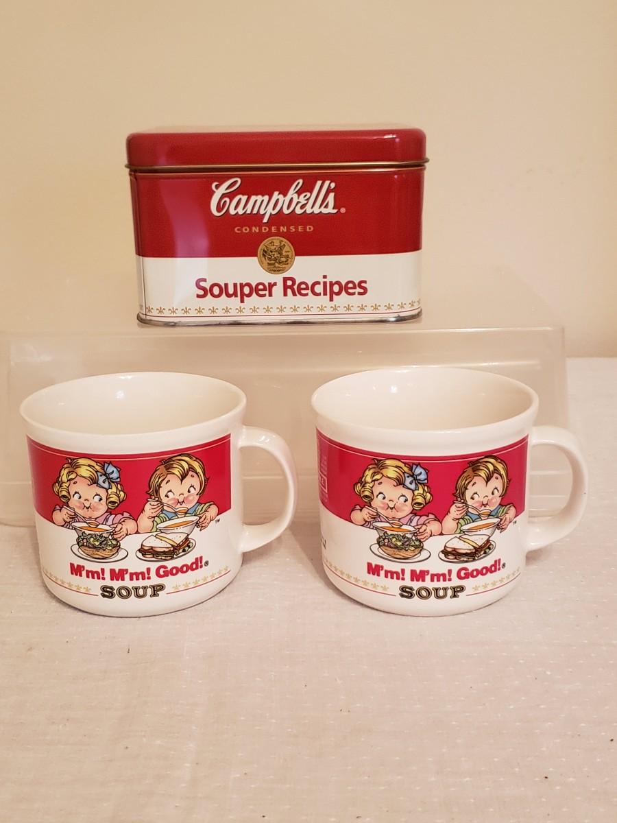 Lot of 3 Campbell's Soup collectibles. 2 14 oz. soup mugs. & 1 recipe tin.
