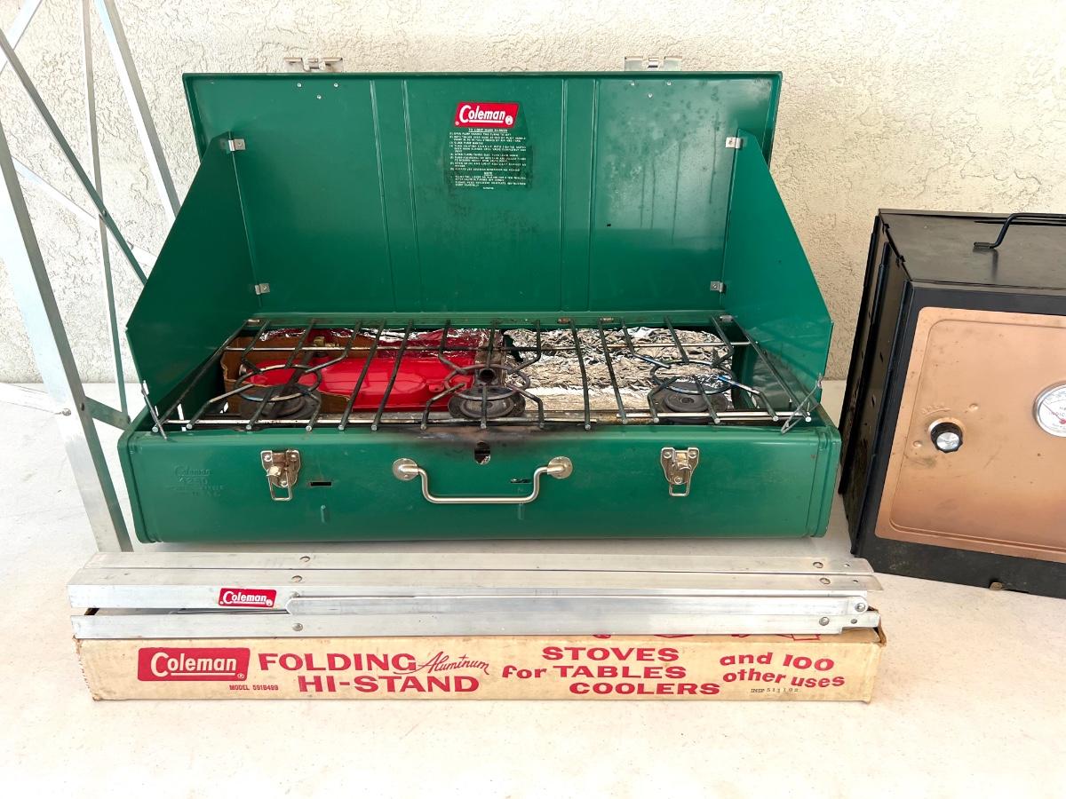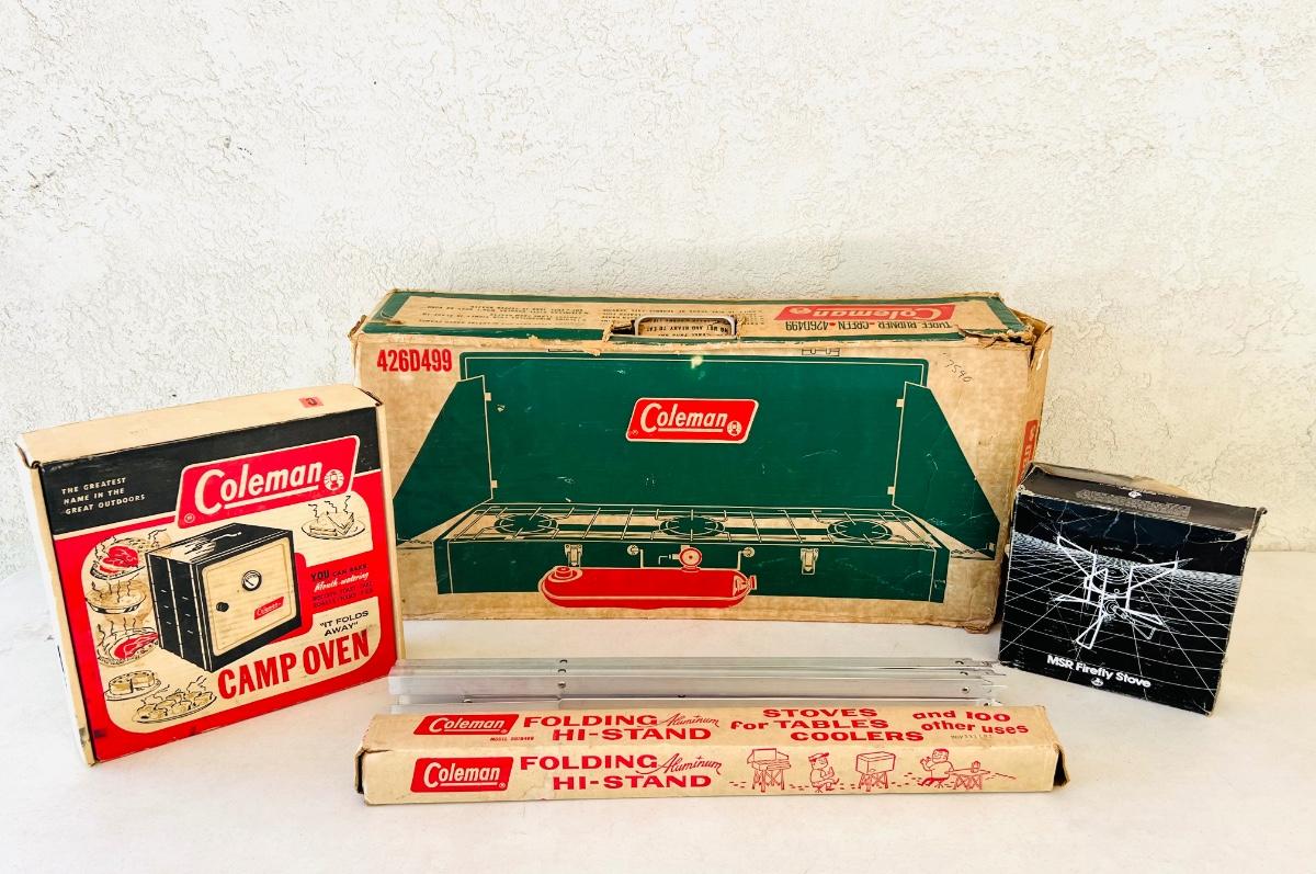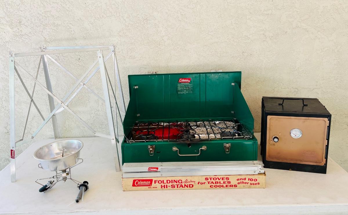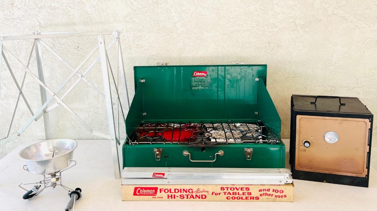 Outdoor Camping Cooking Lot. Comes with a large Coleman camping stove, Camping Oven, MSR Firefly Stove and two folding high stands.