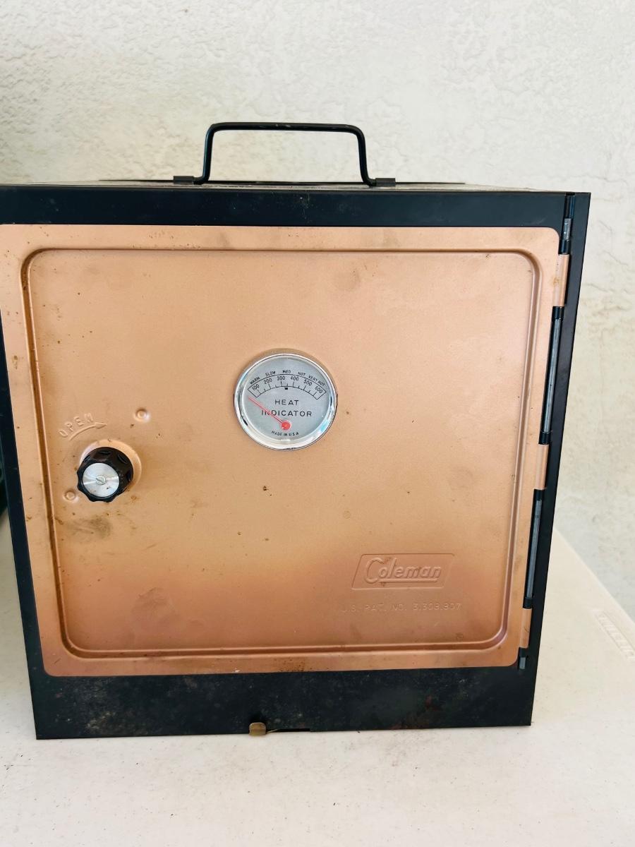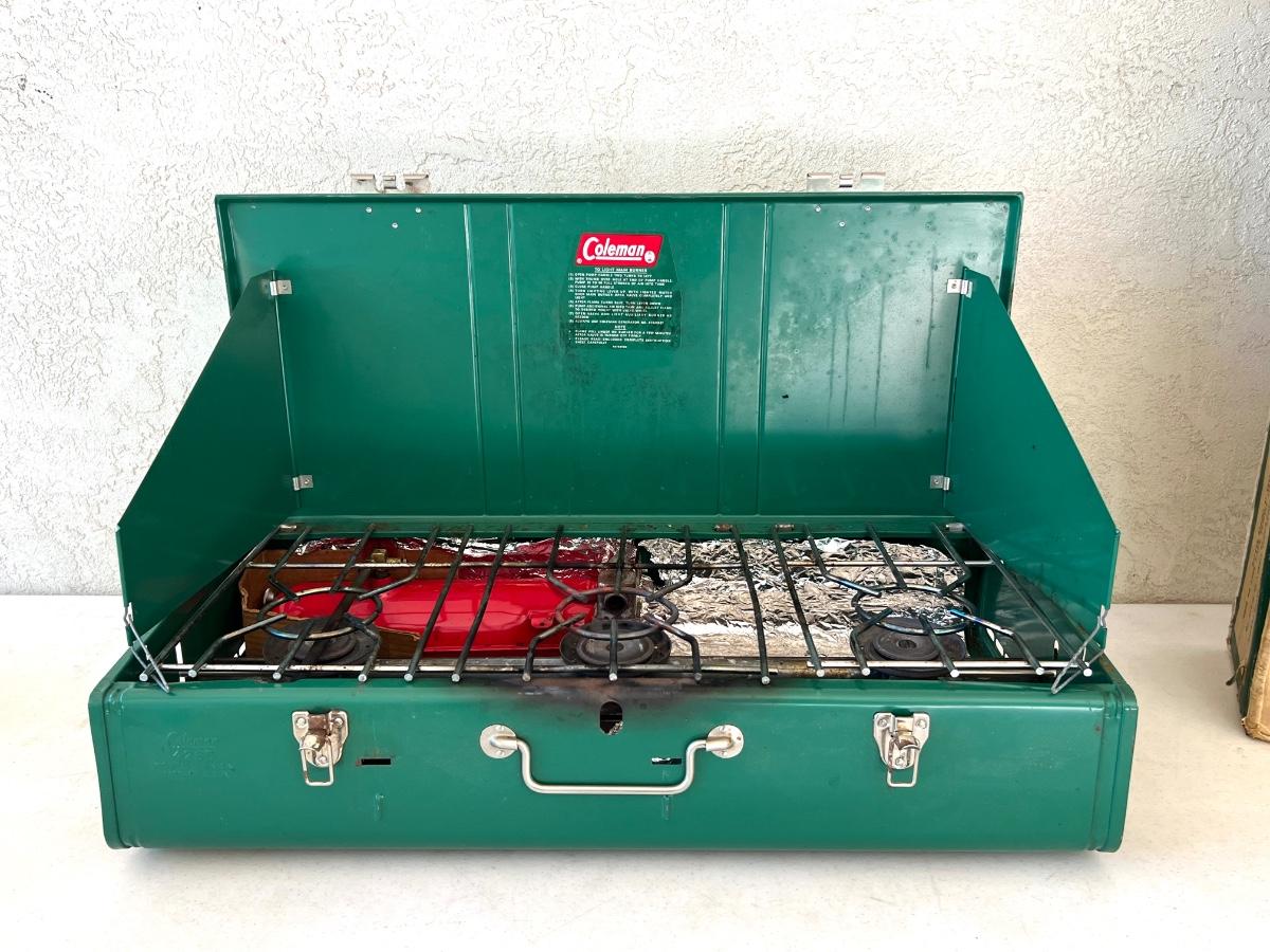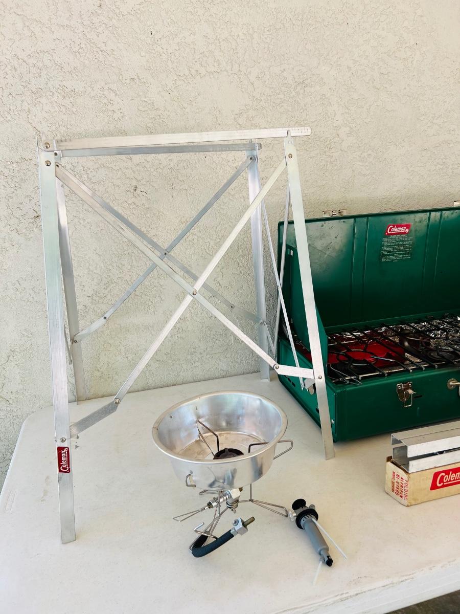 Outdoor Camping Cooking Lot. Comes with a large Coleman camping stove, Camping Oven, MSR Firefly Stove and two folding high stands.