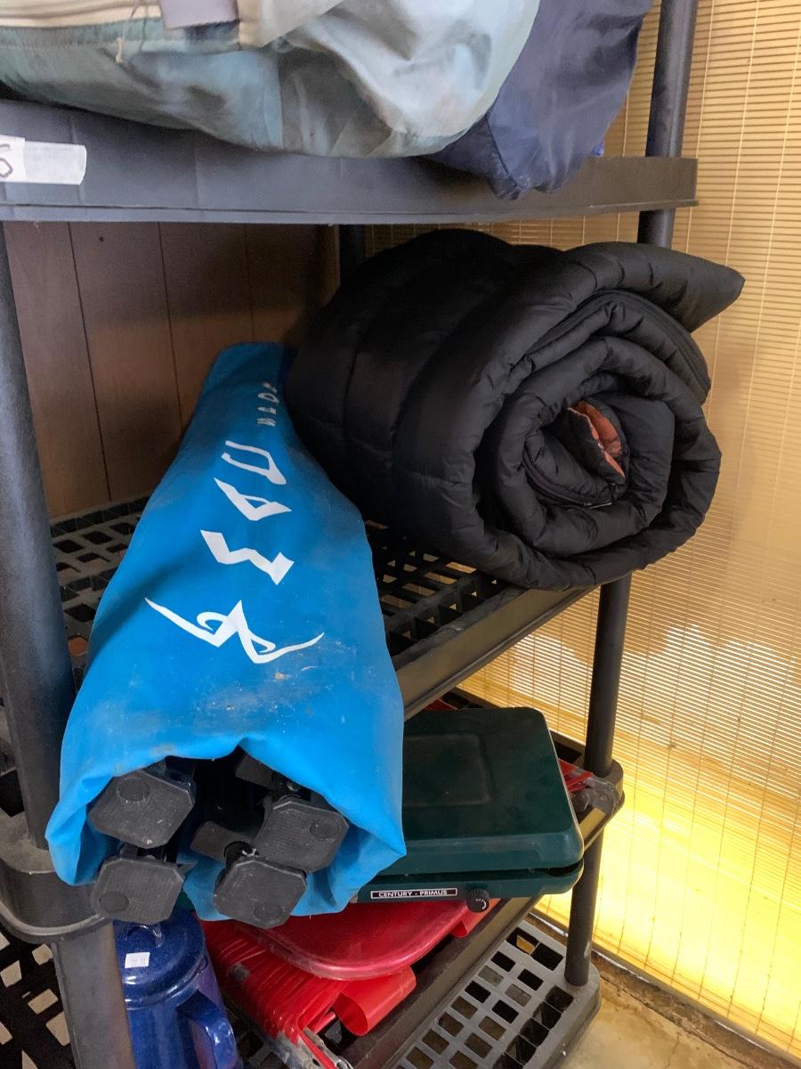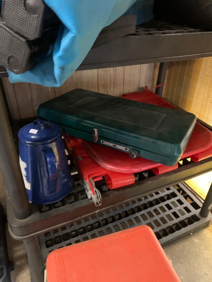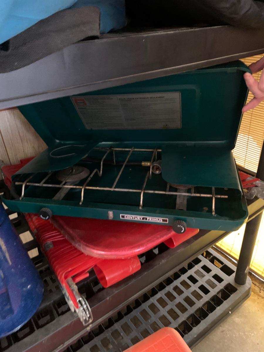 Stove, chair, sleeping bag, tent, air mattresses, coolers