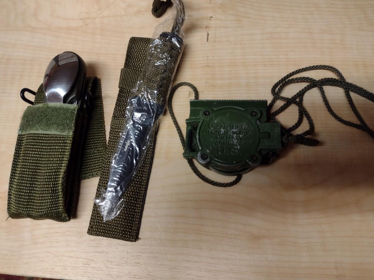Camping Accessories. Utensil set, small cutlery in sheath, and compass in metal case. Please see all pictures - some hazing/fogginess to lens of compass. PLEASE NOTE:. Due to no internet connection or wireless service, all invoices must be prepaid via PayPal, Stripe, or Zelle prior to arrival at pick up. Exact change cash onsite is acceptable but absolutely no debit or credit cards at time of pick up.