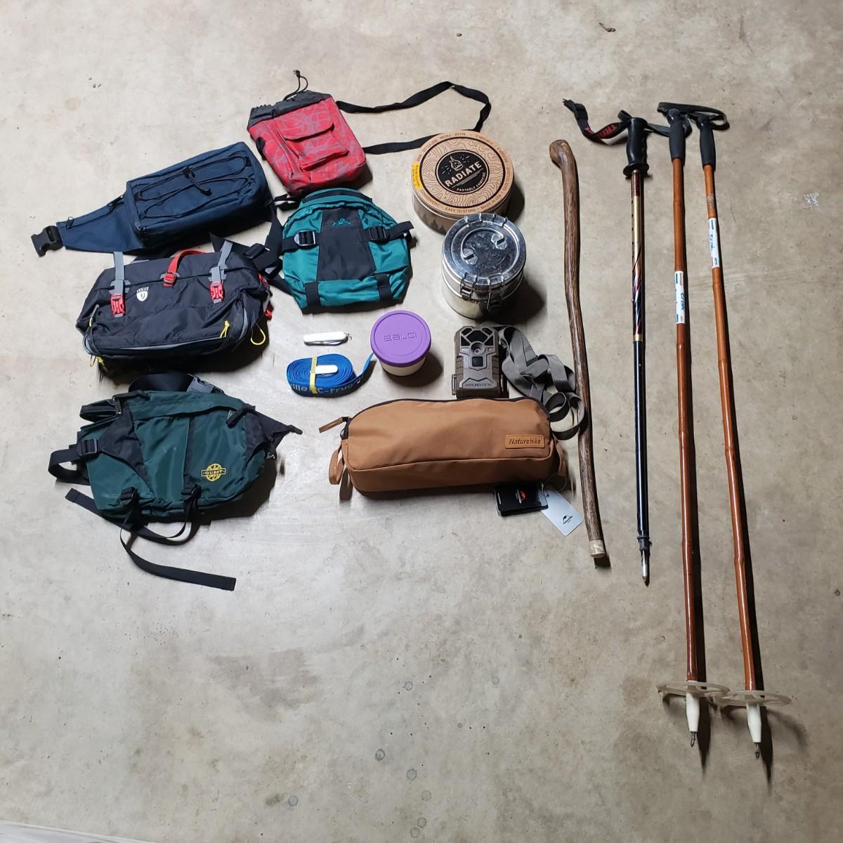 This is a camping/hiking lot, just in time for Spring! There are multiple hip packs, to store your water, Swiss Army knife and some snacks in the soft sided Balci storage container. Use the Trek poles (50") and the Naturehike collapsible chair to relax once you get to that favorite spot! The chair measures 21" x 24" x 29"H with a seat height of 14".