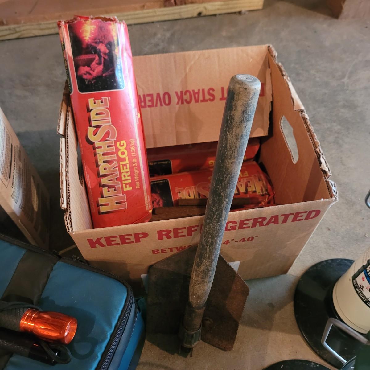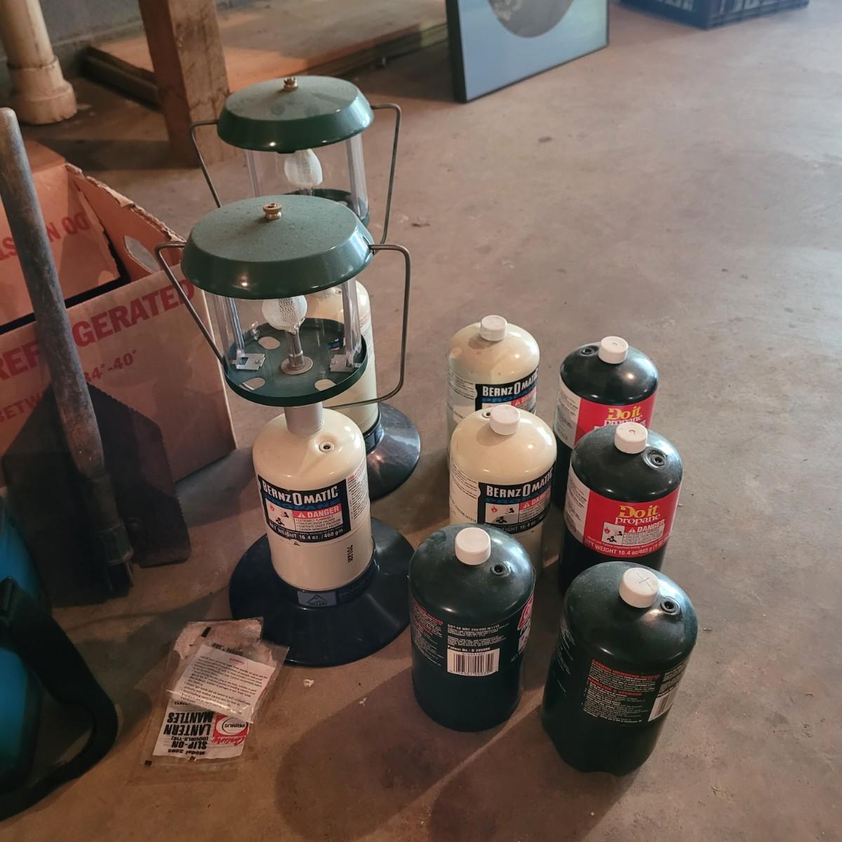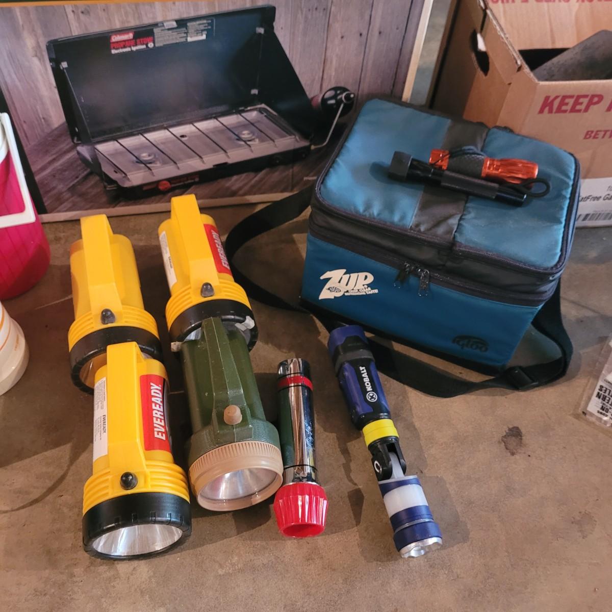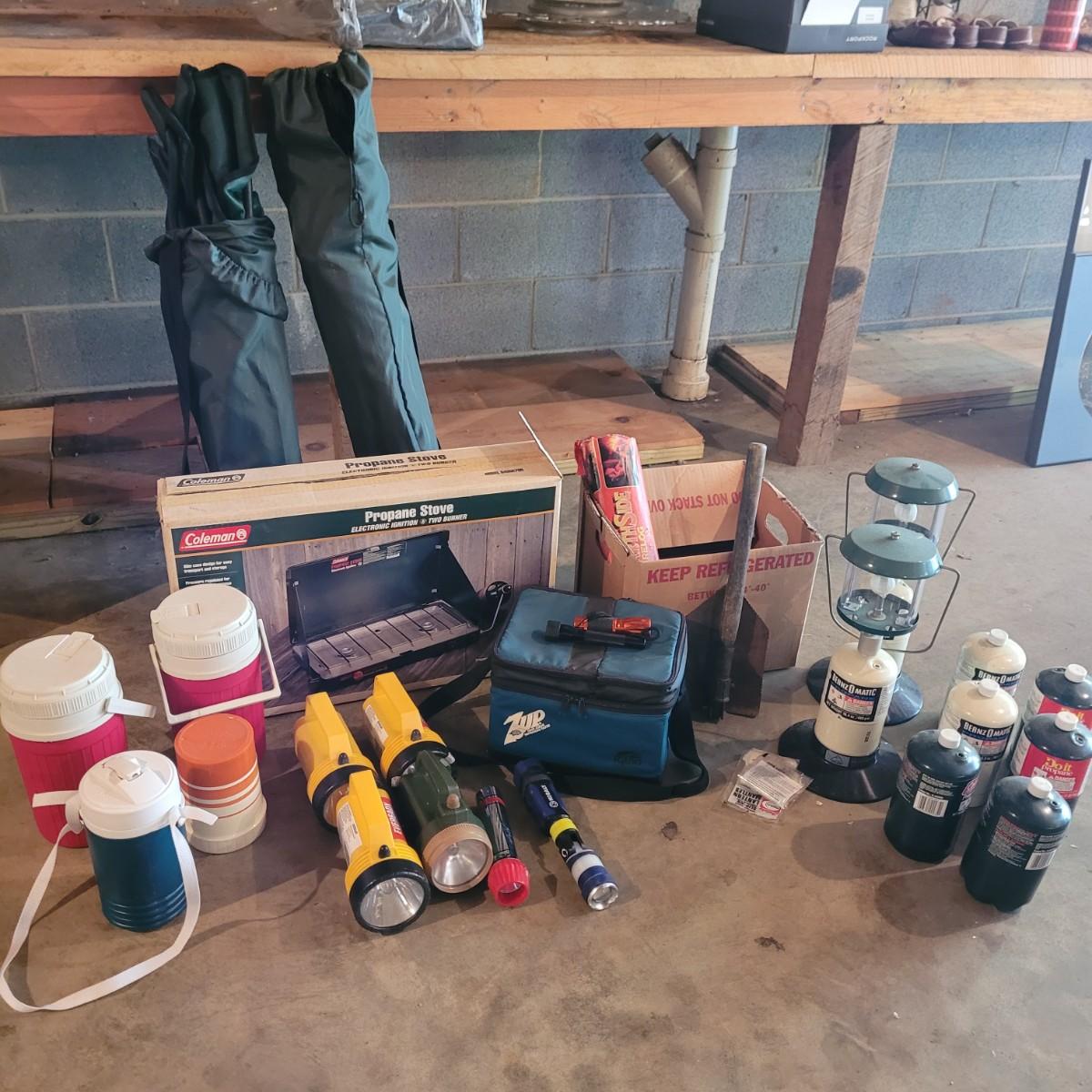 A very useful lot for outdoor and camping items, including a Coleman propane stove with extra fuel tanks (we cannot verify contents), two propane lanterns, large and small flashlights, trenching tool, firelogs, thermoses, small cooler and two camping chairs. Local pickup only.