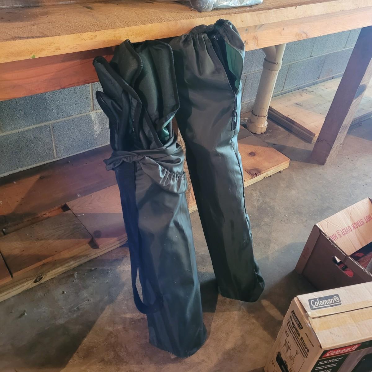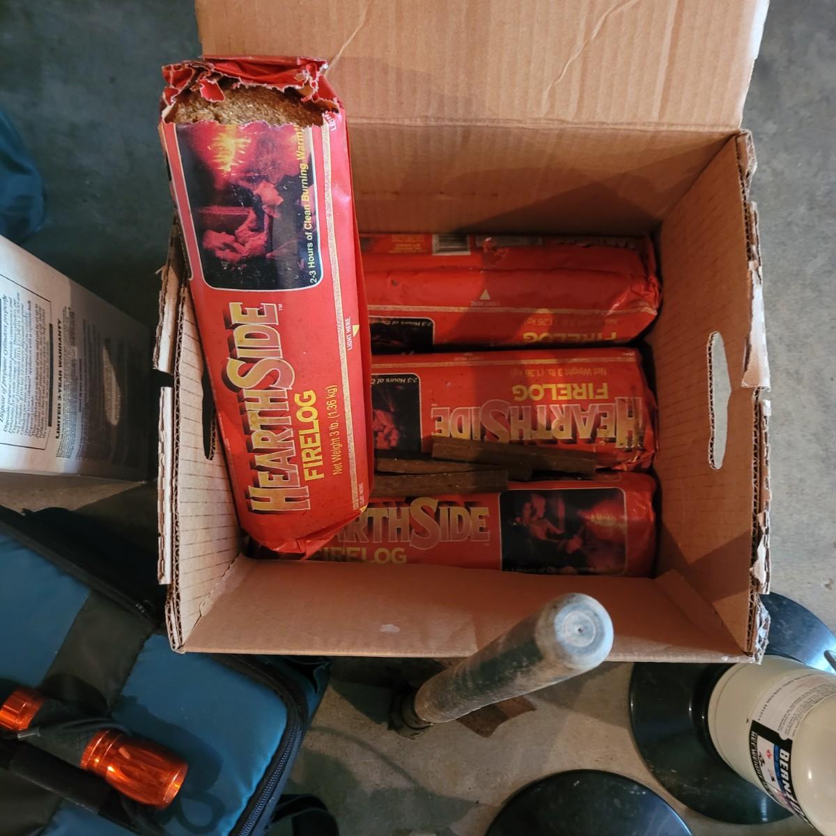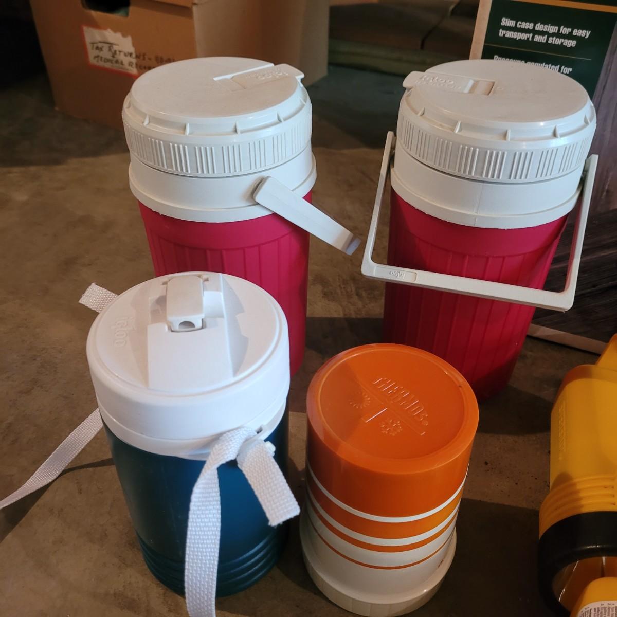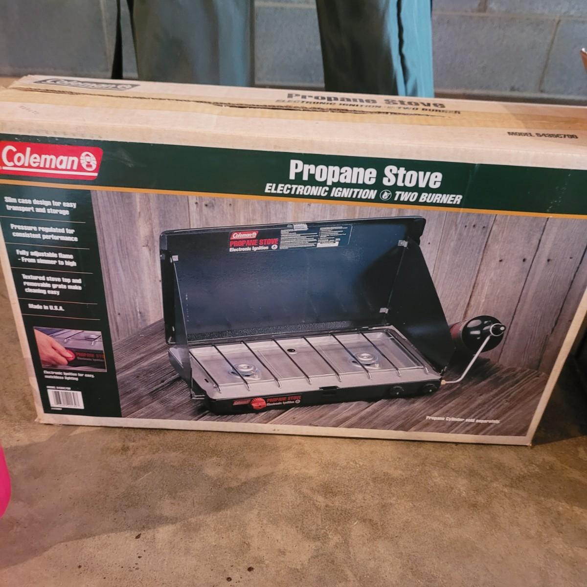 A very useful lot for outdoor and camping items, including a Coleman propane stove with extra fuel tanks (we cannot verify contents), two propane lanterns, large and small flashlights, trenching tool, firelogs, thermoses, small cooler and two camping chairs. Local pickup only.