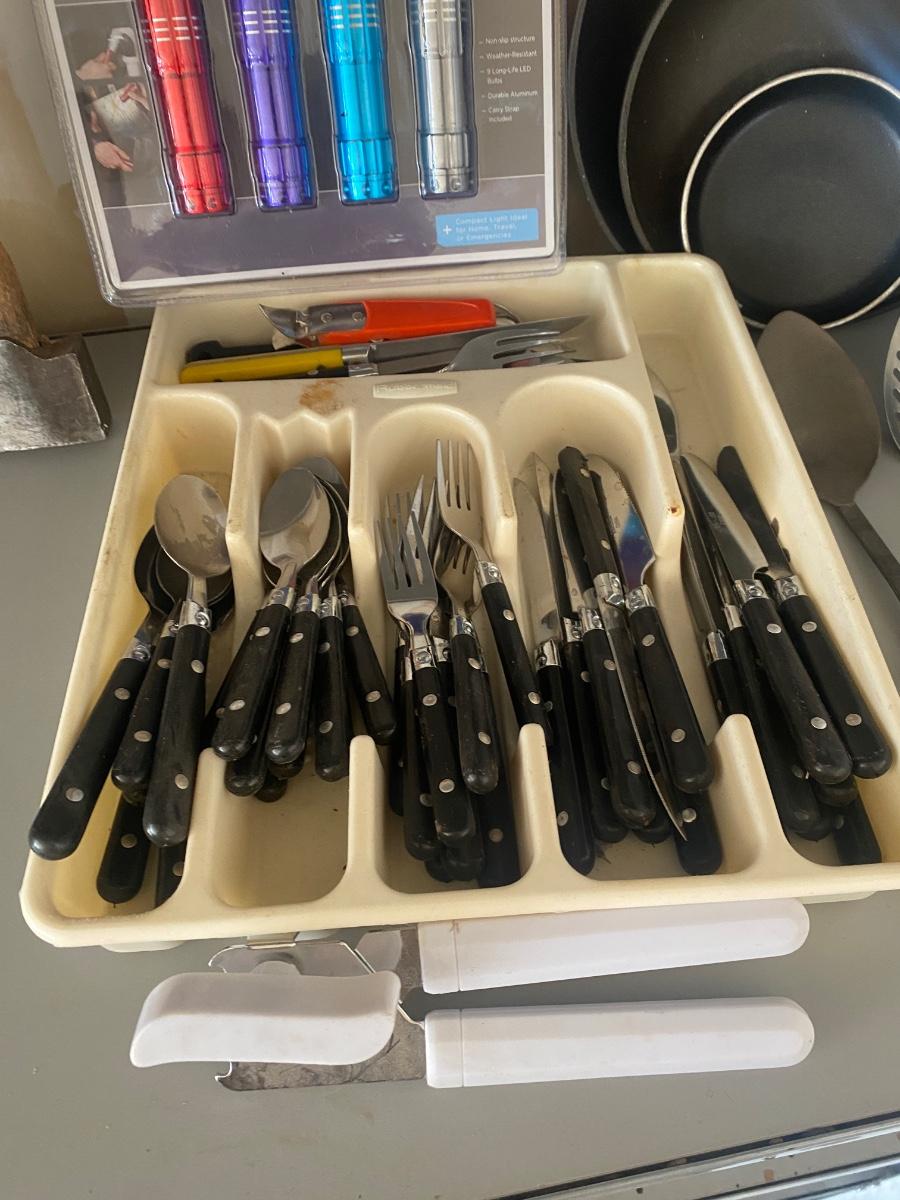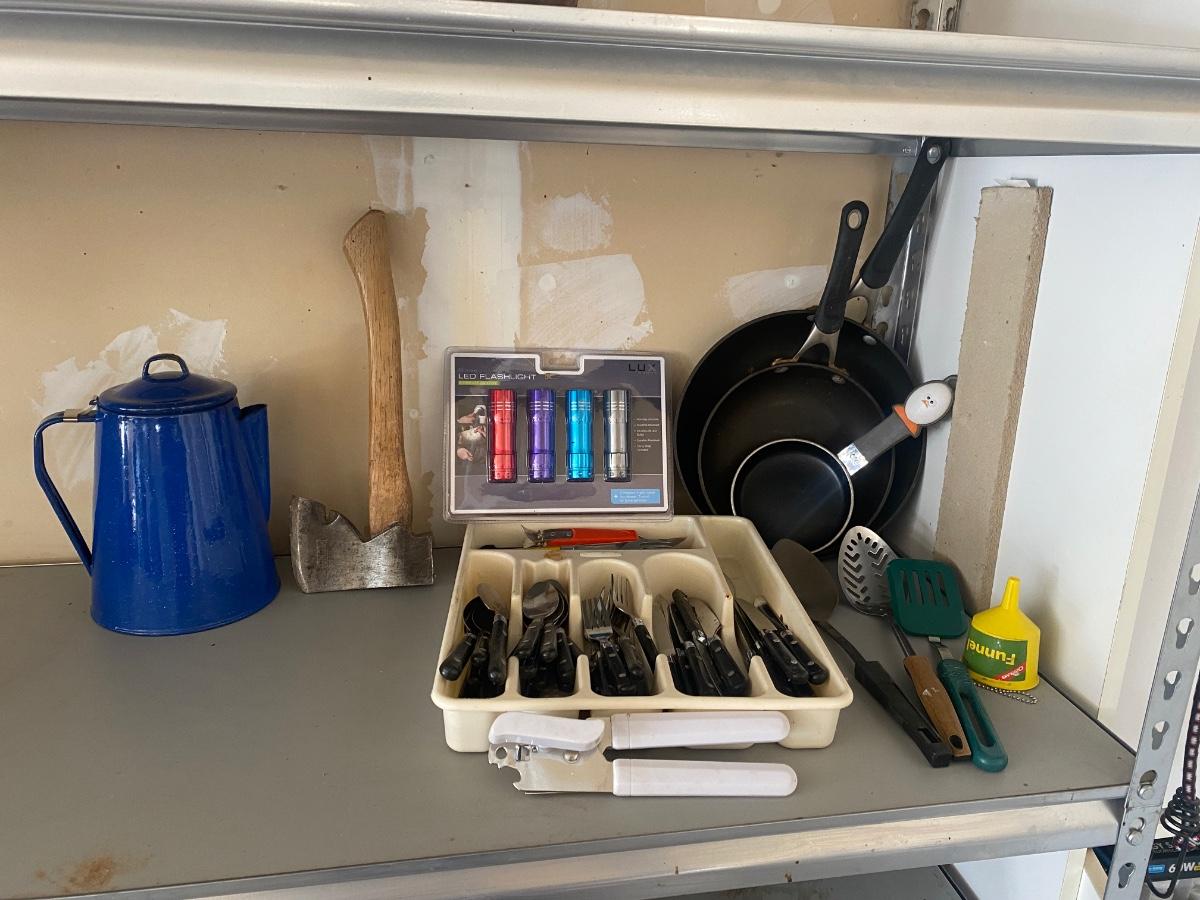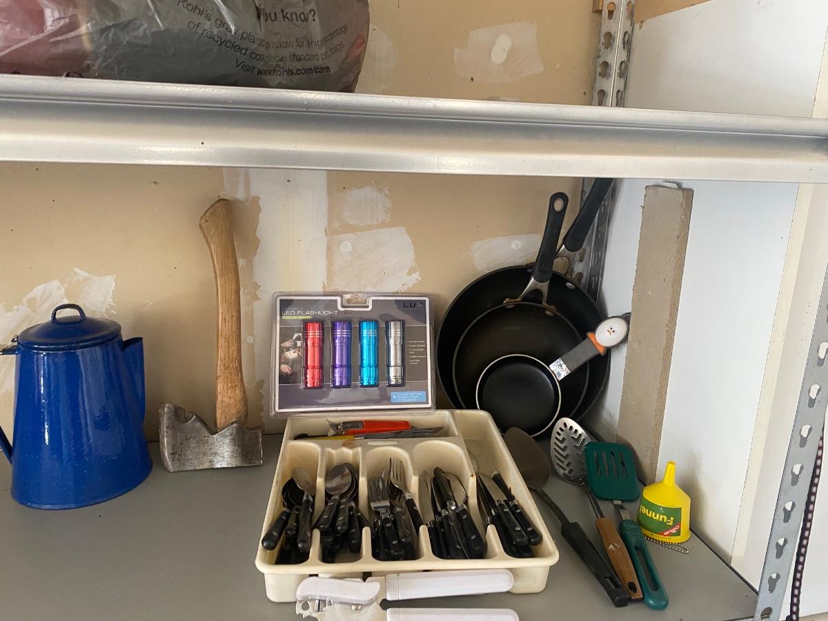 CAMPING COOKWARE, FLATWARE, FLASHLIGHTS M, COFFEE MAKER/PERCOLATOR HATCHET AND OTHER GOODIES!