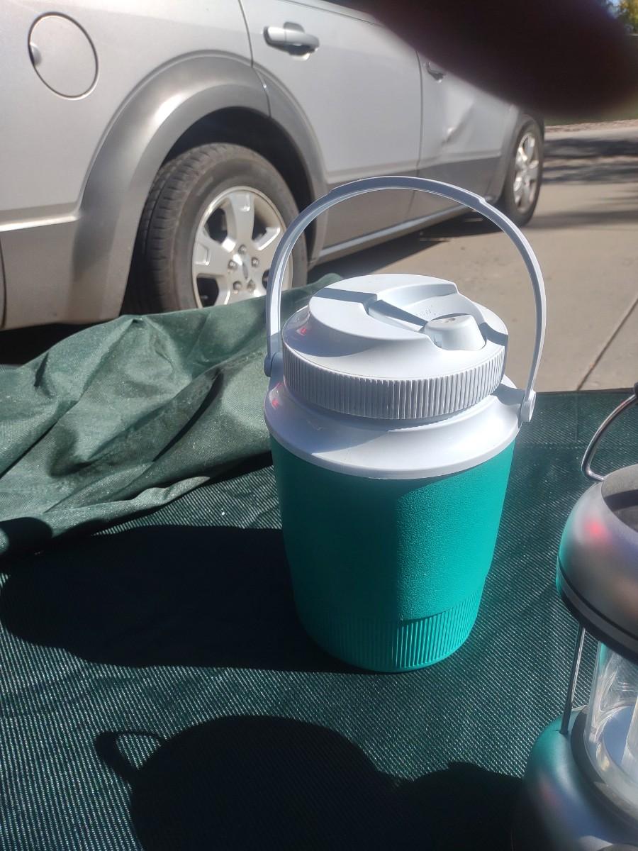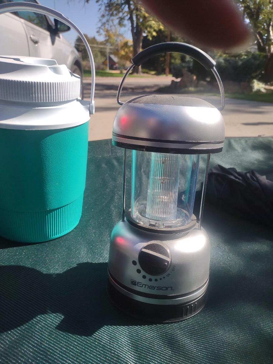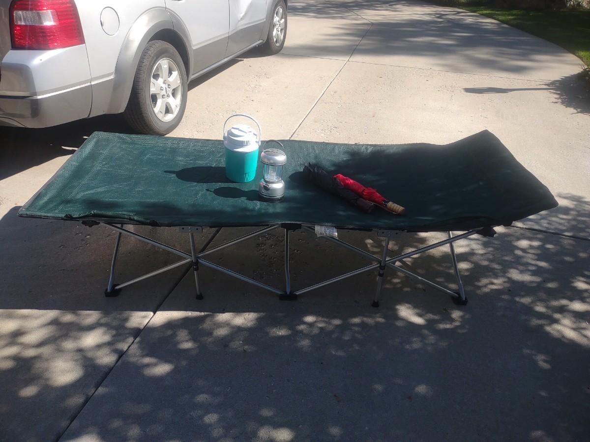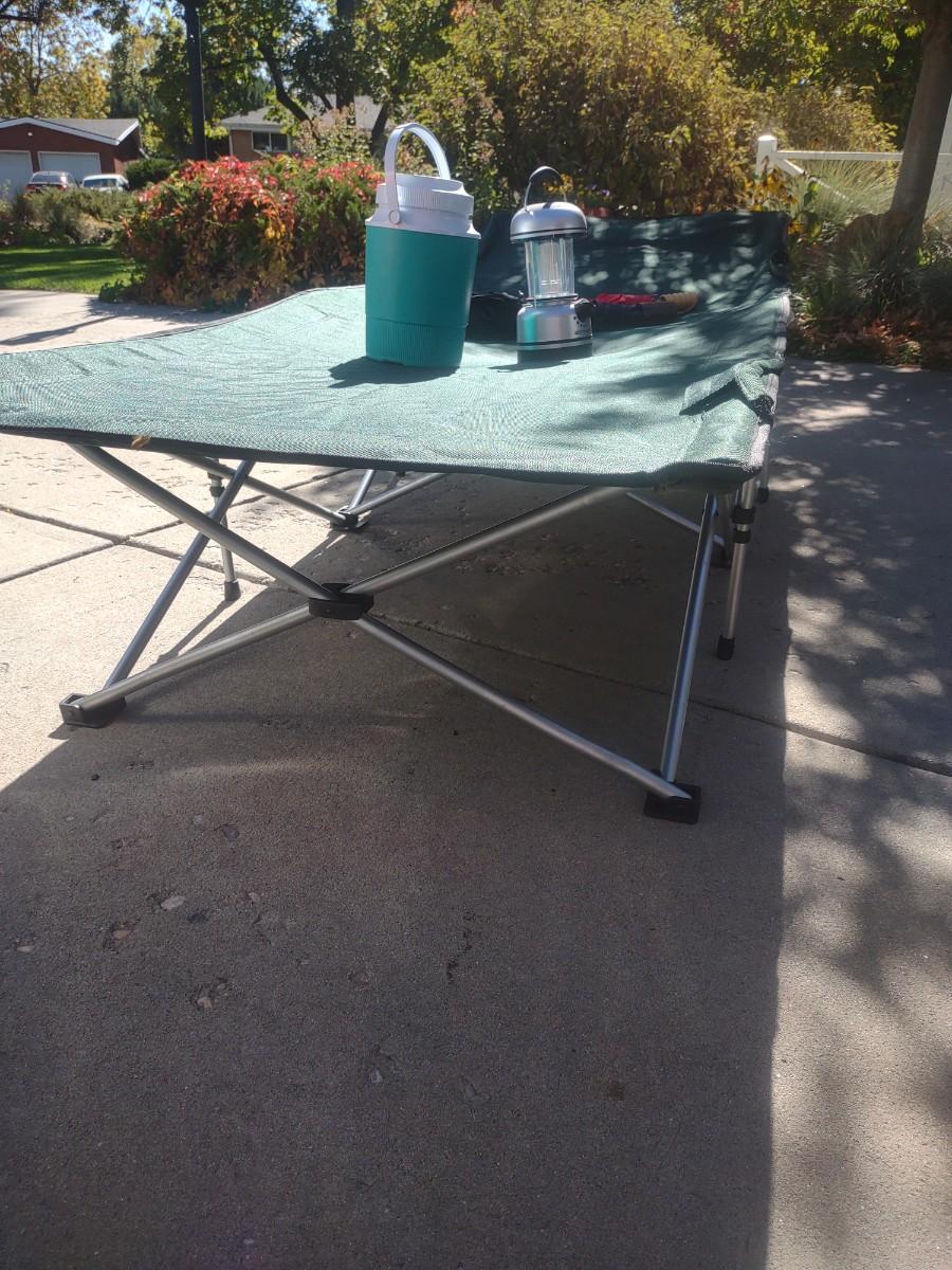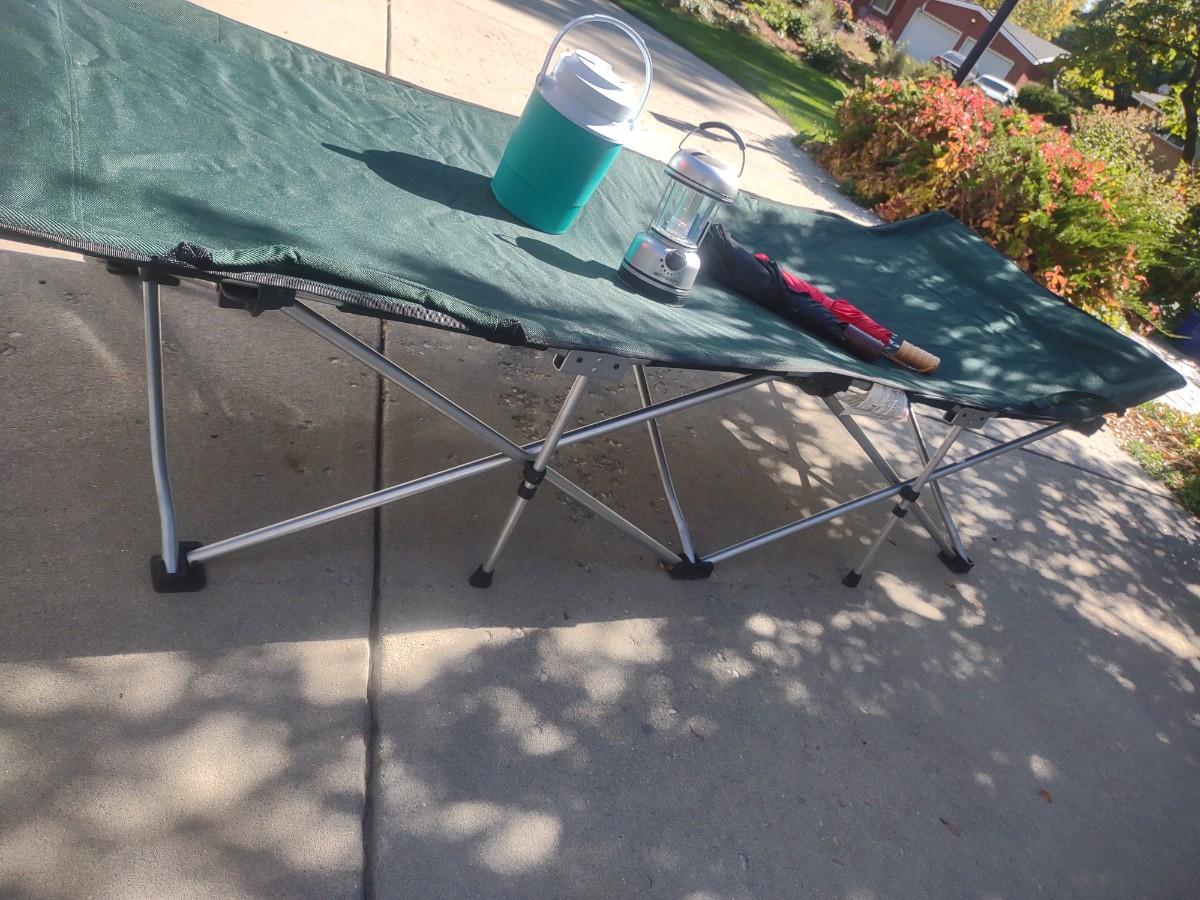 CAMPING COT, BEVERAGE COOLER, LANTERN AND UMBRELLA