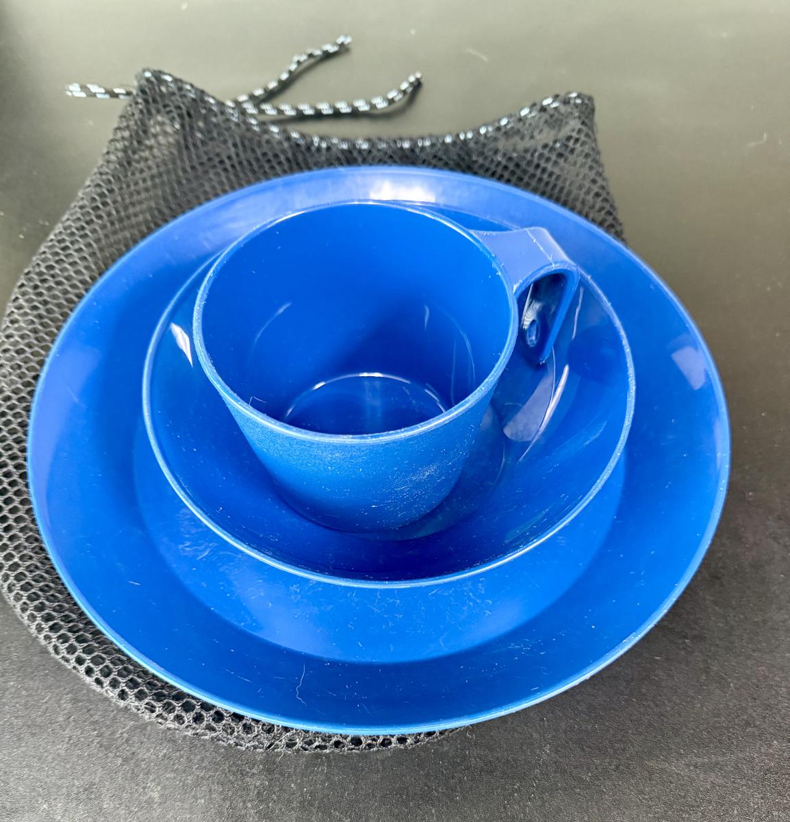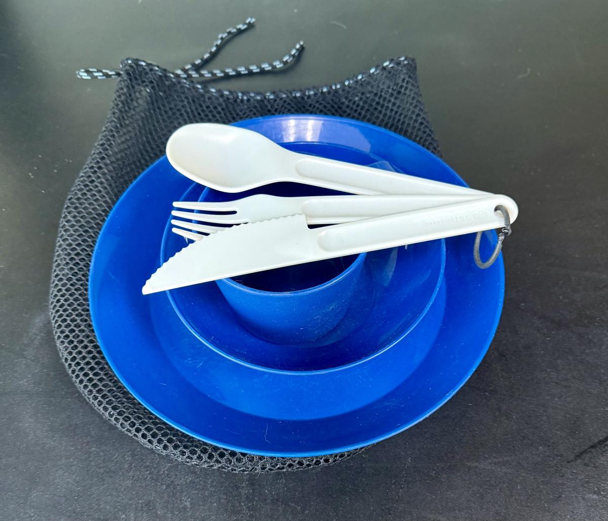 Includes 10” plate, bowl, cup and utensils. Mesh storage bag included. Good used condition,