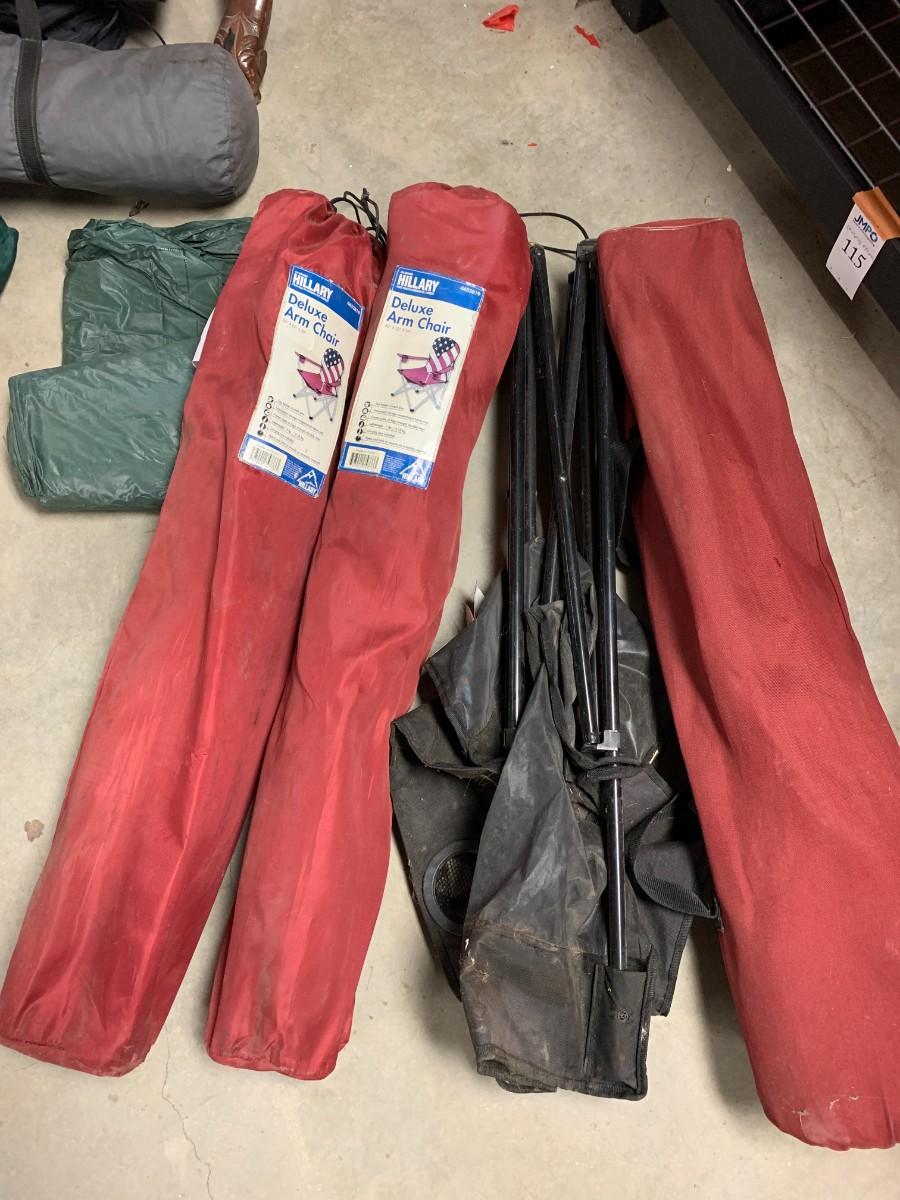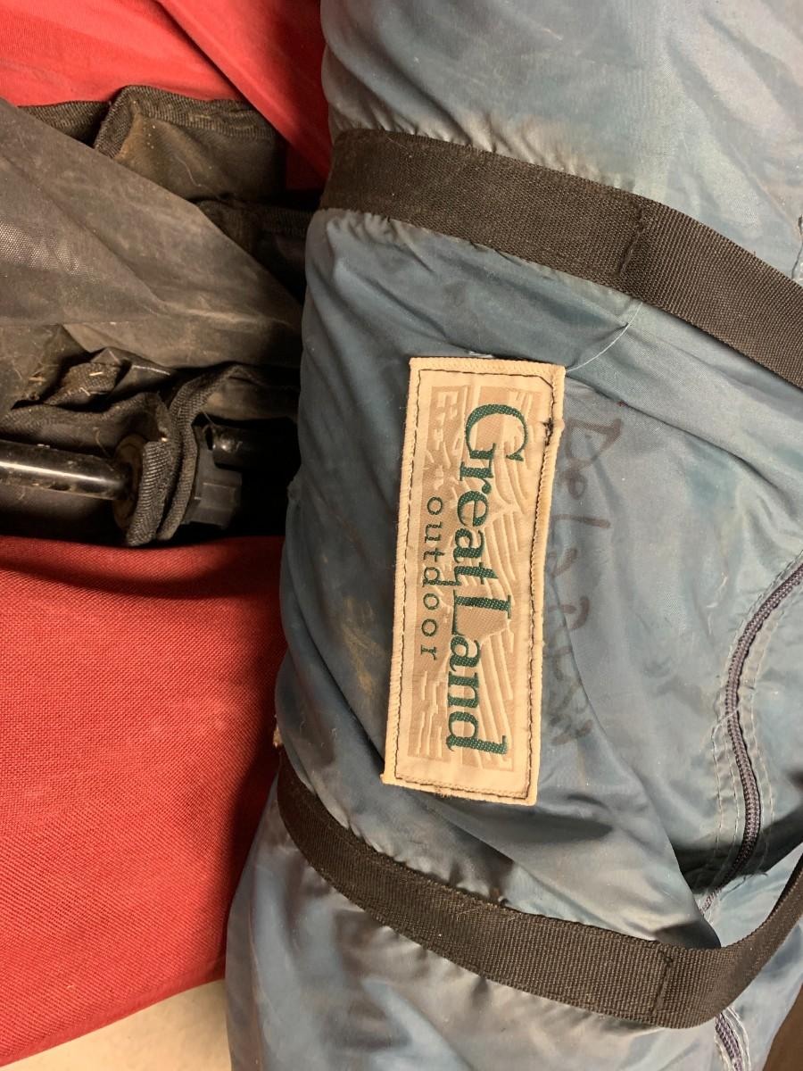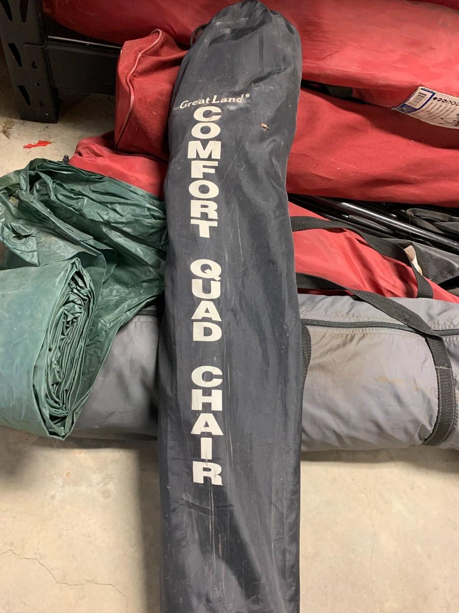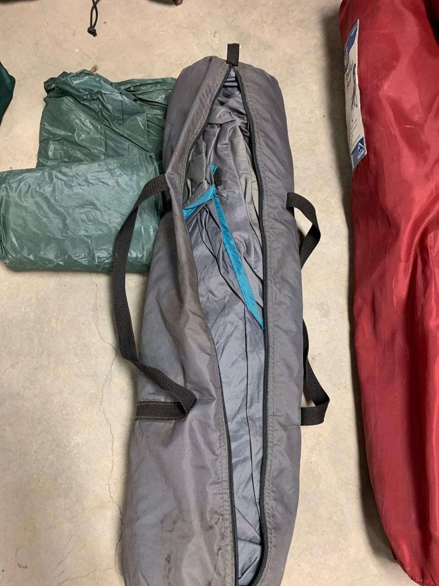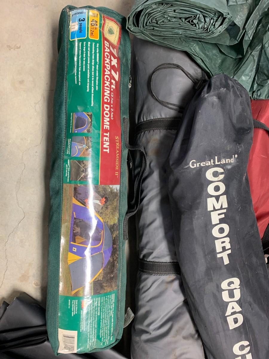 Camping and outdoor equipment. 9ft market umbrella in case. 10x10ft red nylon pop-up canopy in case. 4 Folding chairs with cases. 1 camp chair with no case. Large clean tarp. 7x7ft backpacking dome Tent. Greatland nylon tent in bag, size unknown. Roof bag for automobile transportation.