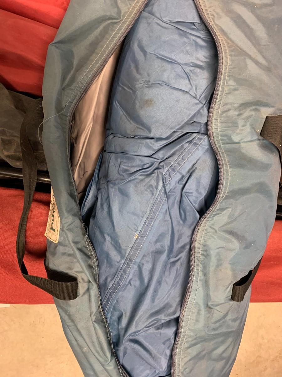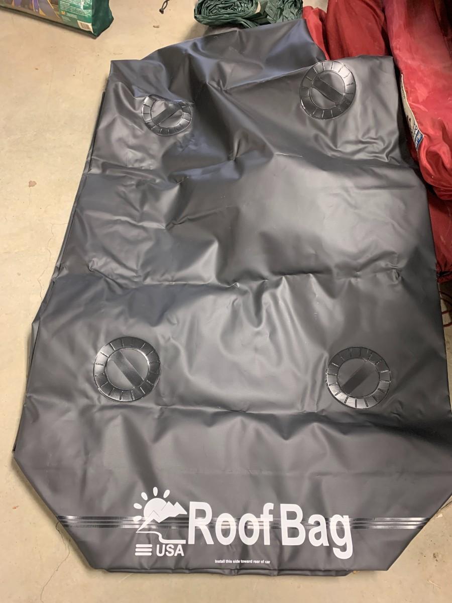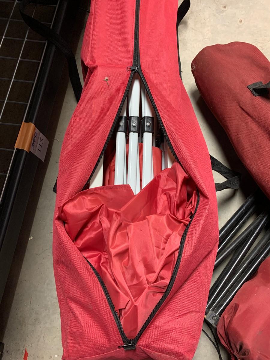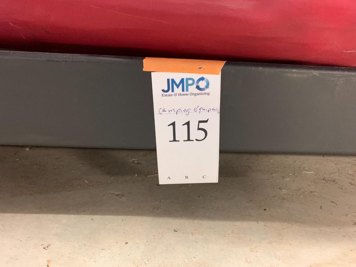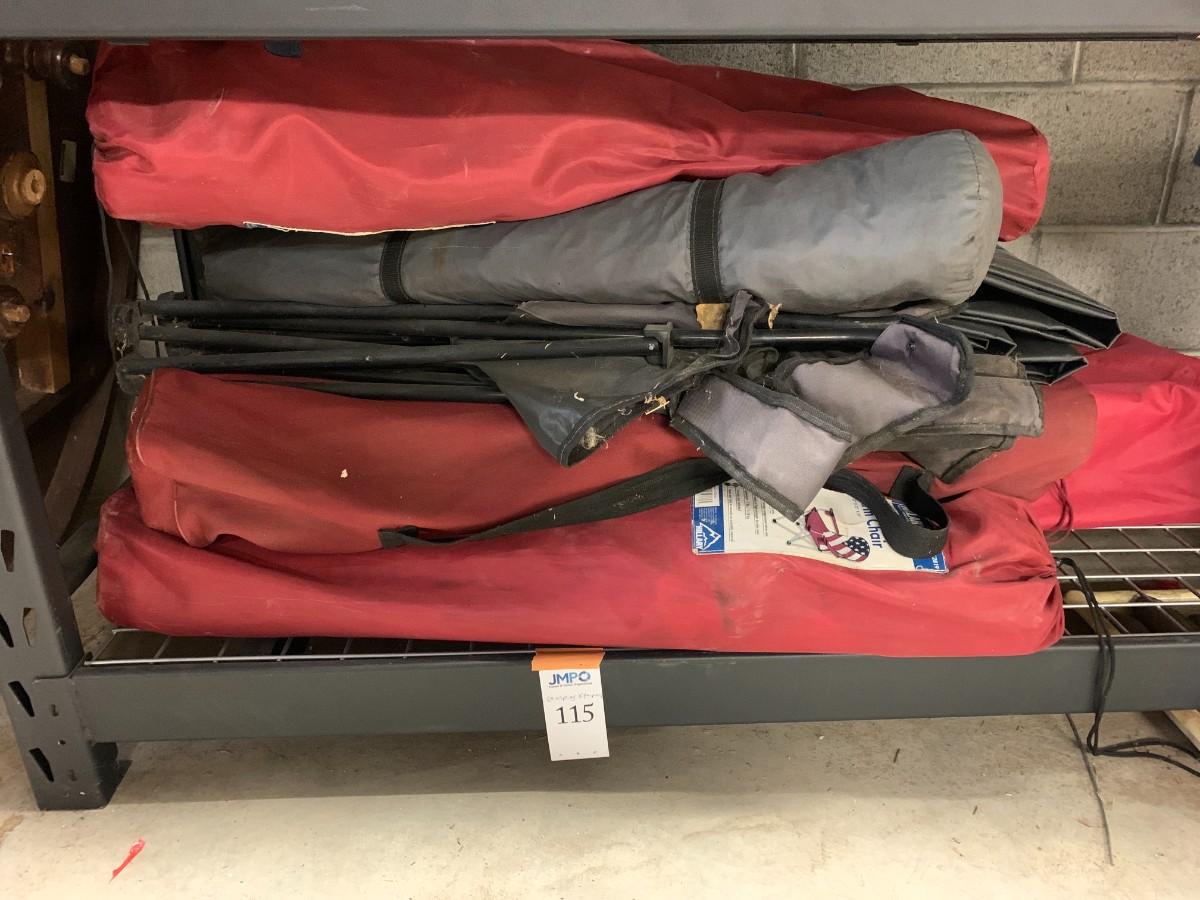 Camping and outdoor equipment. 9ft market umbrella in case. 10x10ft red nylon pop-up canopy in case. 4 Folding chairs with cases. 1 camp chair with no case. Large clean tarp. 7x7ft backpacking dome Tent. Greatland nylon tent in bag, size unknown. Roof bag for automobile transportation.