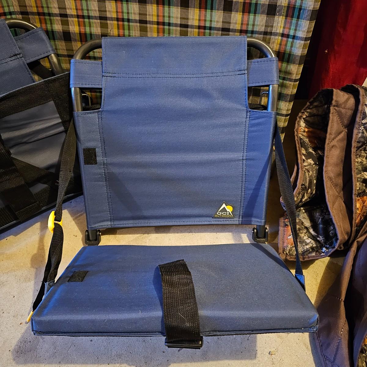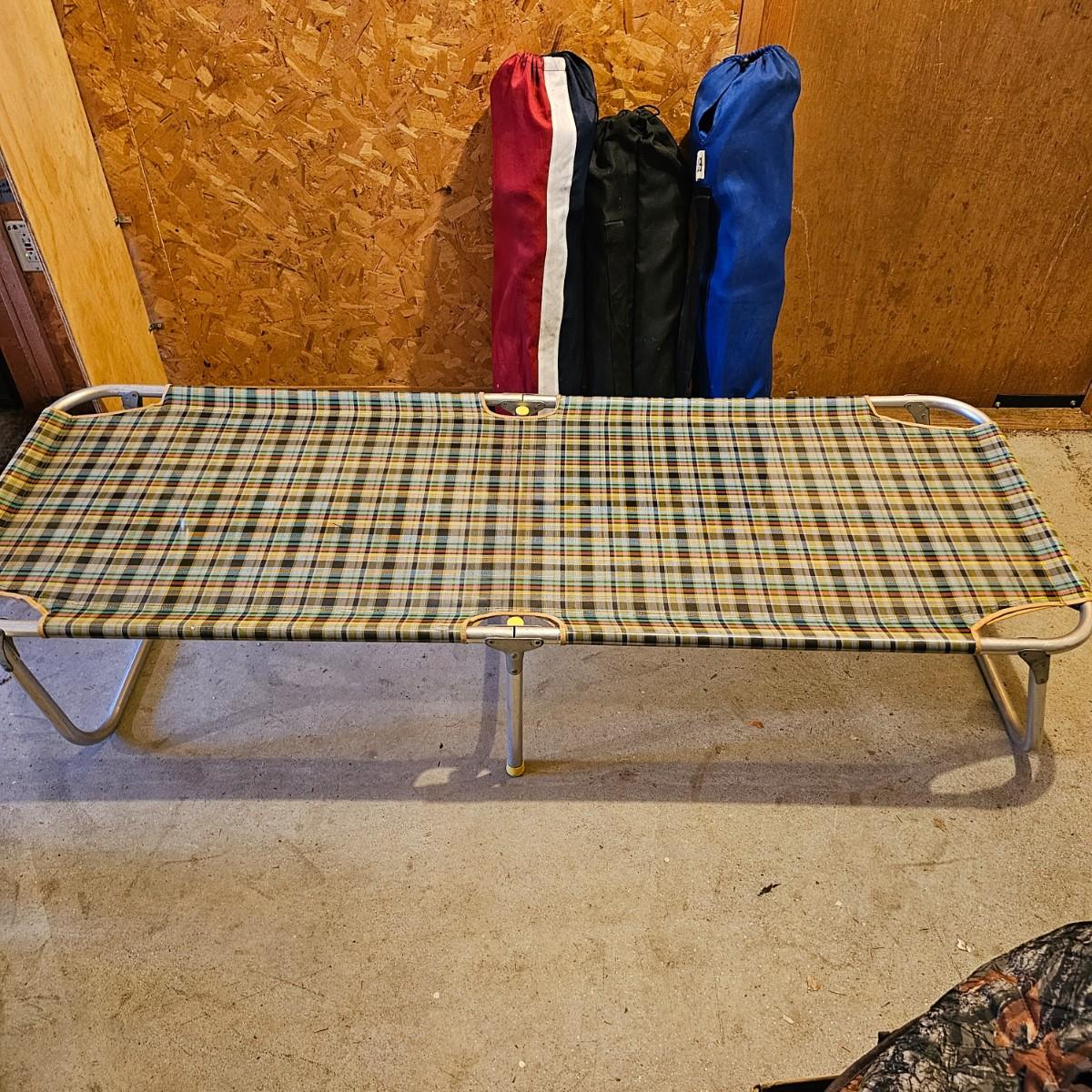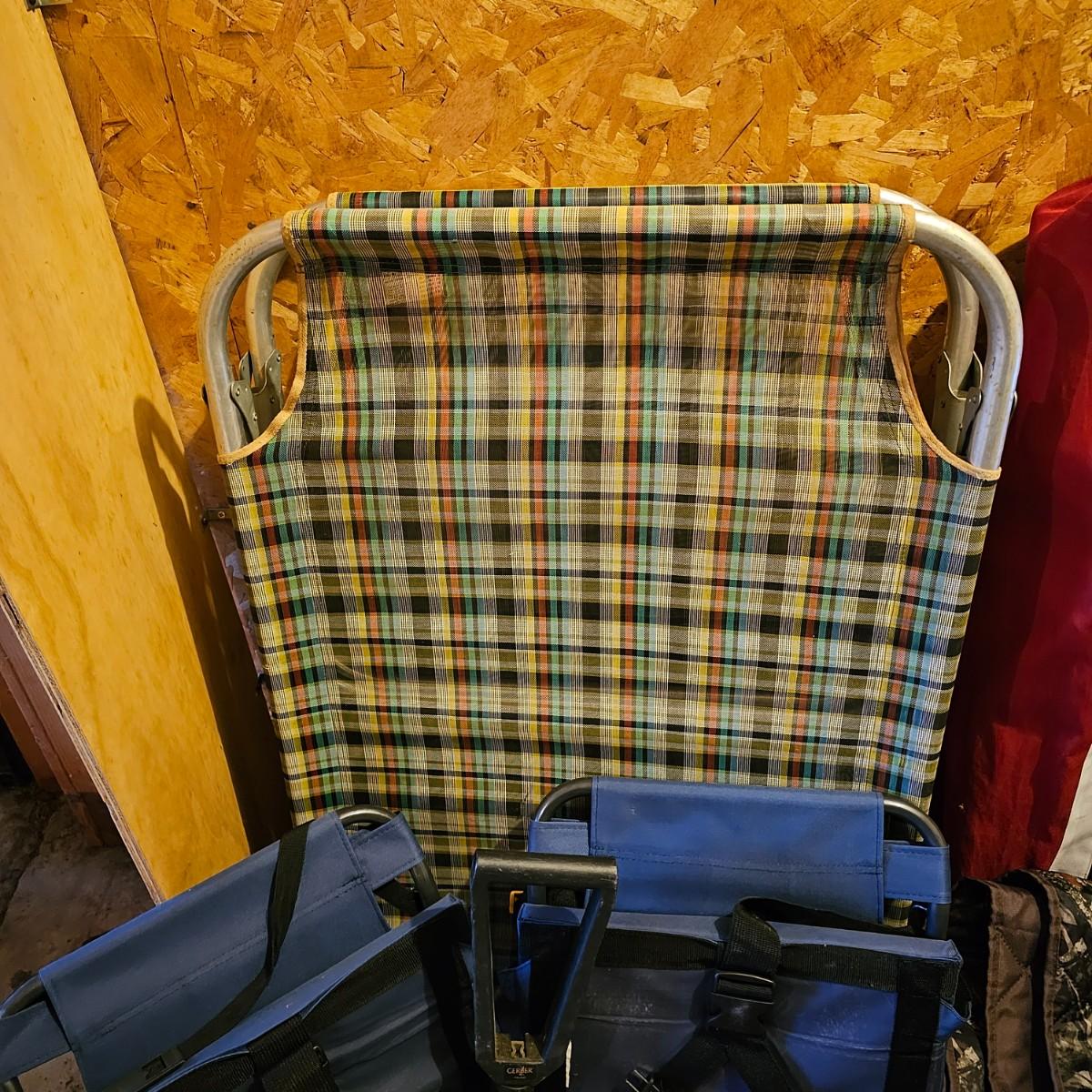 Chairs, a cot, blankets, more. Two fold up chairs with carry cases, 32" x 21" x 34"H, seat height 17"H. One fold up portable table with case. Two camo blankets 60" x 68". Vintage aluminum cot with plaid fabric top, 26" x 72". One folding camp shovel and two rechargeable LED flashlights, untested. Two stadium type chairs. See photos for details. Local pickup only.
