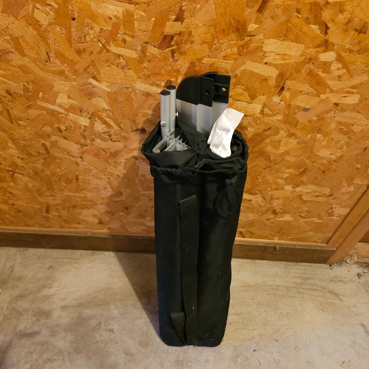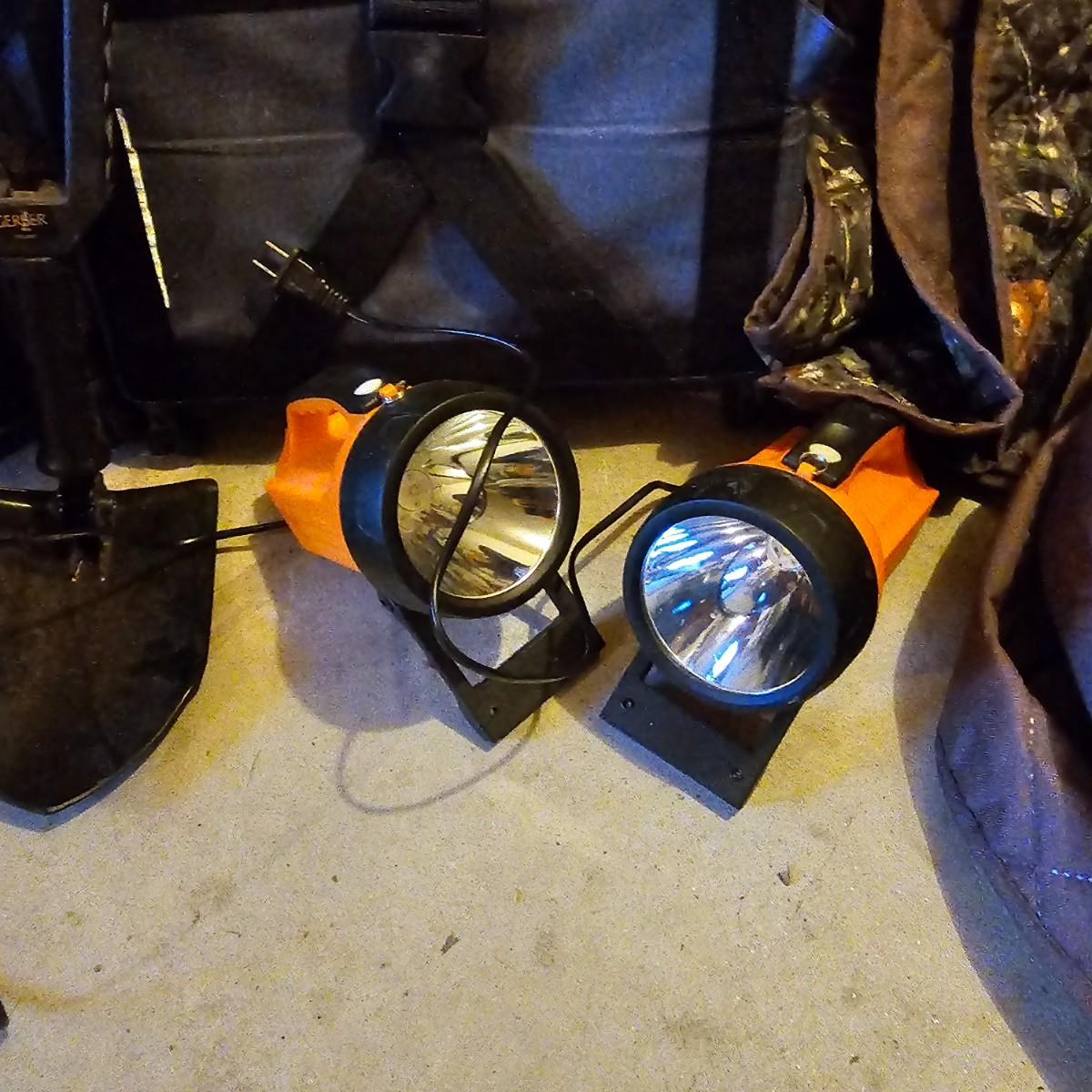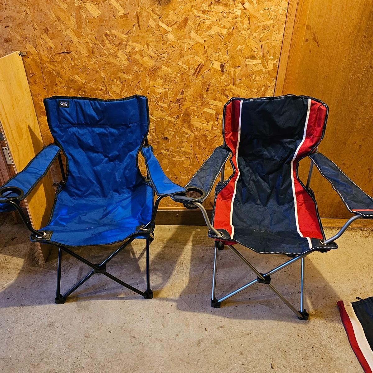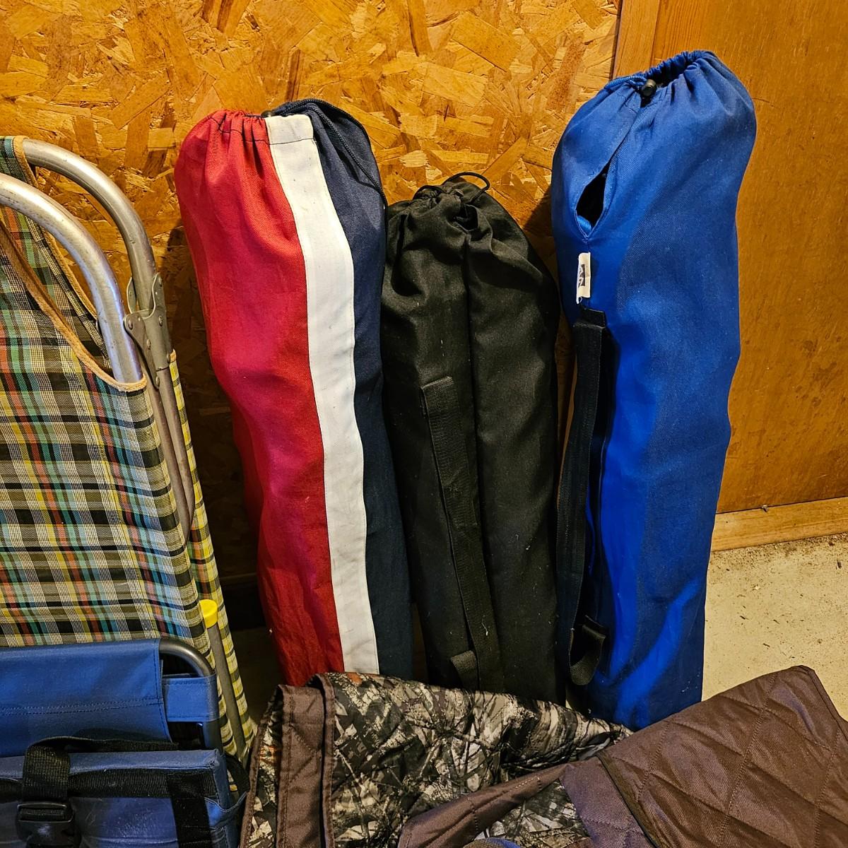 Chairs, a cot, blankets, more. Two fold up chairs with carry cases, 32" x 21" x 34"H, seat height 17"H. One fold up portable table with case. Two camo blankets 60" x 68". Vintage aluminum cot with plaid fabric top, 26" x 72". One folding camp shovel and two rechargeable LED flashlights, untested. Two stadium type chairs. See photos for details. Local pickup only.