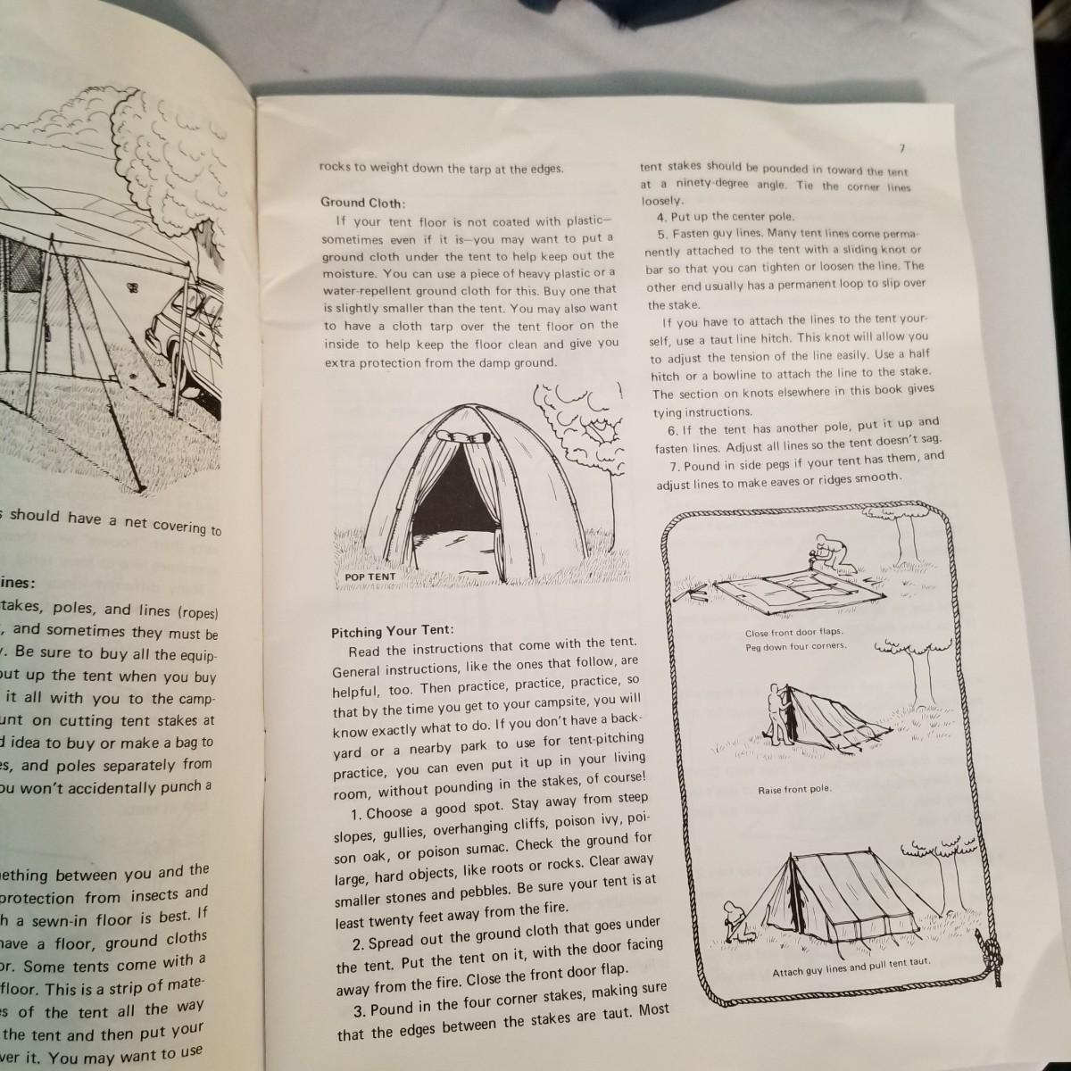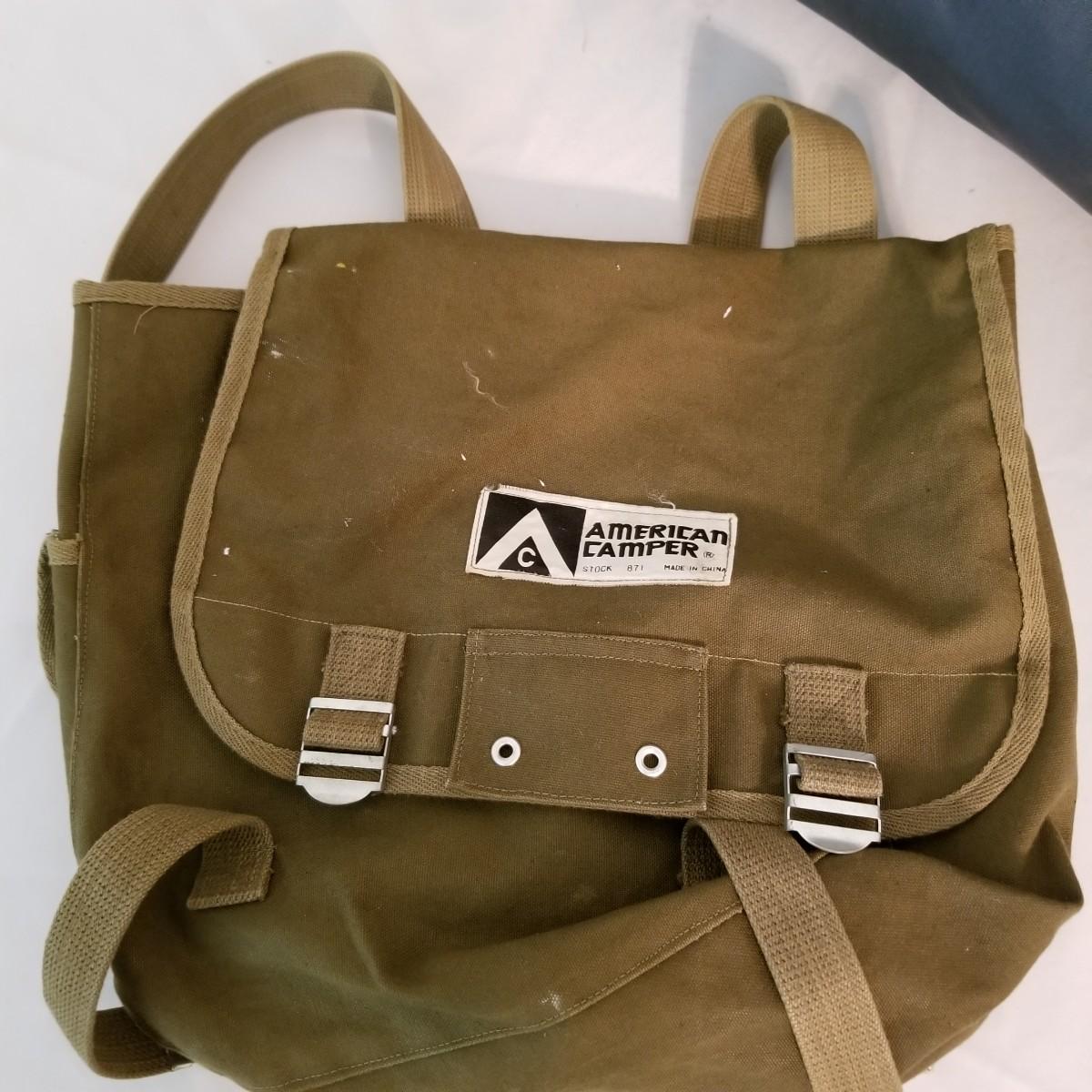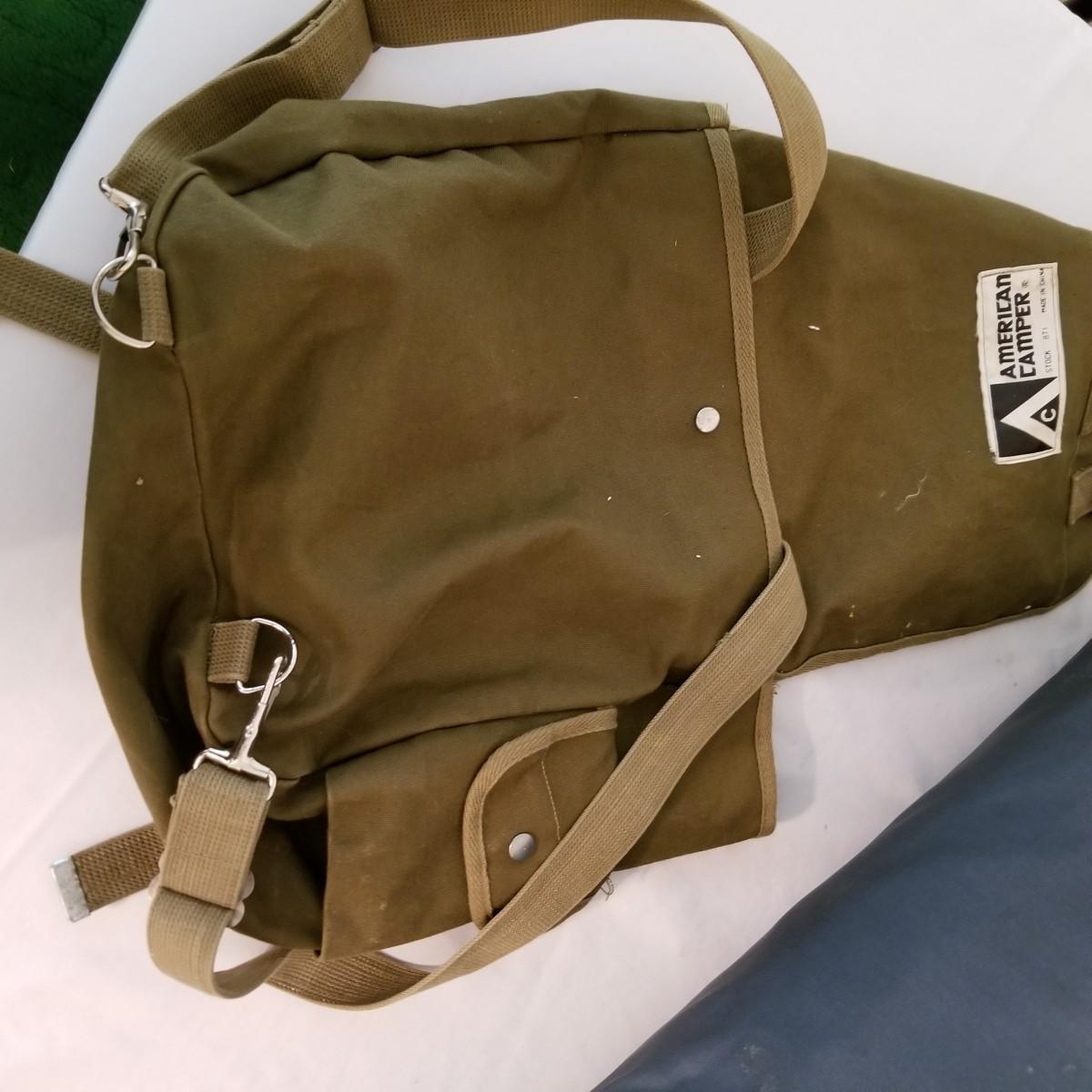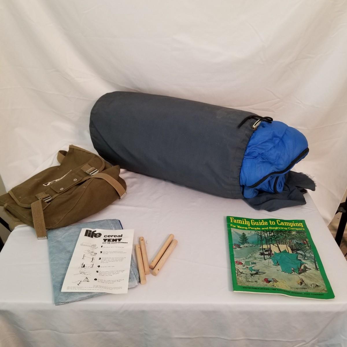 Sleeping bag, knapsack and more for camping. Family guide book to camping, Life cereal lean-to tent, small backpack, and a 30" x80" sleeping bag with carry sack. All items in good to fair condition. Shipping available.
