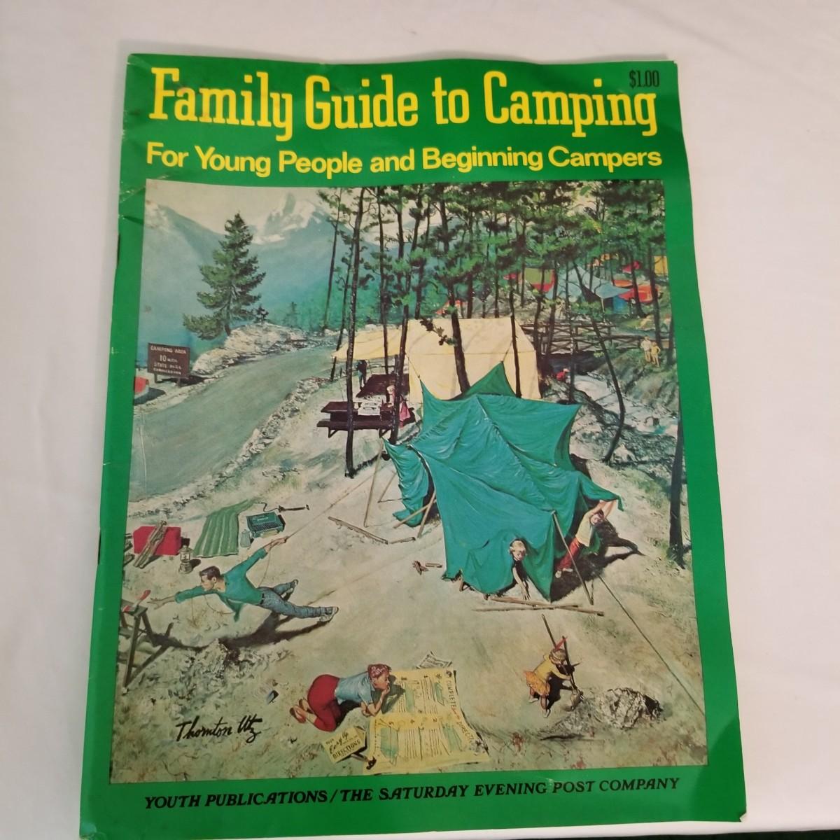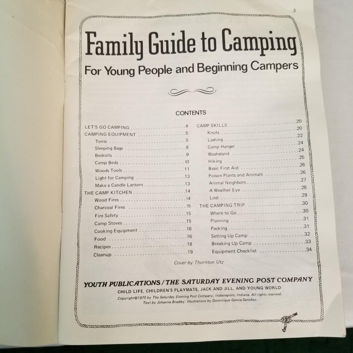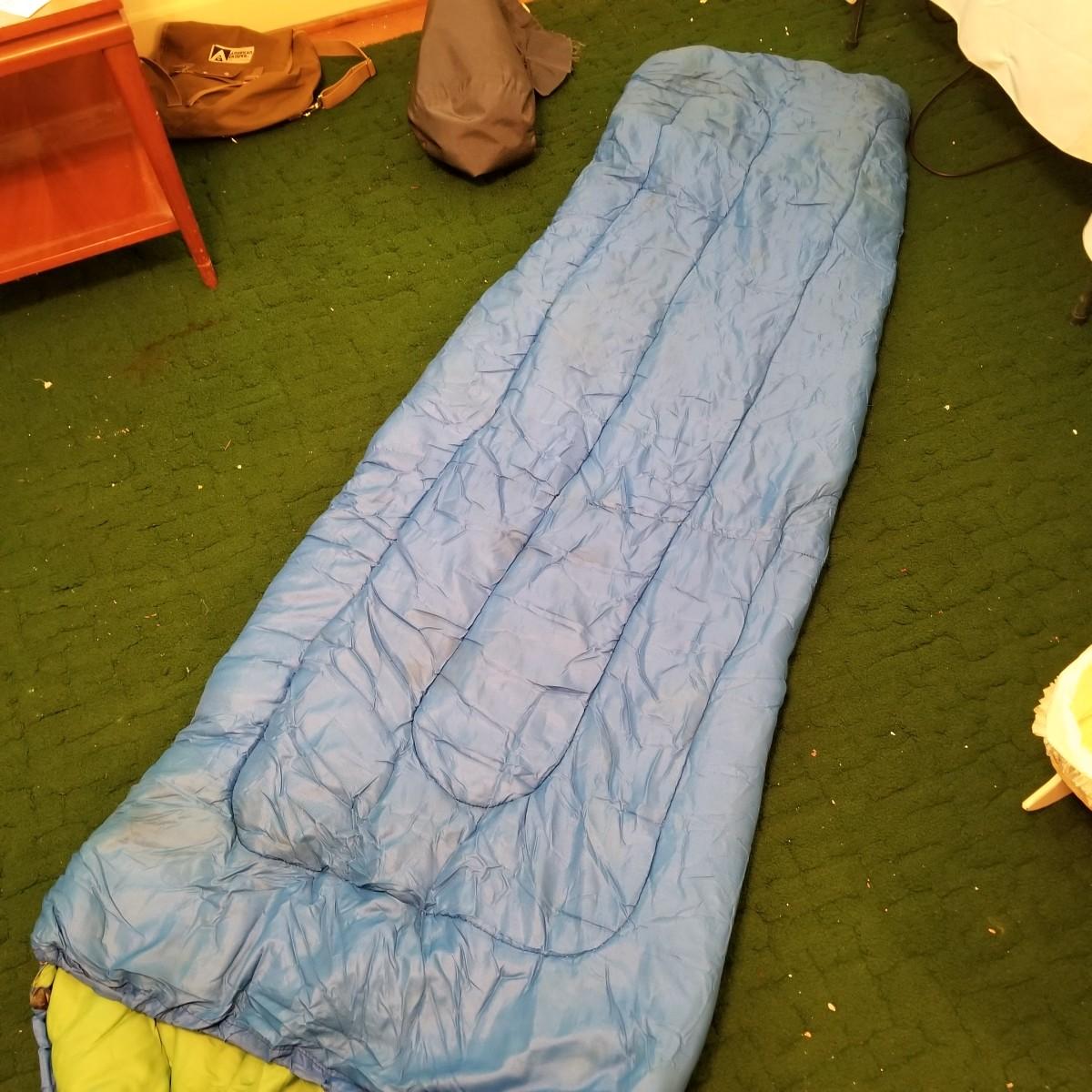 Sleeping bag, knapsack and more for camping. Family guide book to camping, Life cereal lean-to tent, small backpack, and a 30" x80" sleeping bag with carry sack. All items in good to fair condition. Shipping available.