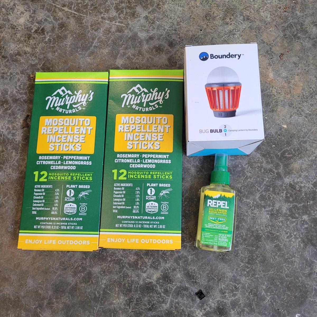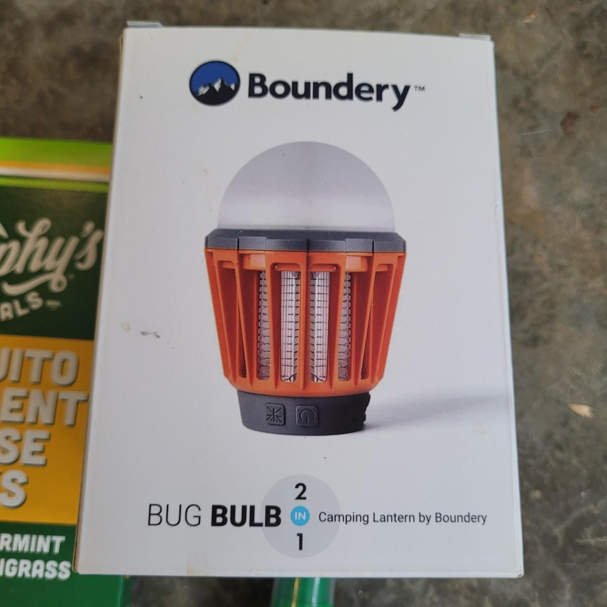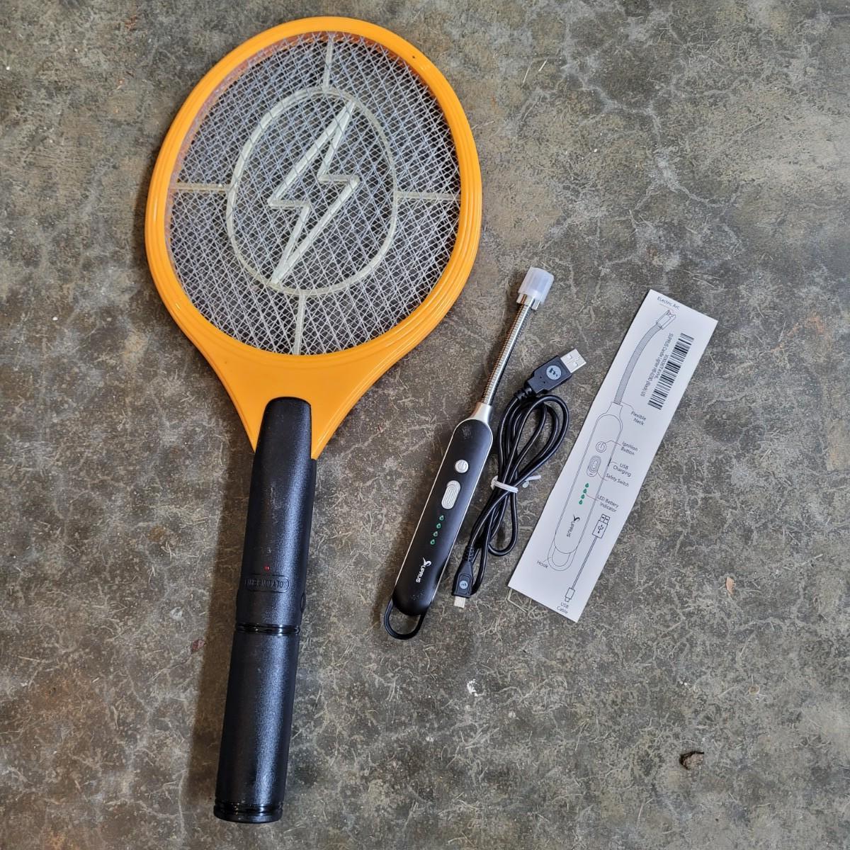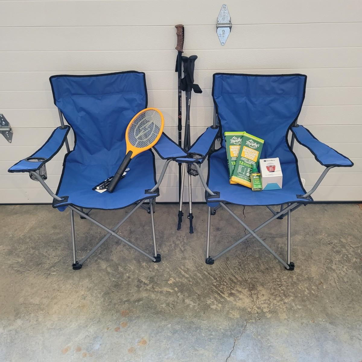 This lot includes various camping and outdoor supplies. Items included are two folding camping chairs with bags, three walking sticks, a big bulb, mosquito repellent incense, bug spray, electric bug racket, and electronic rechargeable lighter. The racket and lighter were not powered on, but appear to be chargeable. Incense, bug spray, and bug bulb appear to be unopened.