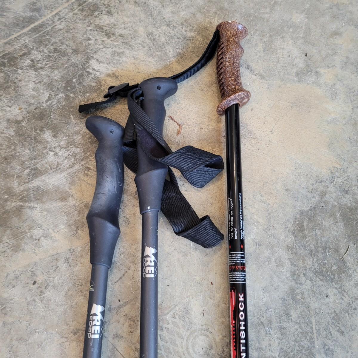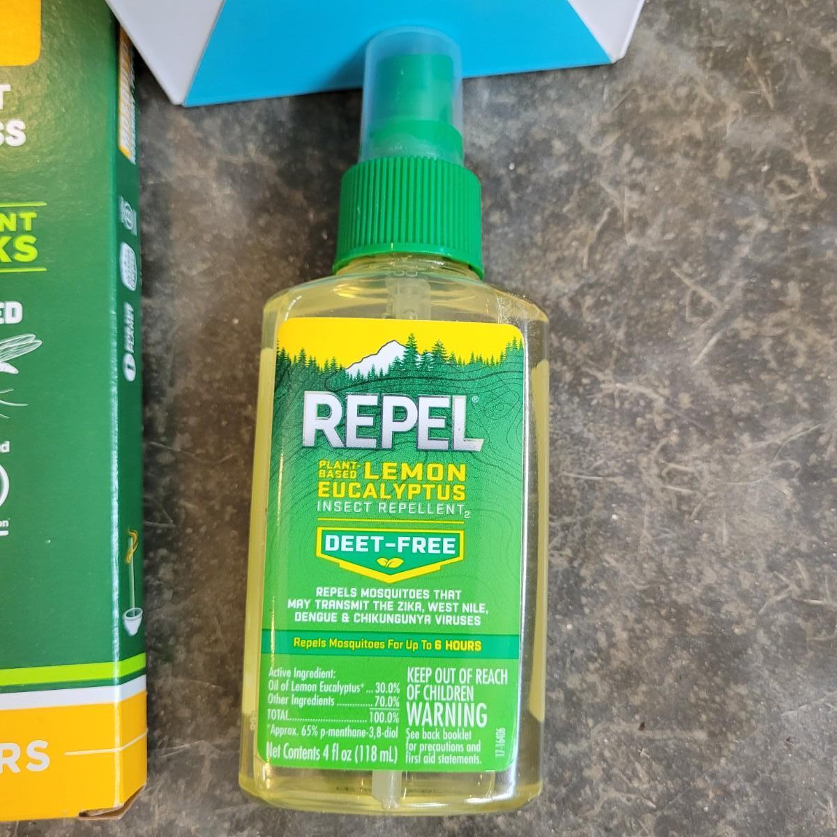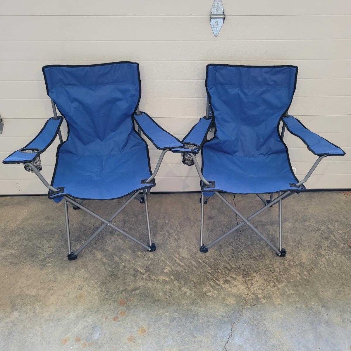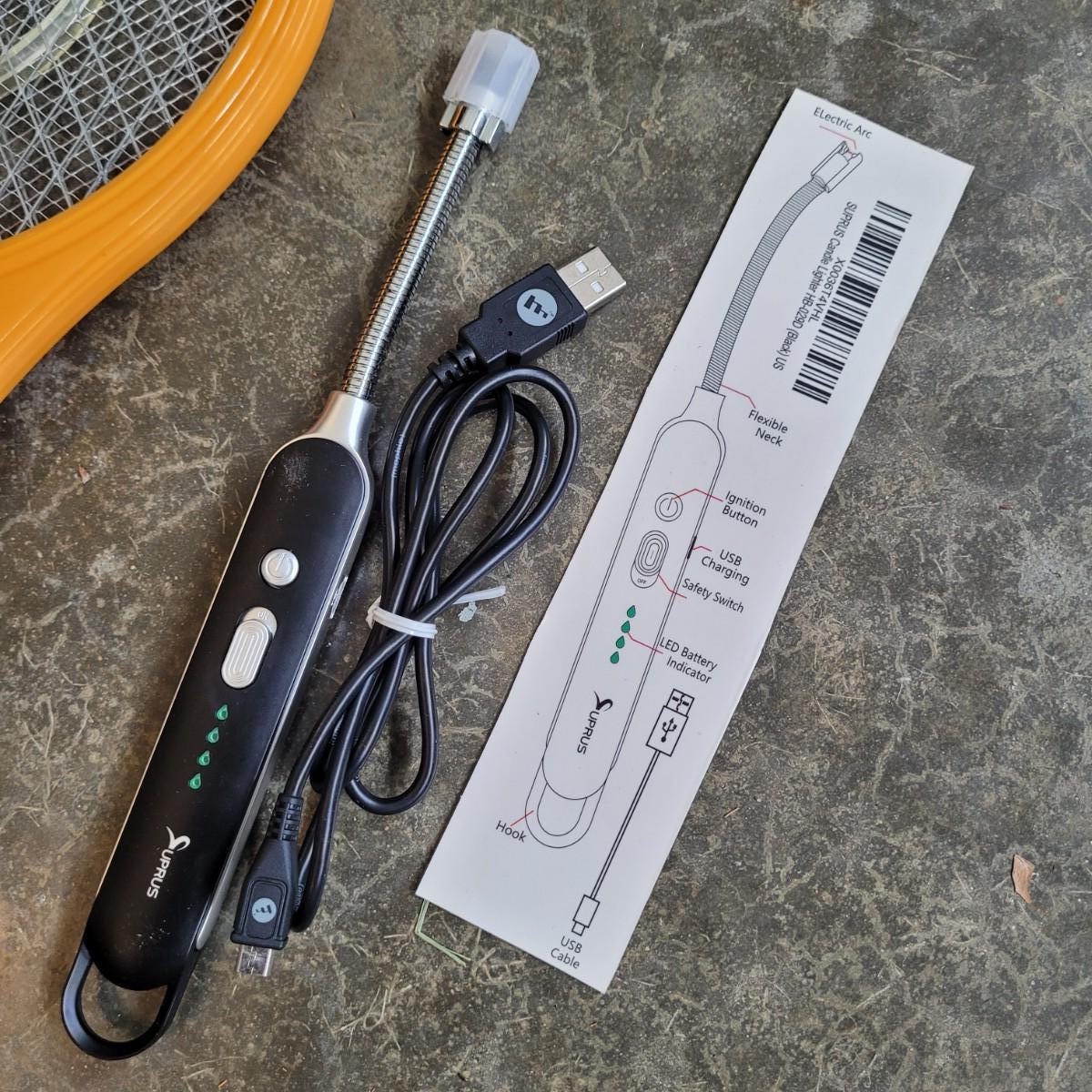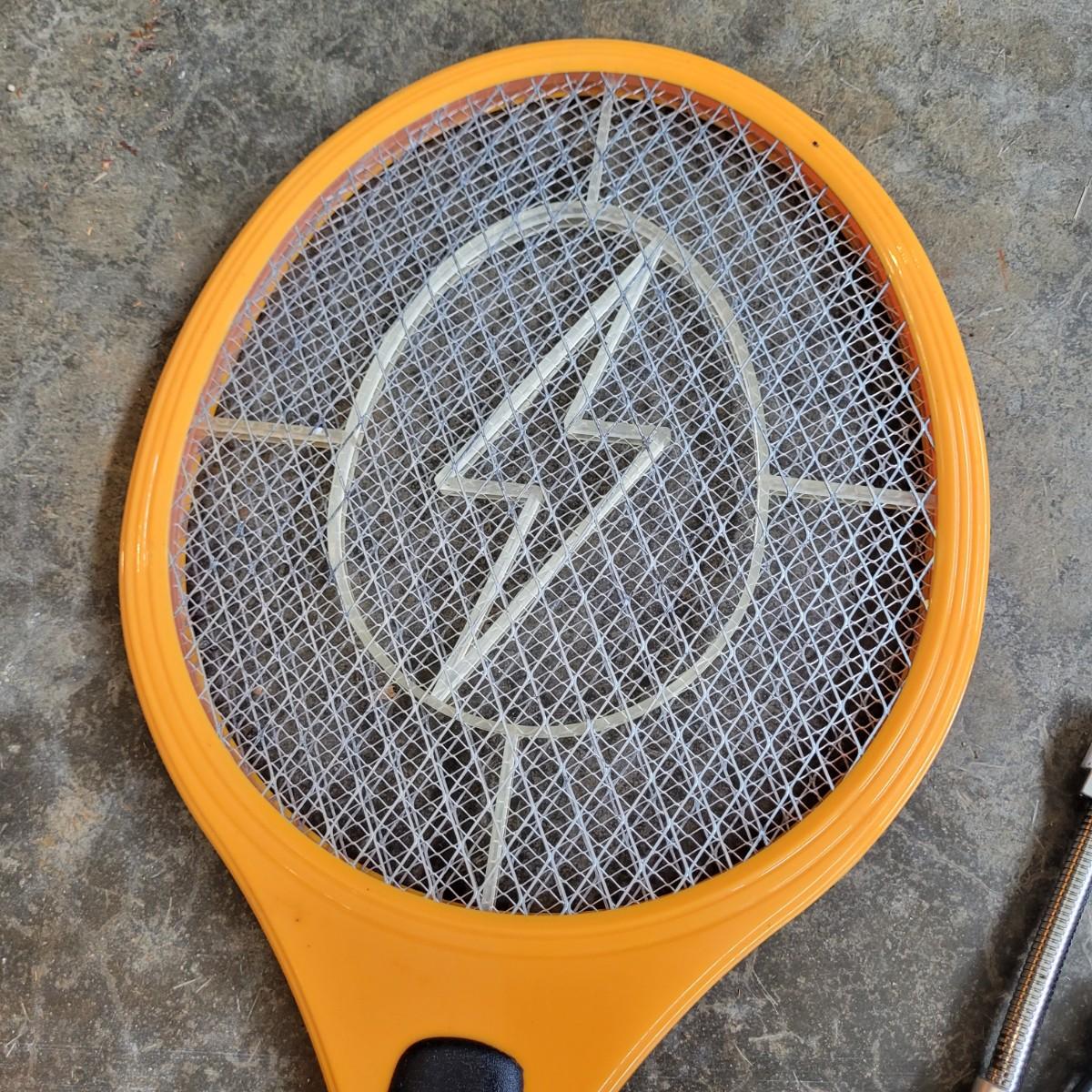 This lot includes various camping and outdoor supplies. Items included are two folding camping chairs with bags, three walking sticks, a big bulb, mosquito repellent incense, bug spray, electric bug racket, and electronic rechargeable lighter. The racket and lighter were not powered on, but appear to be chargeable. Incense, bug spray, and bug bulb appear to be unopened.