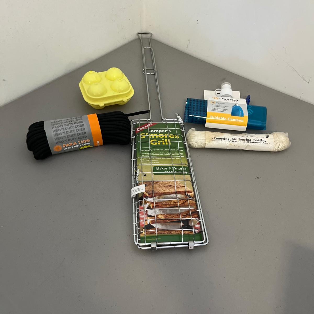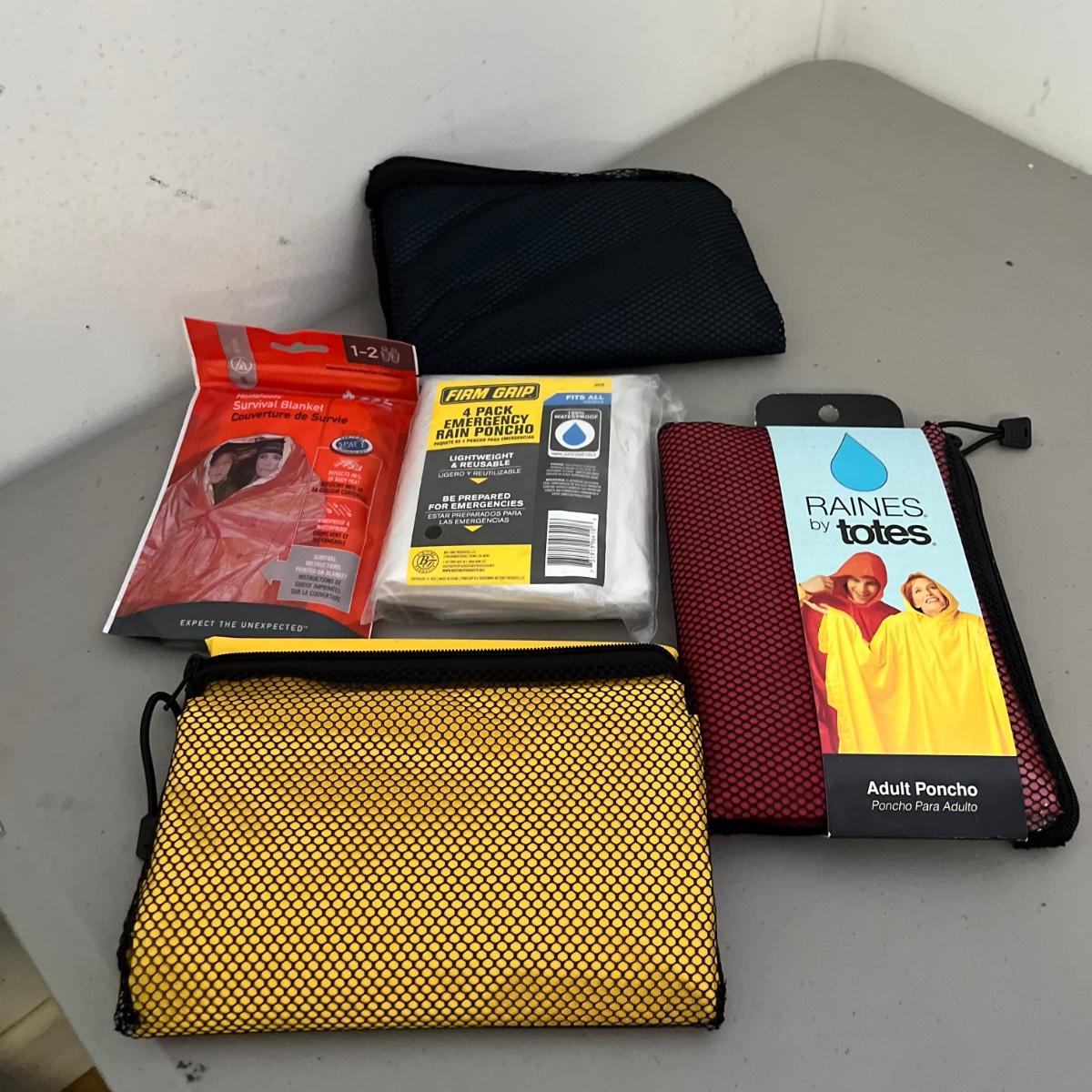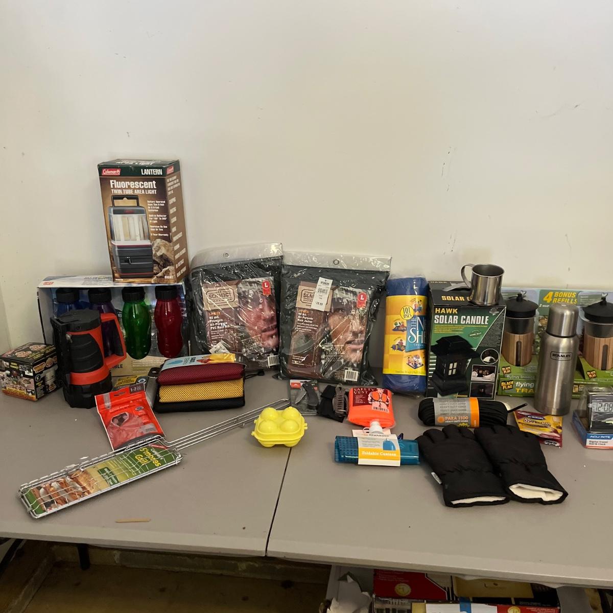 Lot includes indoor/outdoor stove, flashlight, battery powered Coleman light, Hawk Solar candle, Rain bib and jacket, para cord, gloves, knife, multi tool, rain ponchos and more.