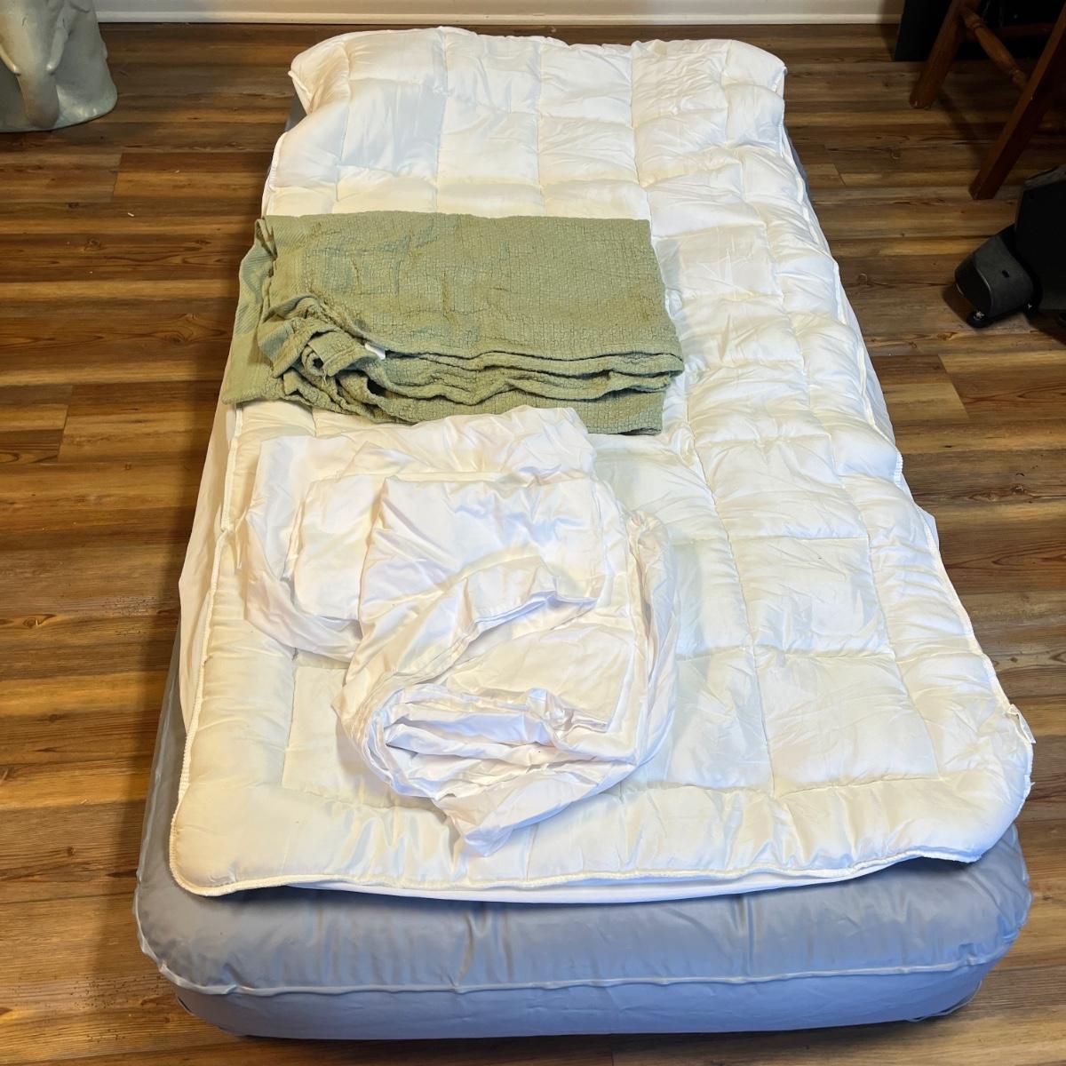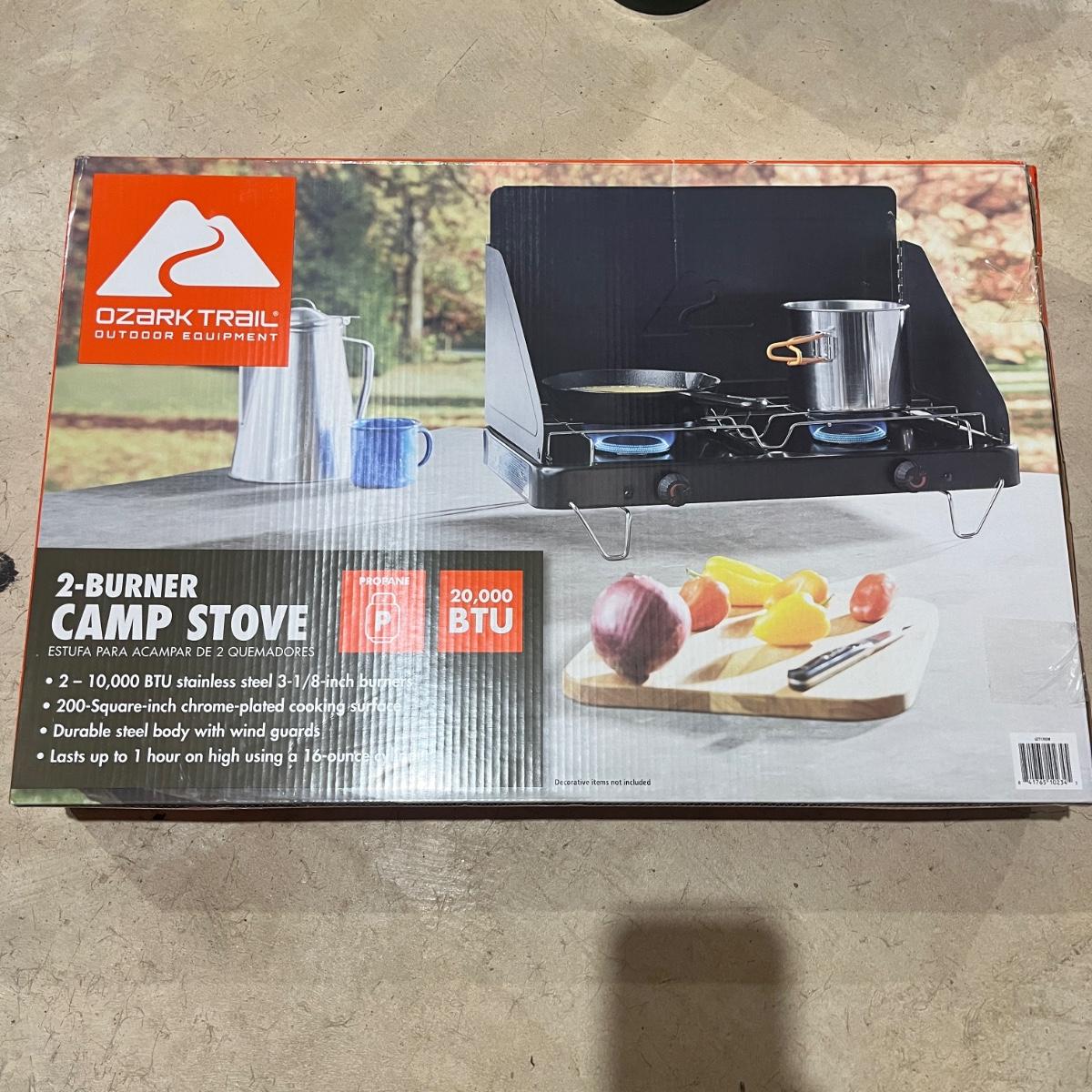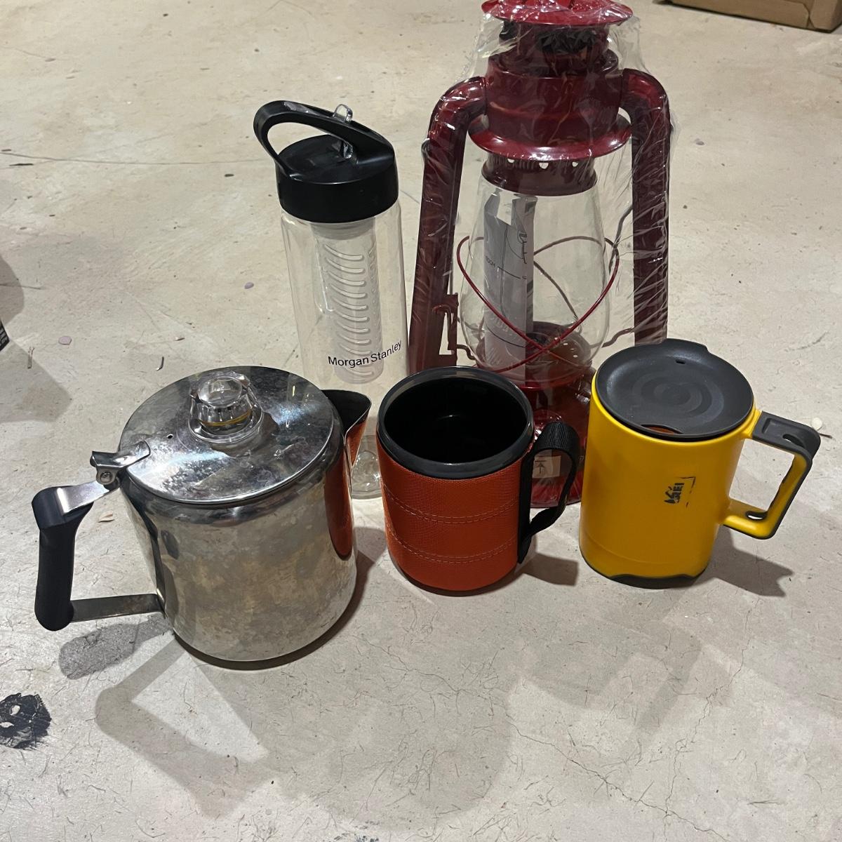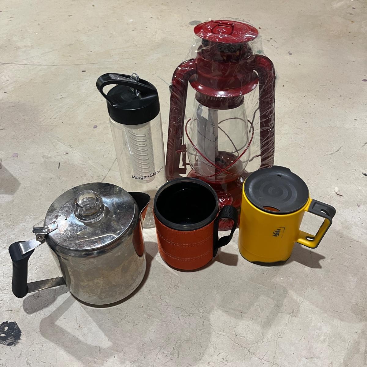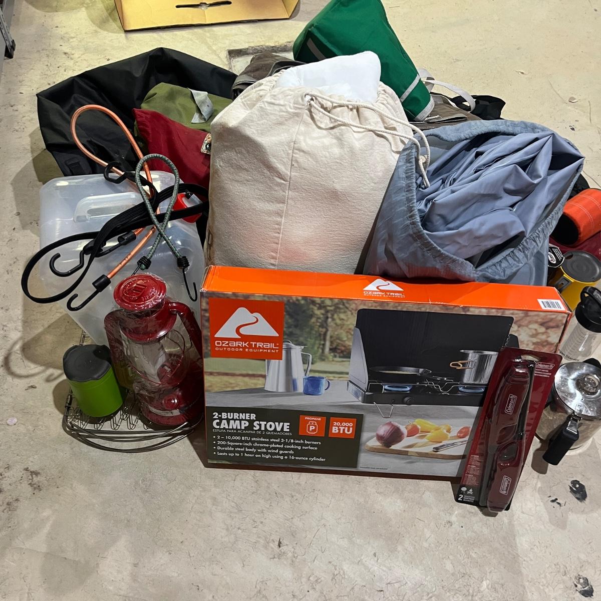 Lot includes twin size Aerobed with, pump, sheet set, blanket and mattress cover, NIB Ozark Trail double burner stove, oil lamp, REI plastic coffee cups and a metal coffee pot, two folding chairs, two duffel bags, tarp and more. Tarp measures 10"â„¢ x 14.