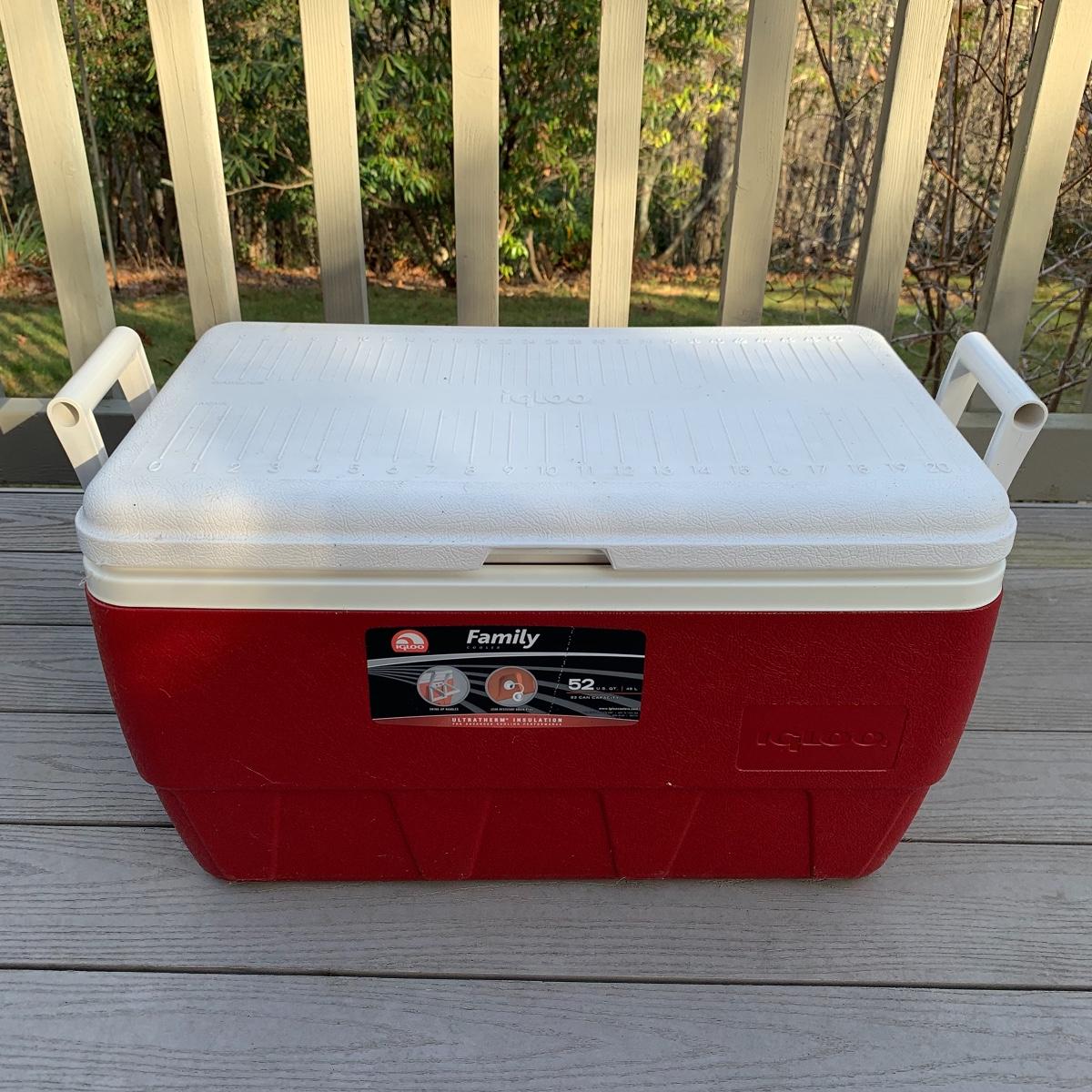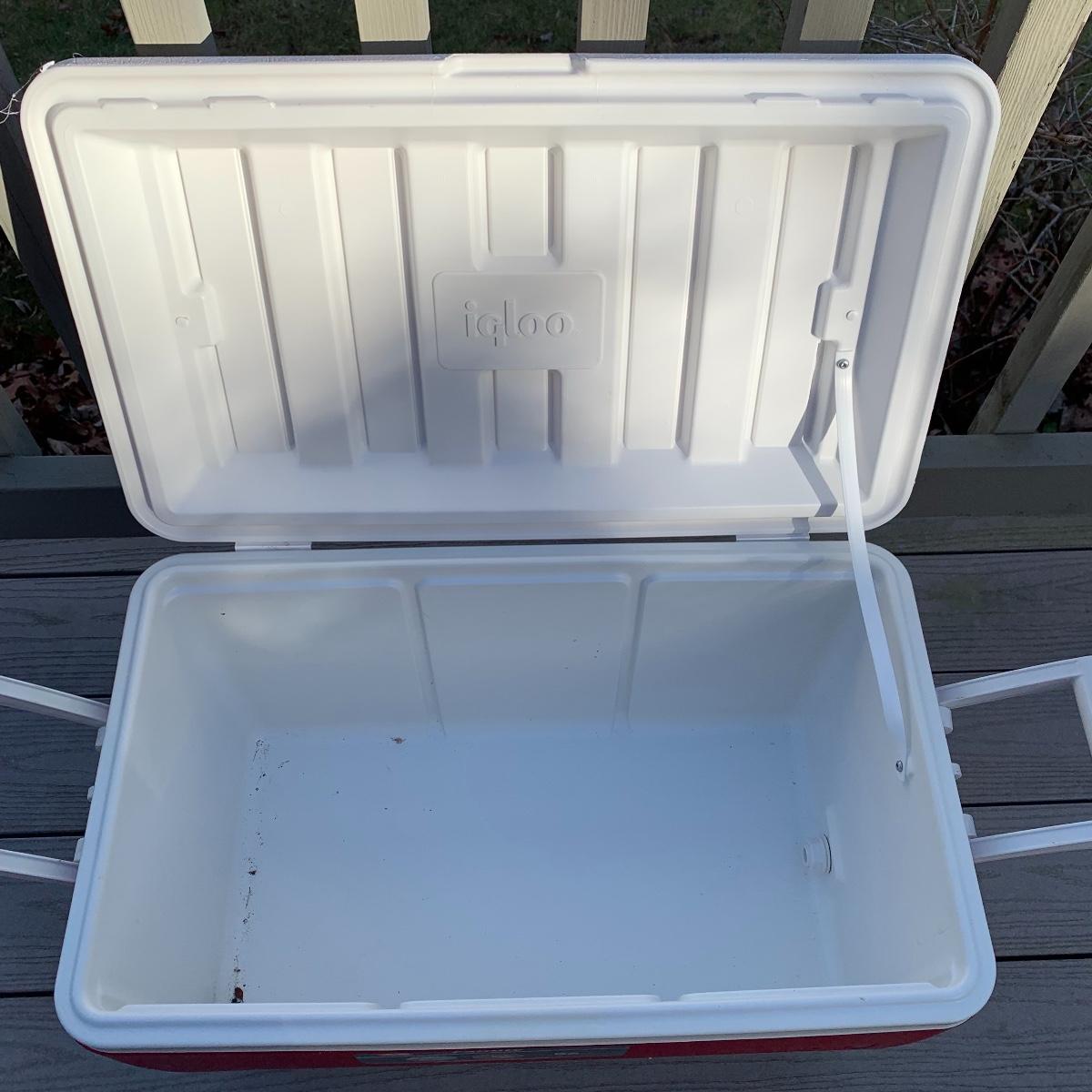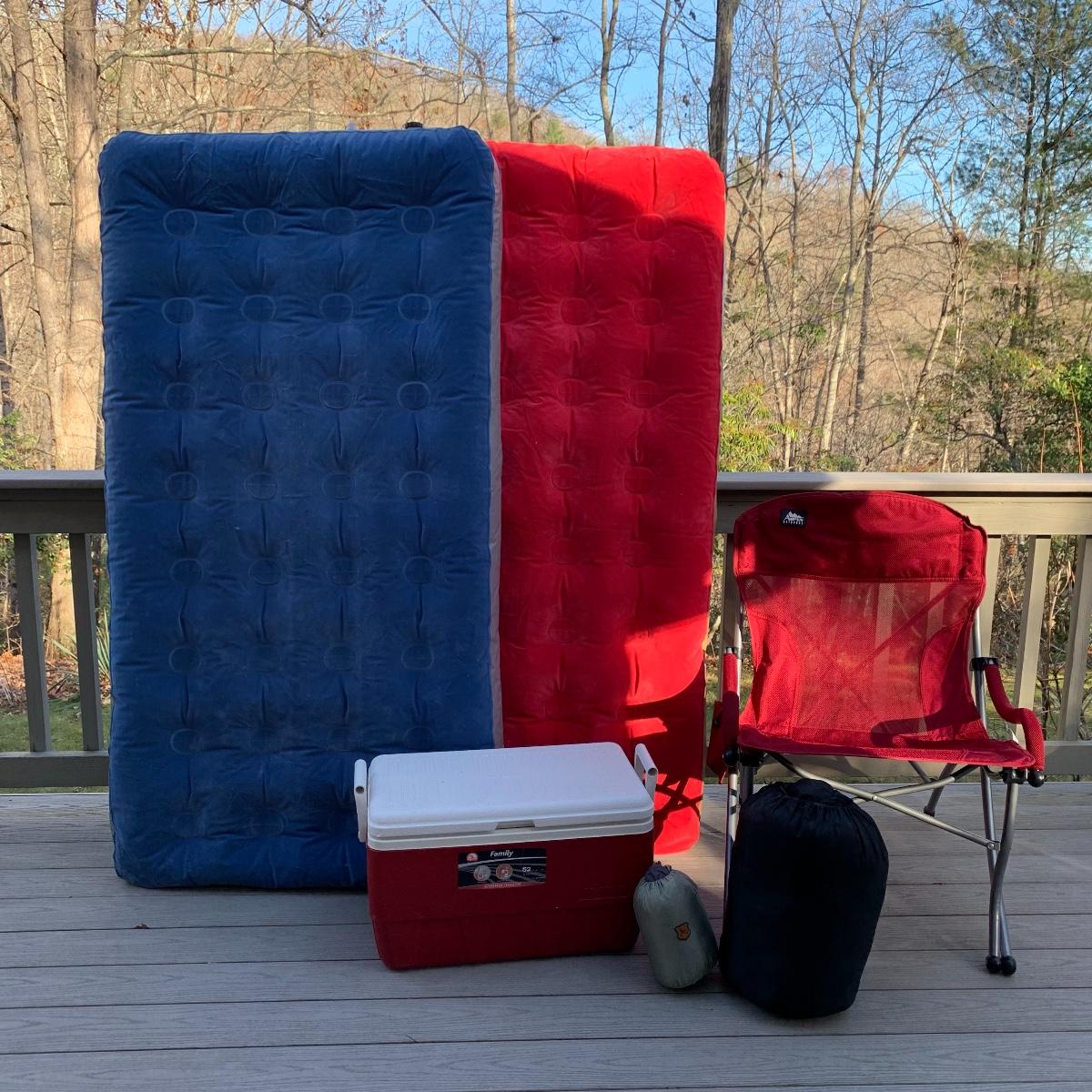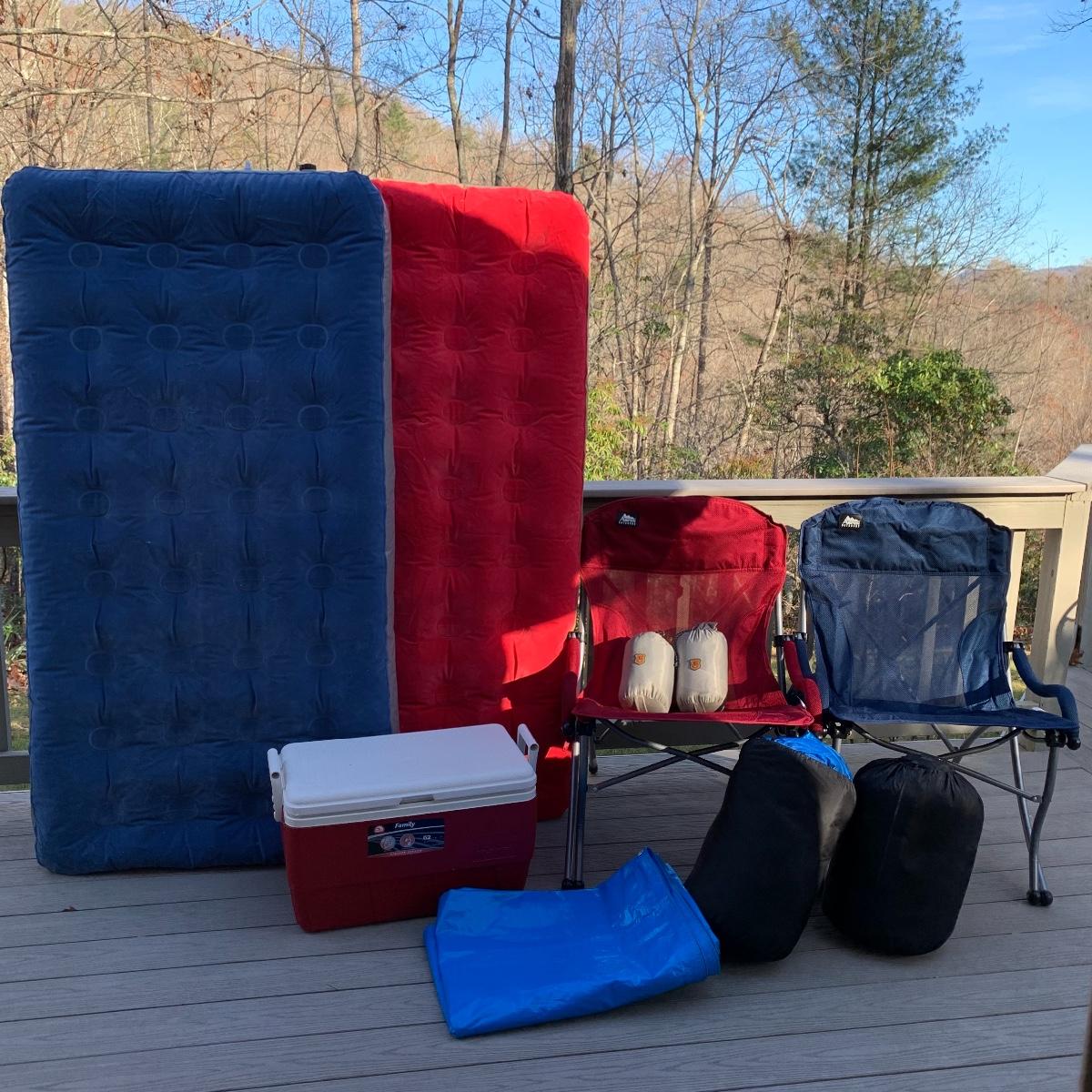 This lot includes a variety of great camping gear. Two folding arm chairs are included, with their carrying bags. The have cushioned arm rests. There is a 52 quart Igloo brand cooler with two handles. It has some debris inside that can easily be cleaned out. There are two Field & Stream brand sleeping bags in stuff sacks and camping pillows in stuff sacks. There are two single sized blow up air mattresses. They were tested and held air for over an hour. Pump is NOT included. One blue tarp completes this lot. Local pickup only.