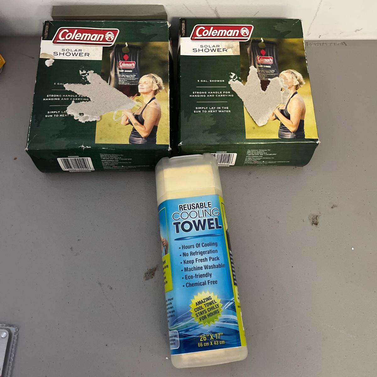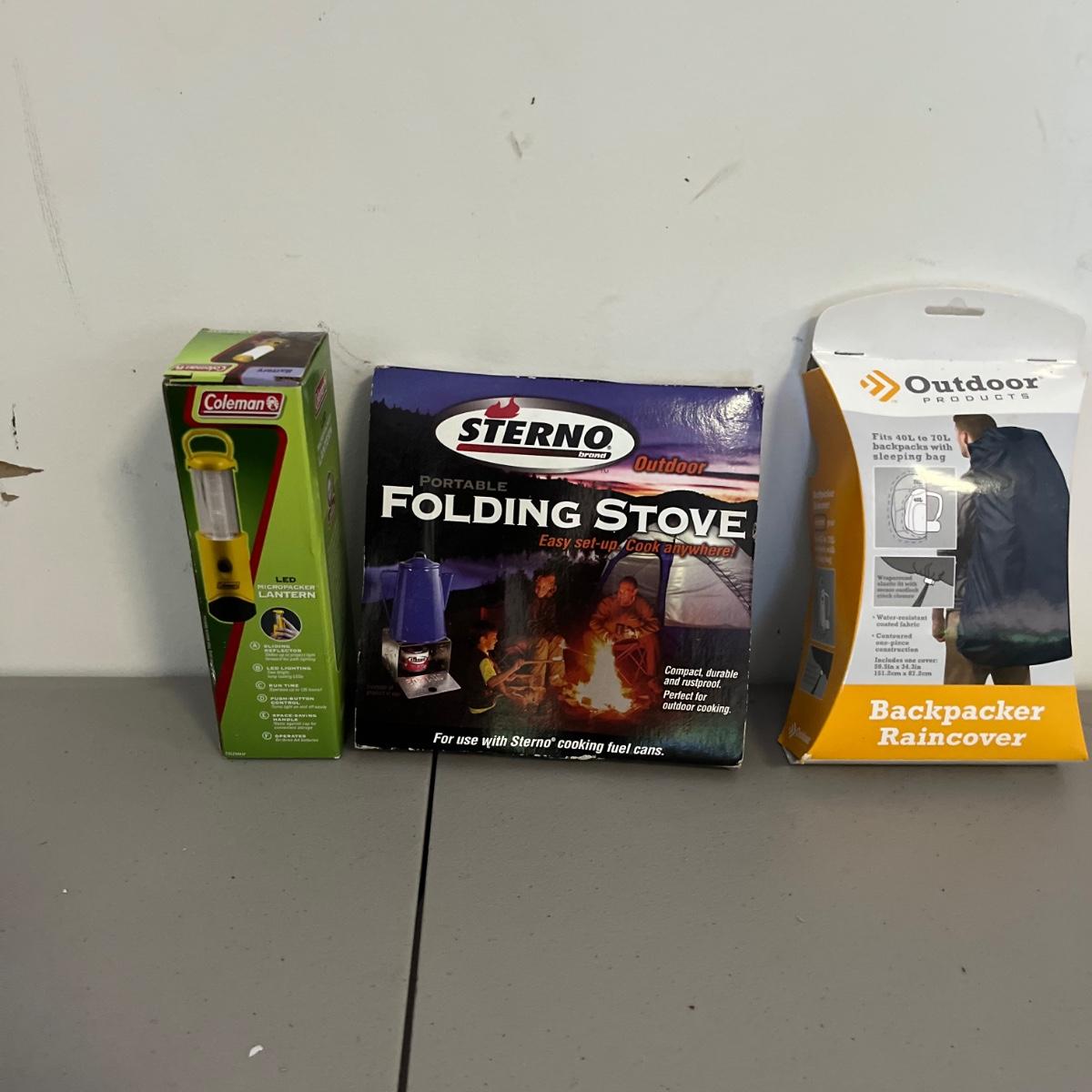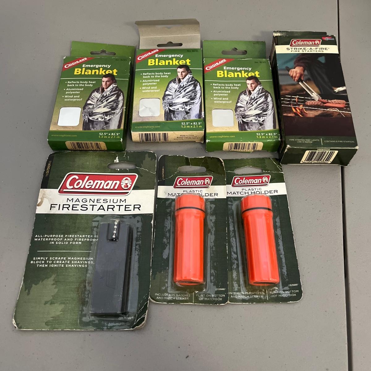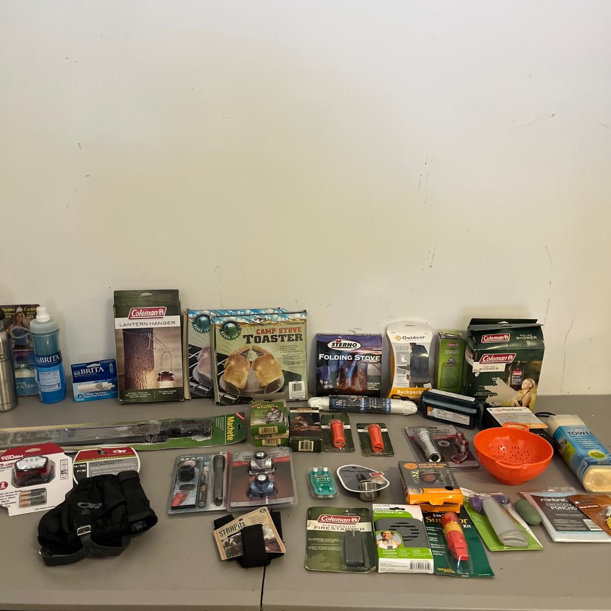 Lot includes machete, mag lite, folding stove, flashlights, solar showers, fire starters, match holders, water bottles, camp toaster and more.