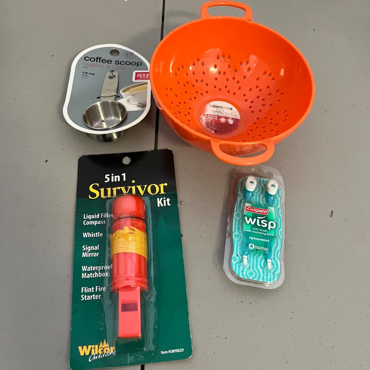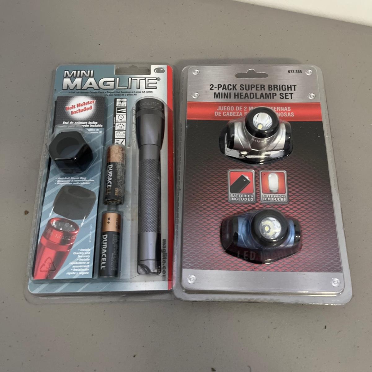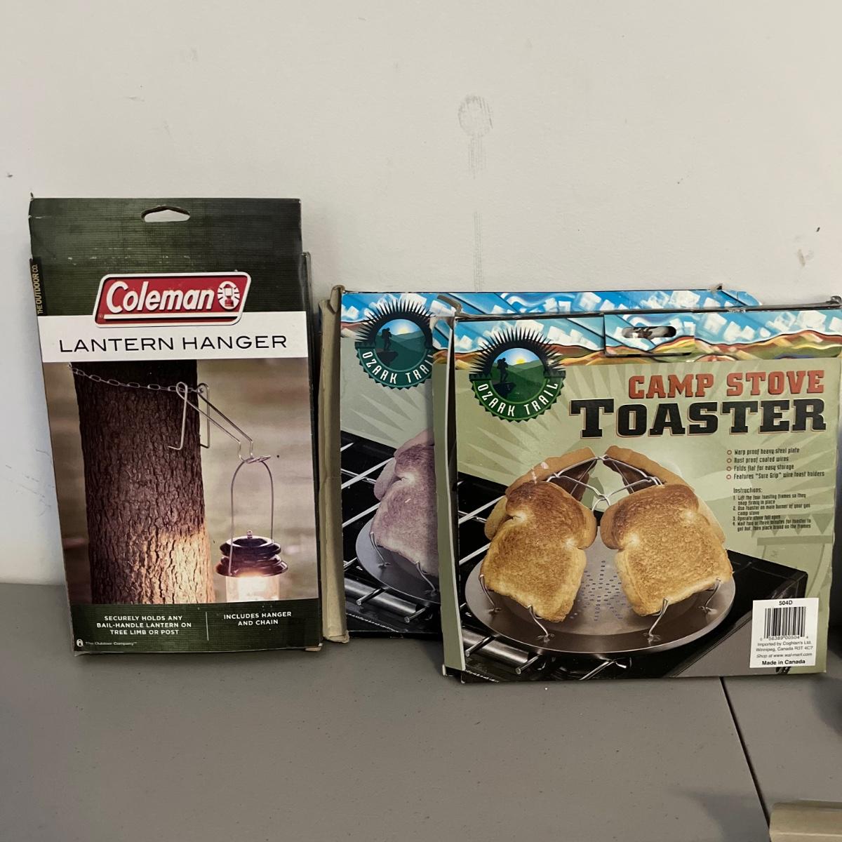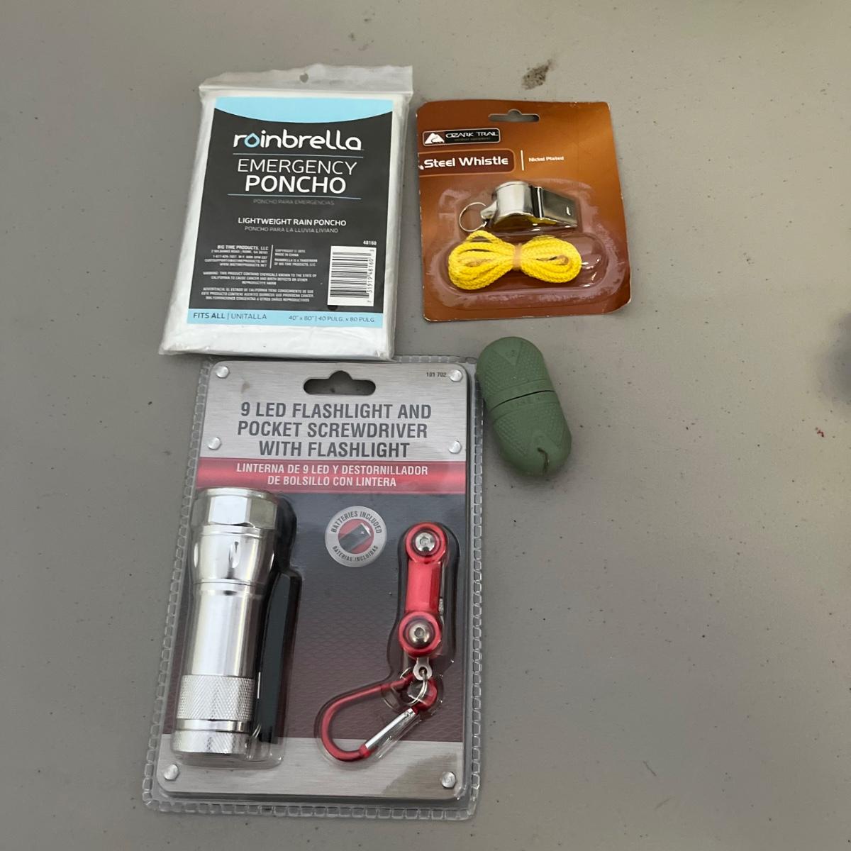 Lot includes machete, mag lite, folding stove, flashlights, solar showers, fire starters, match holders, water bottles, camp toaster and more.
