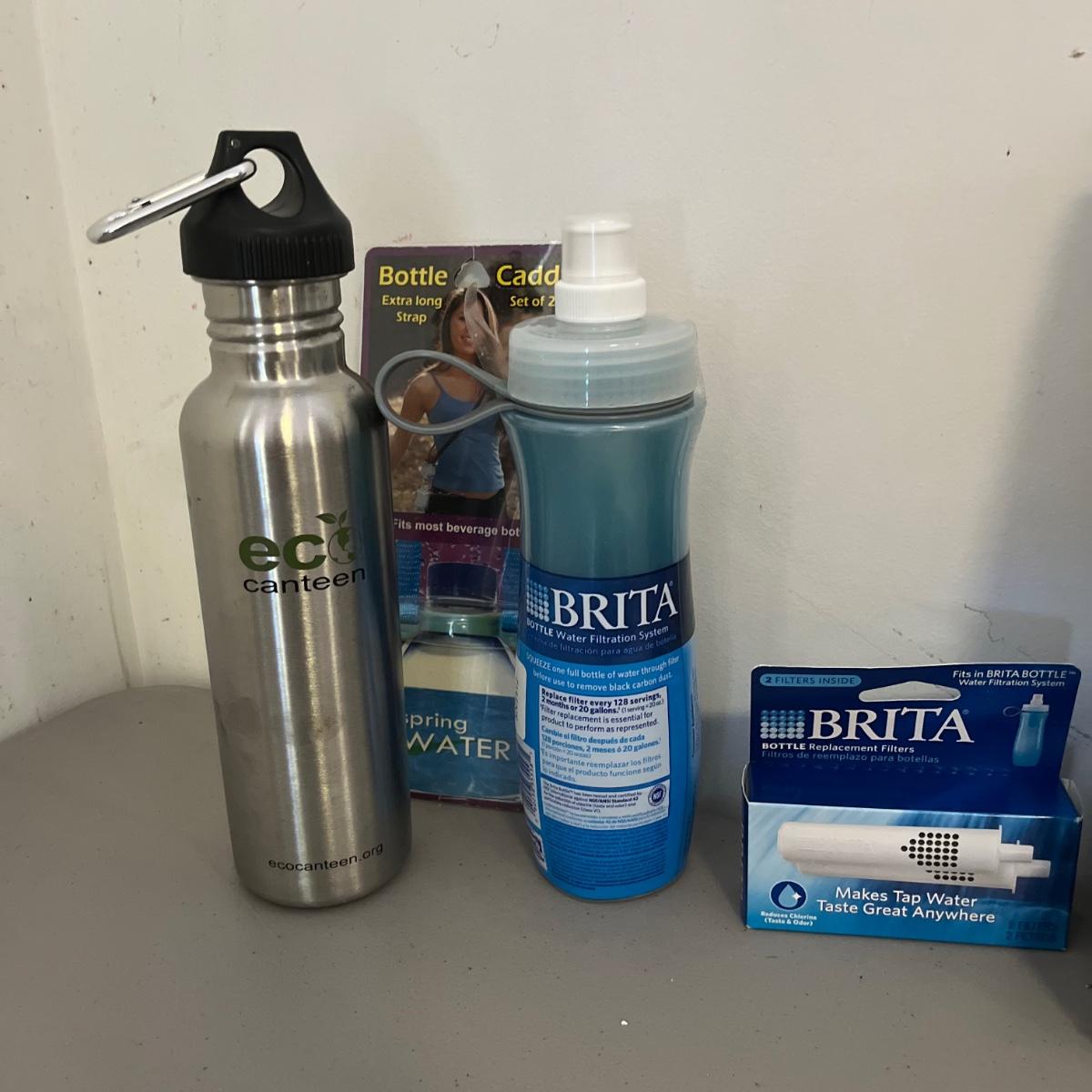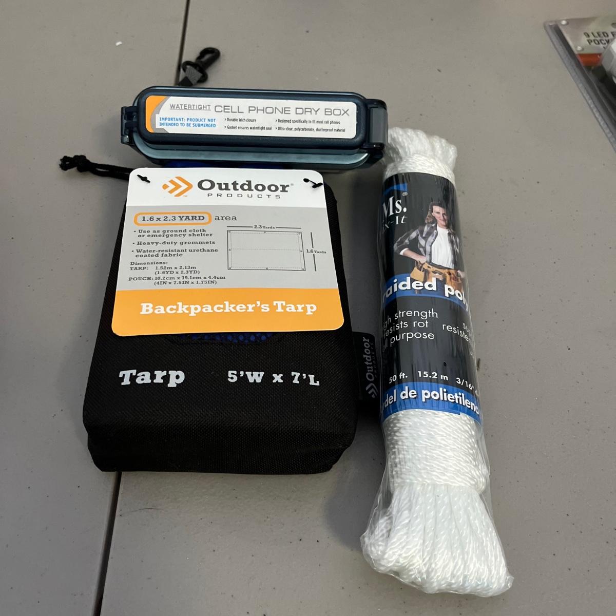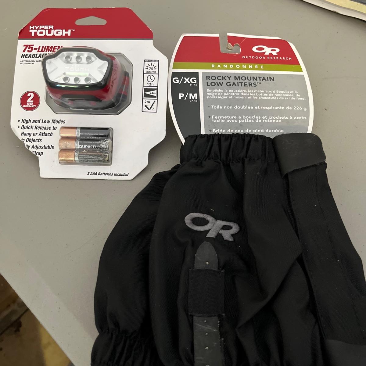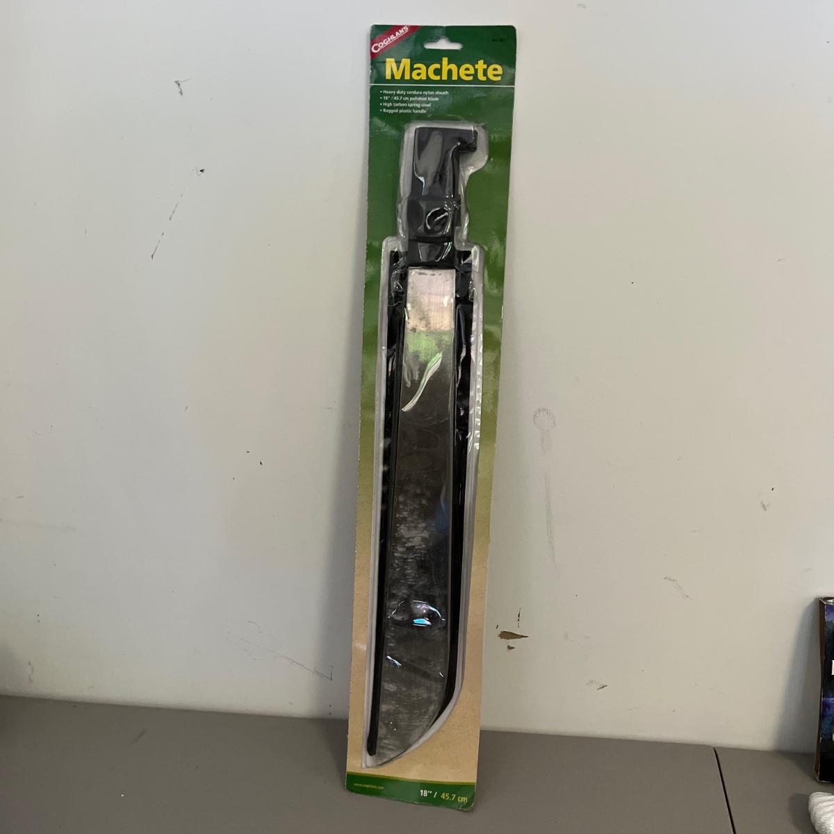 Lot includes machete, mag lite, folding stove, flashlights, solar showers, fire starters, match holders, water bottles, camp toaster and more.