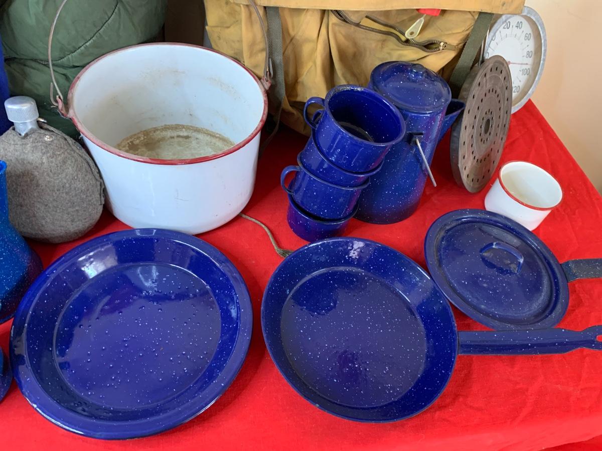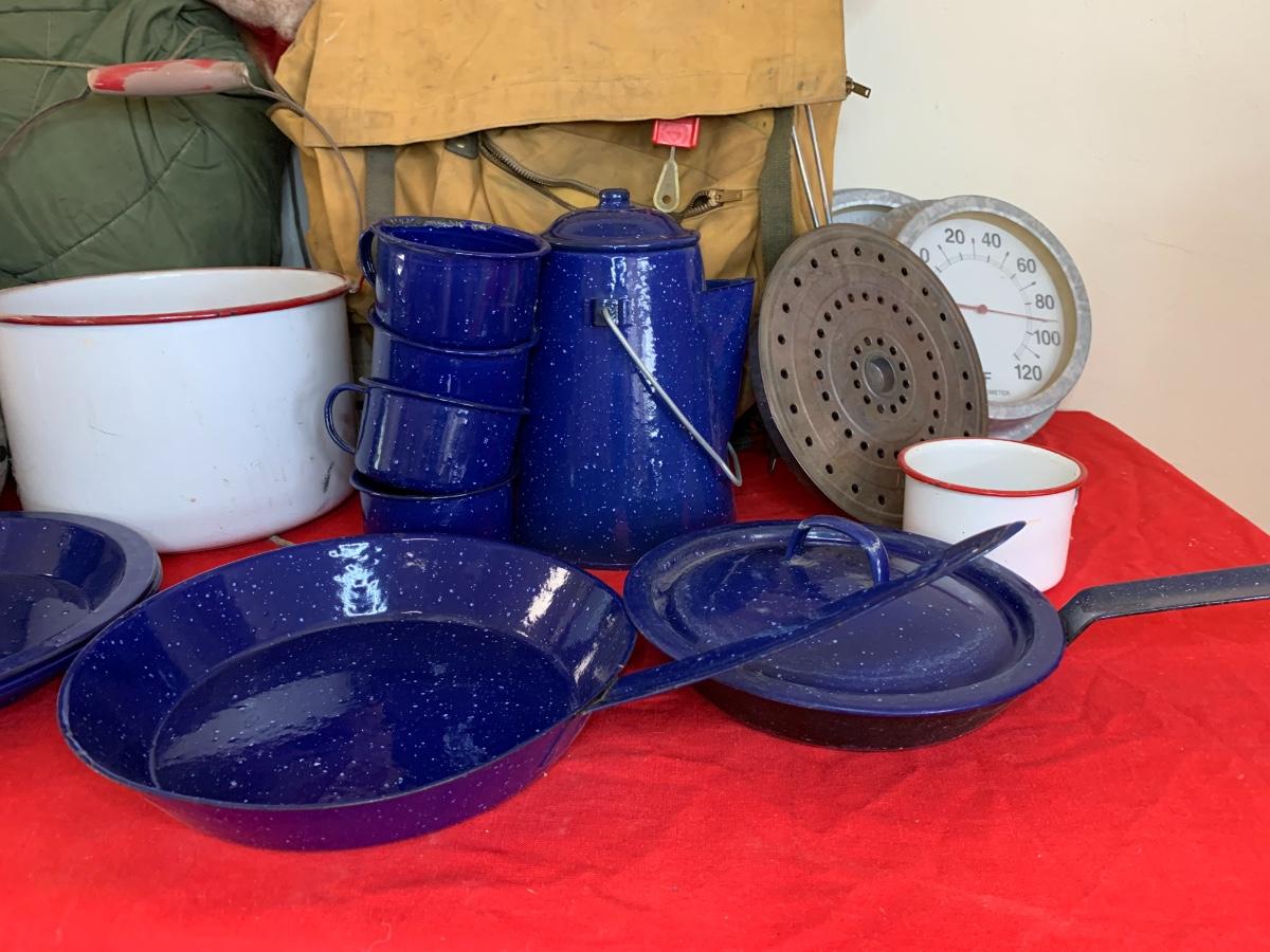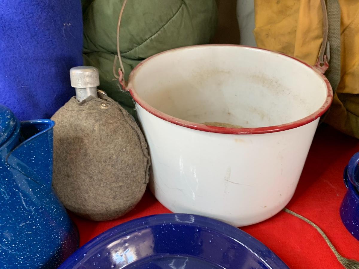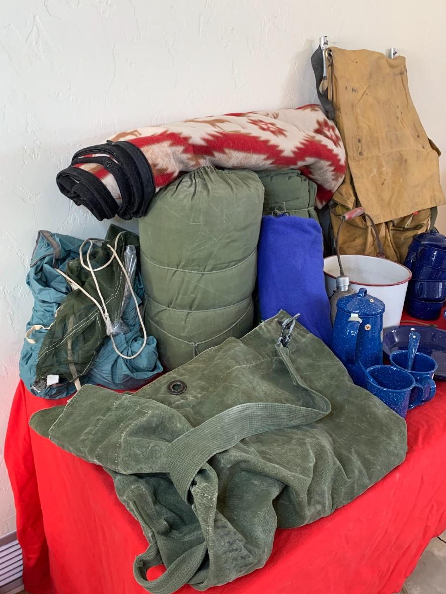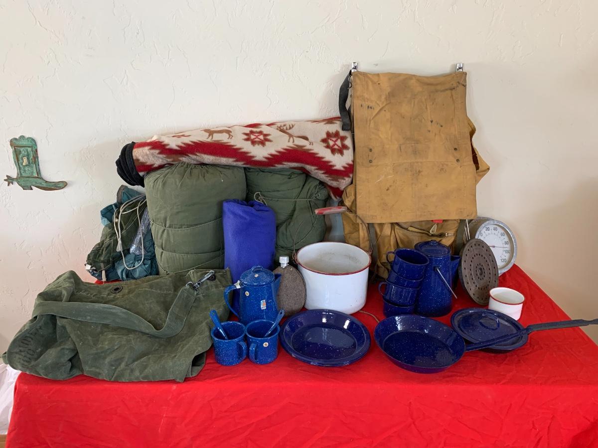 Assortment of vintage camping gear including blankets, backpacks, sleeping bags, travel thermos, enamel camping kitchenware and more