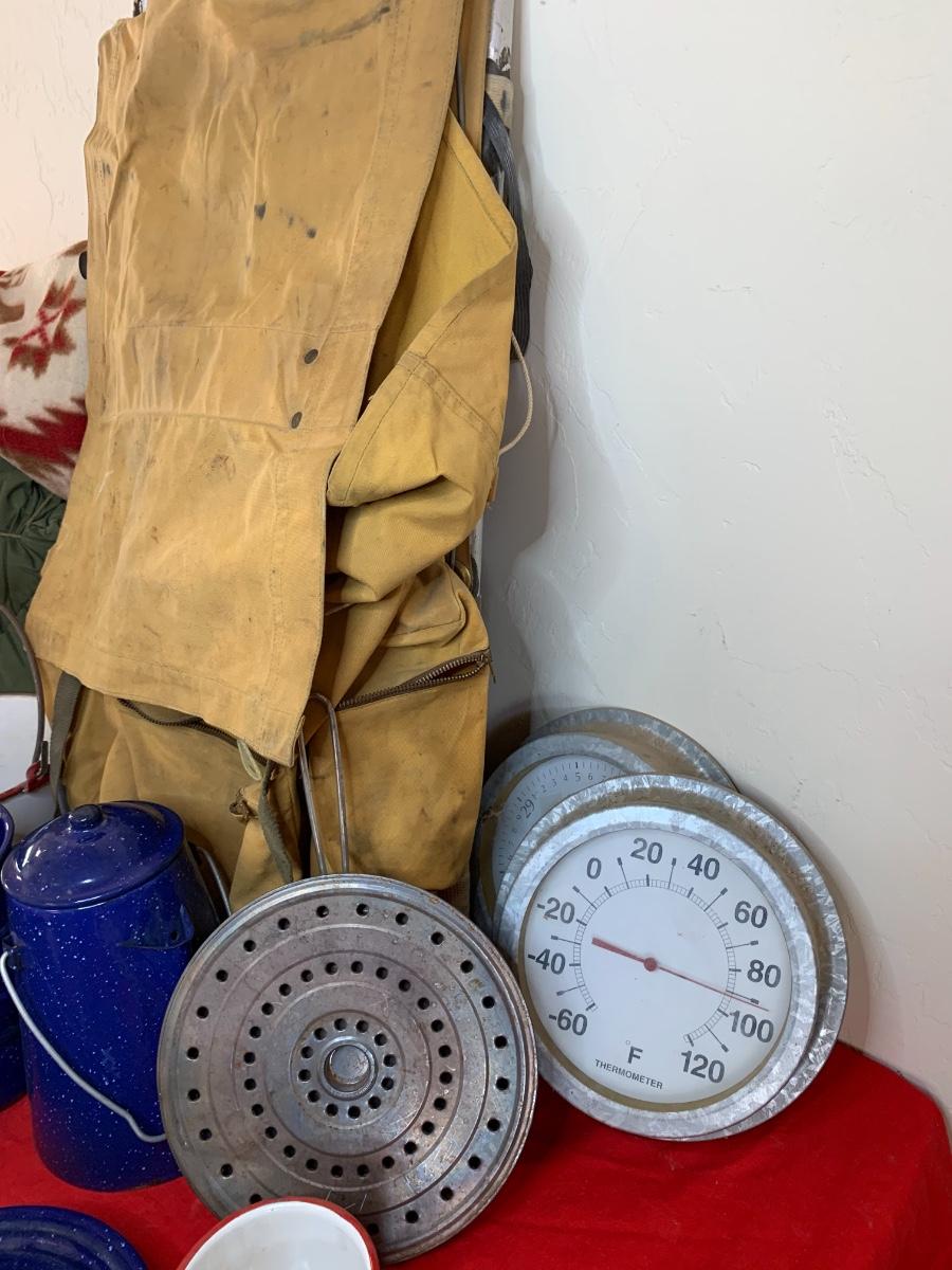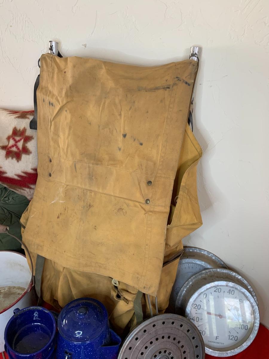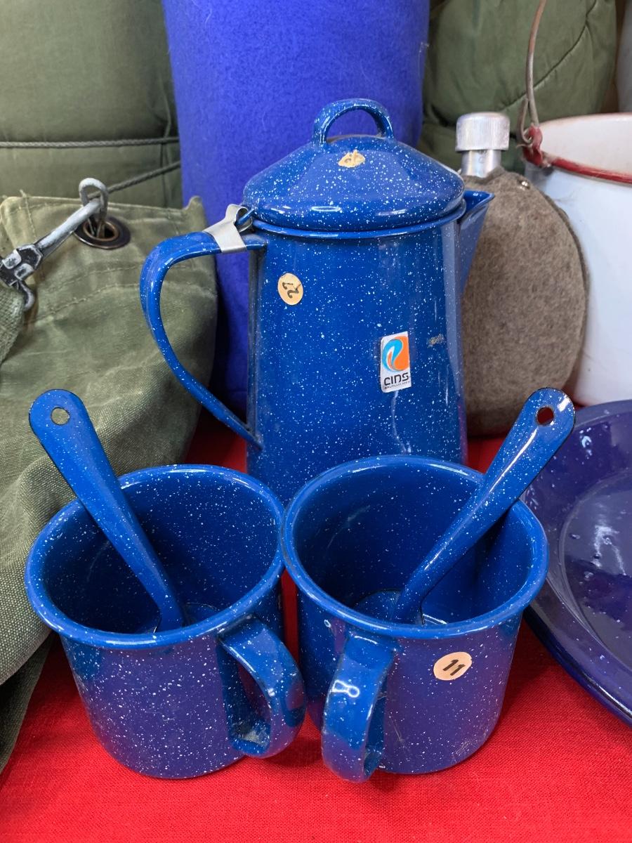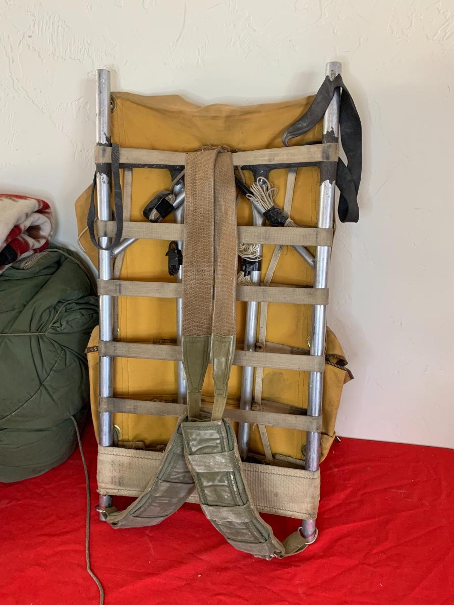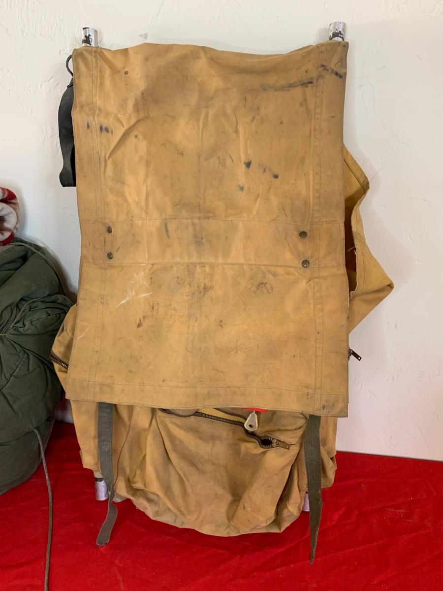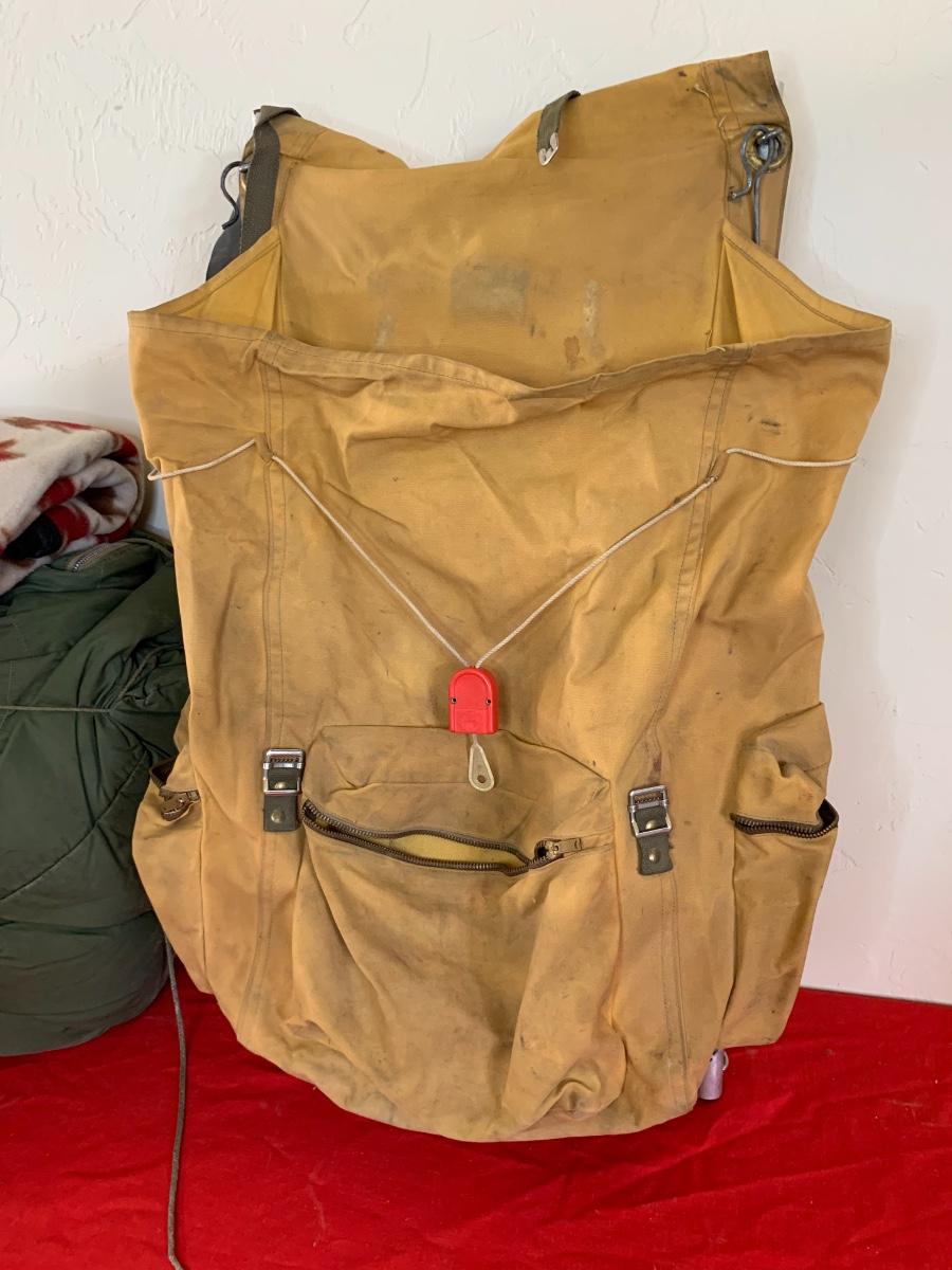 Assortment of vintage camping gear including blankets, backpacks, sleeping bags, travel thermos, enamel camping kitchenware and more