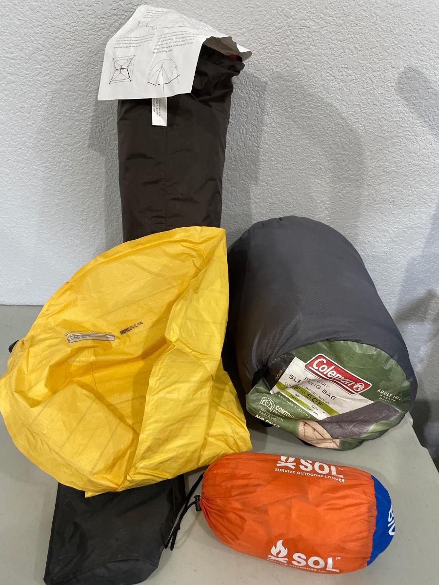 Chaos2 tent, sleeping bag, Thermarest, Neo air mattress, and a survival blanket