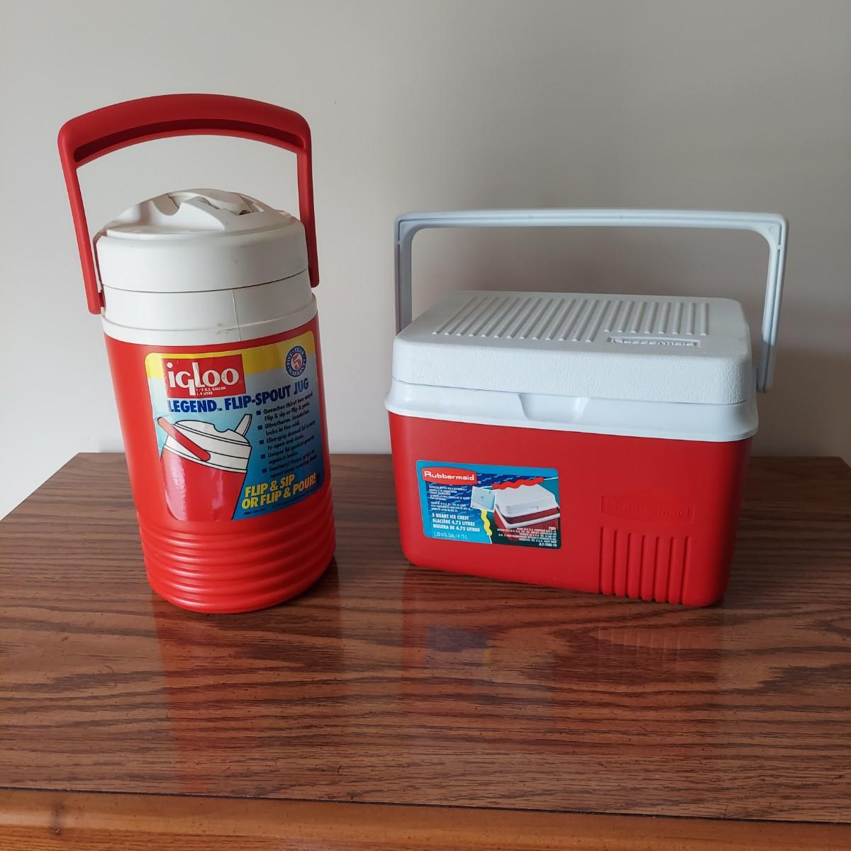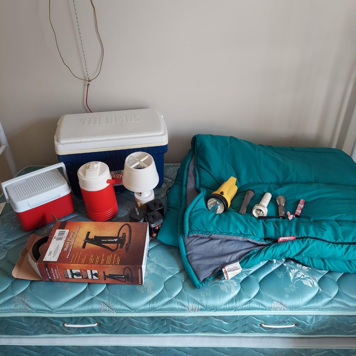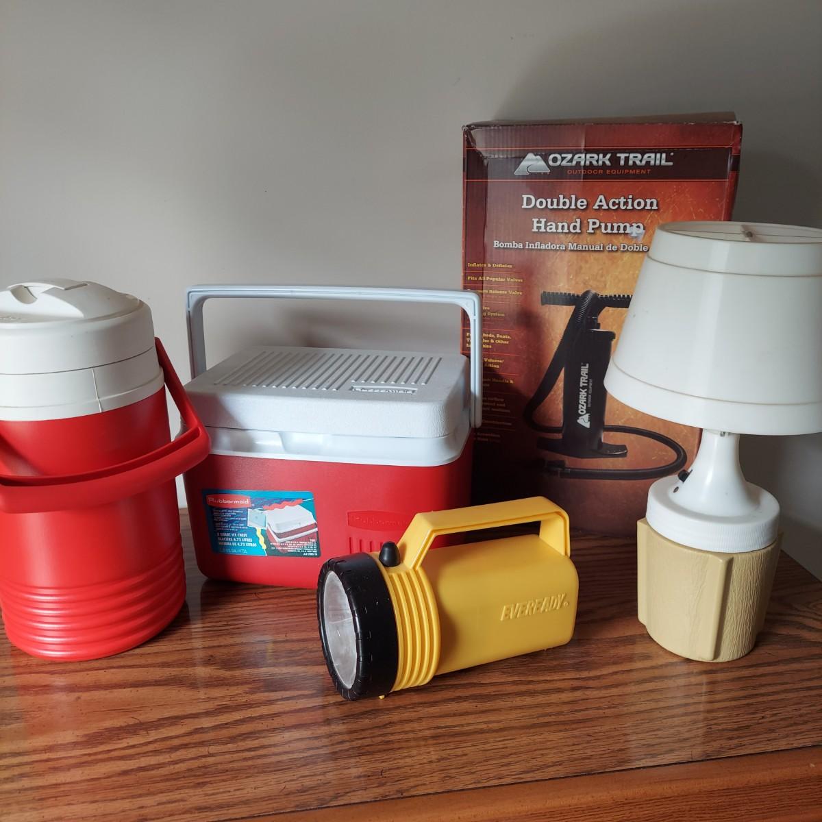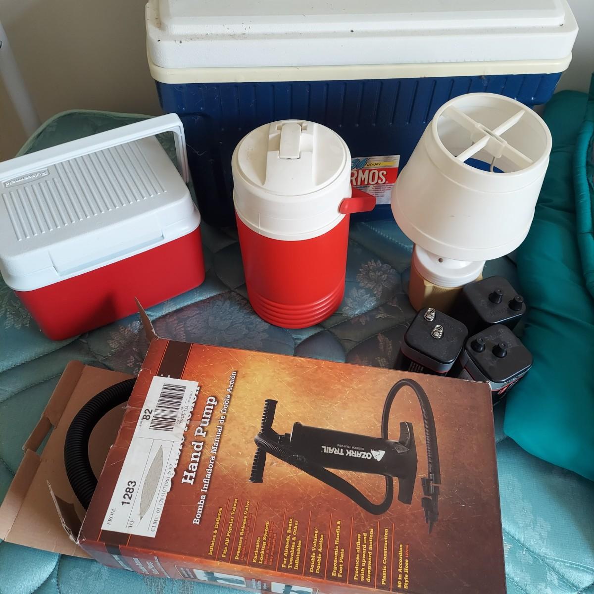 Lot includes several camping items. There are three sizes of coolers by Thermos, Igloo and Rubbermaid, a Coleman sleeping bag, a hand pump, five different sizes of flashlights and a lantern with extra batteries. All battery operated items were tested but most need new batteries. The small lantern appears to need a new bulb. The large Thermos cooler measures 21" x 13" x 14"H. Also included is a GE bayyery powered radio with FM/AM with TV sound plus weather band. Local Pickup Only.