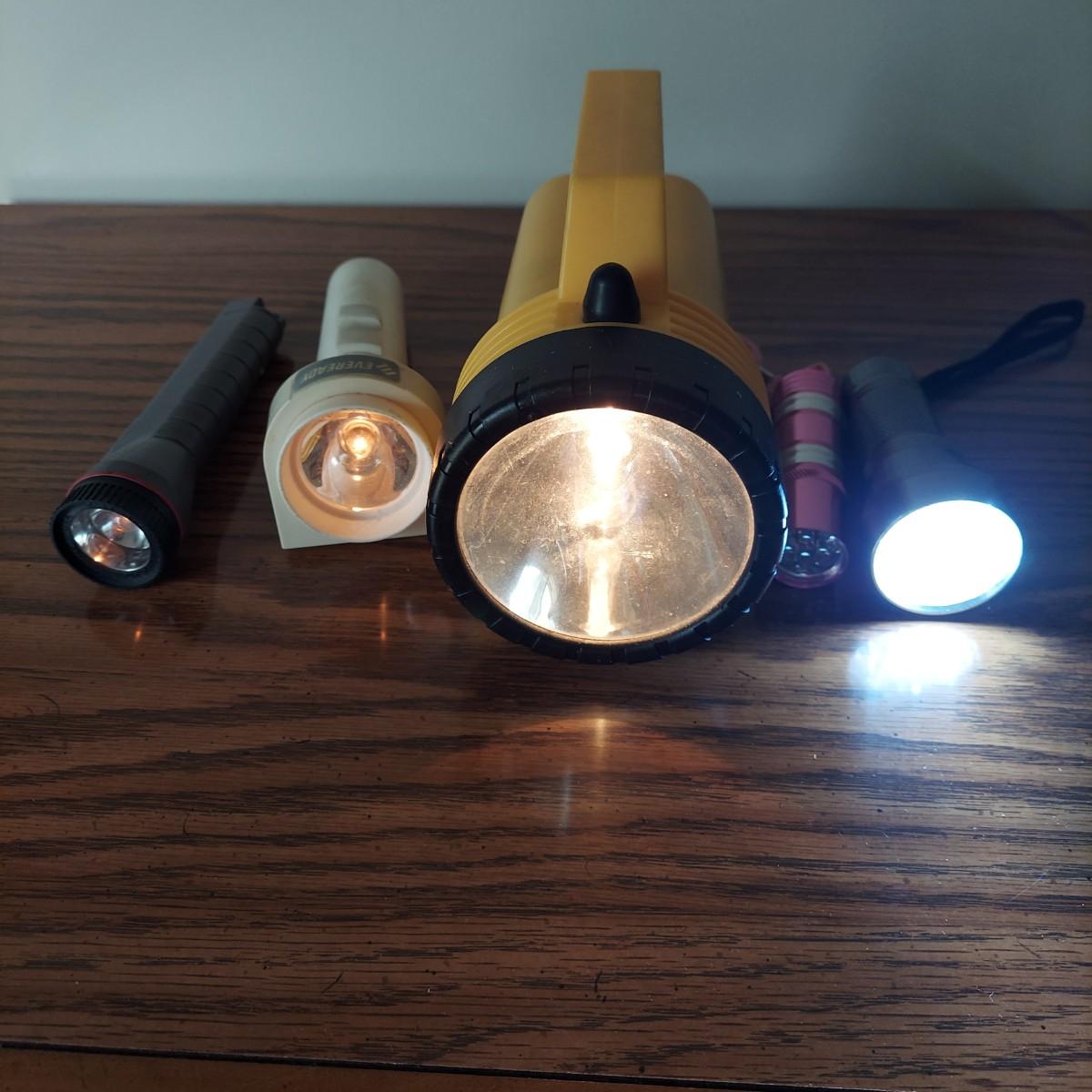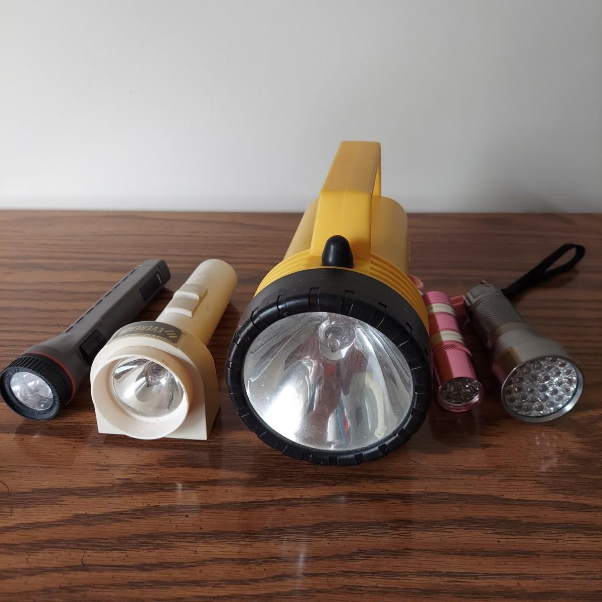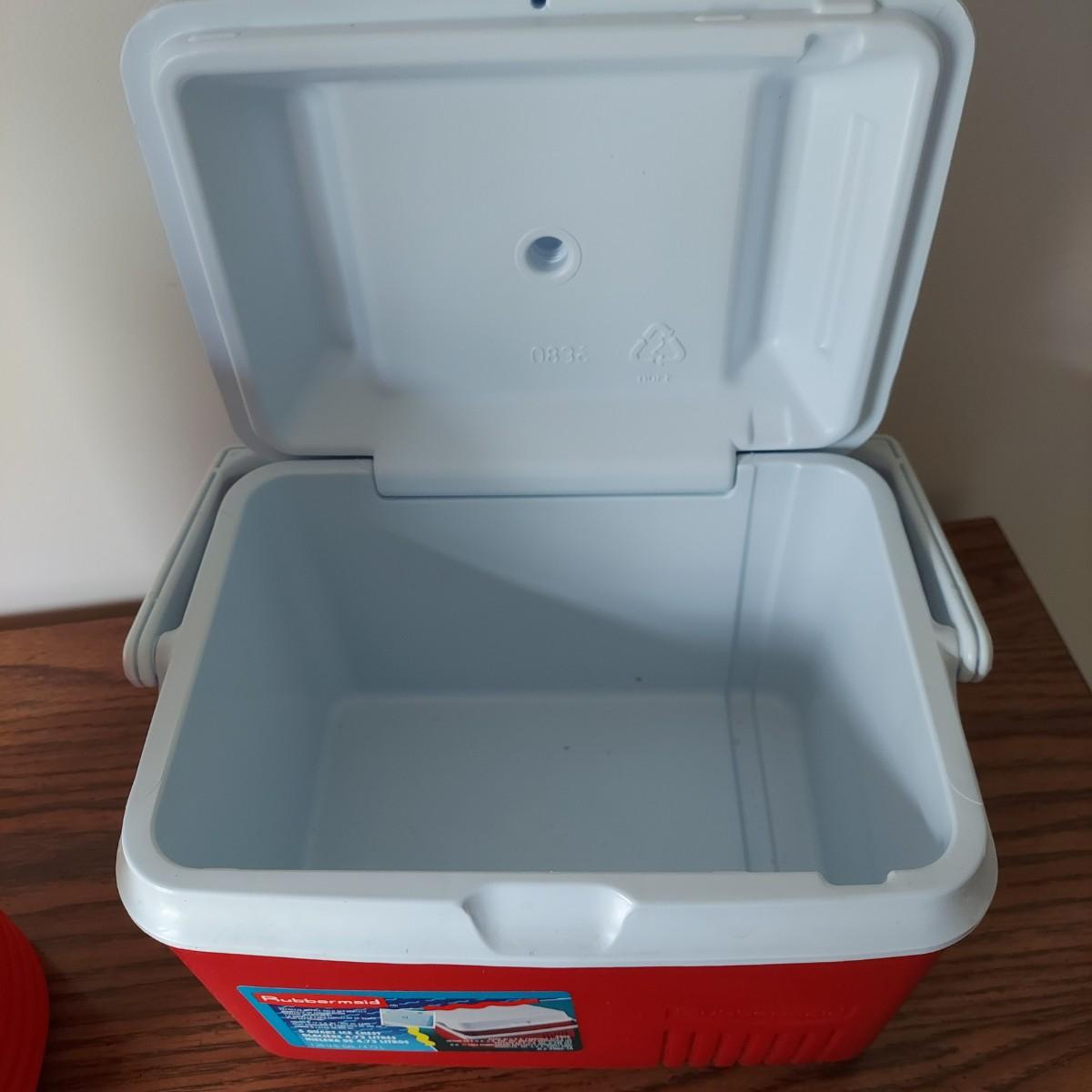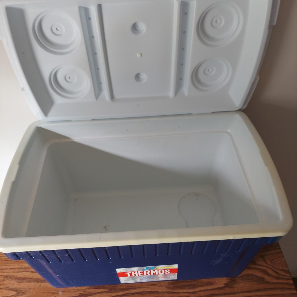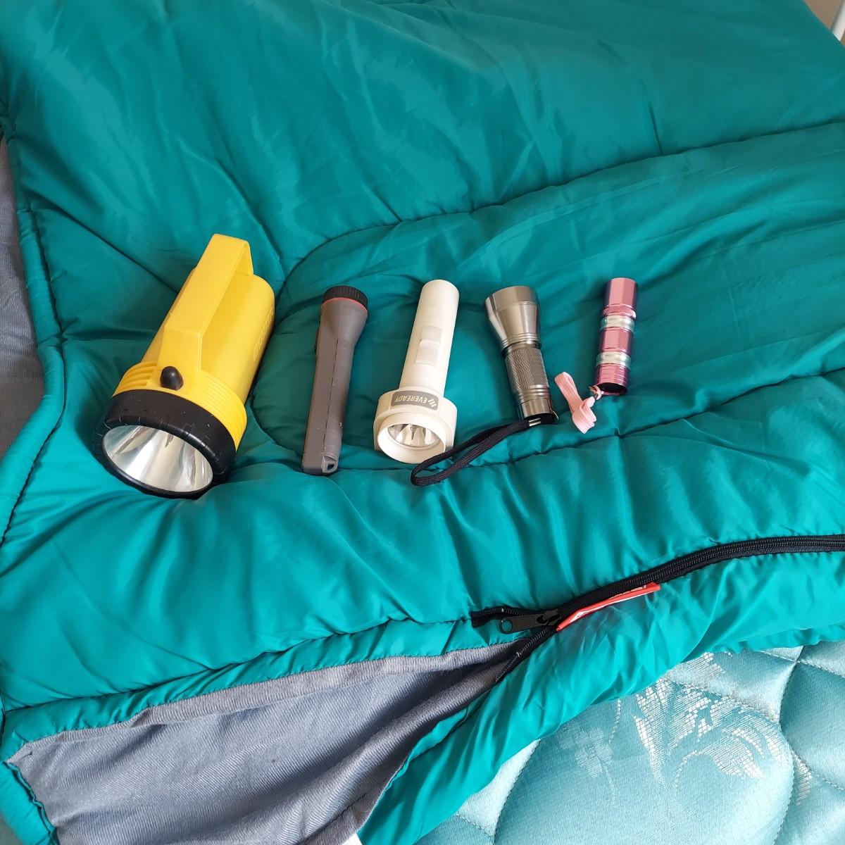 Lot includes several camping items. There are three sizes of coolers by Thermos, Igloo and Rubbermaid, a Coleman sleeping bag, a hand pump, five different sizes of flashlights and a lantern with extra batteries. All battery operated items were tested but most need new batteries. The small lantern appears to need a new bulb. The large Thermos cooler measures 21" x 13" x 14"H. Also included is a GE bayyery powered radio with FM/AM with TV sound plus weather band. Local Pickup Only.
