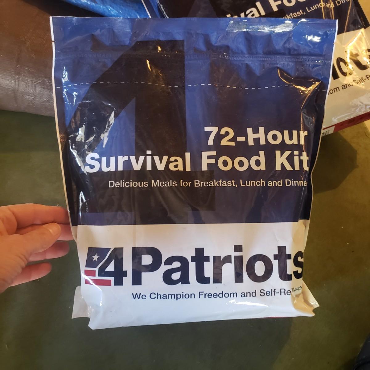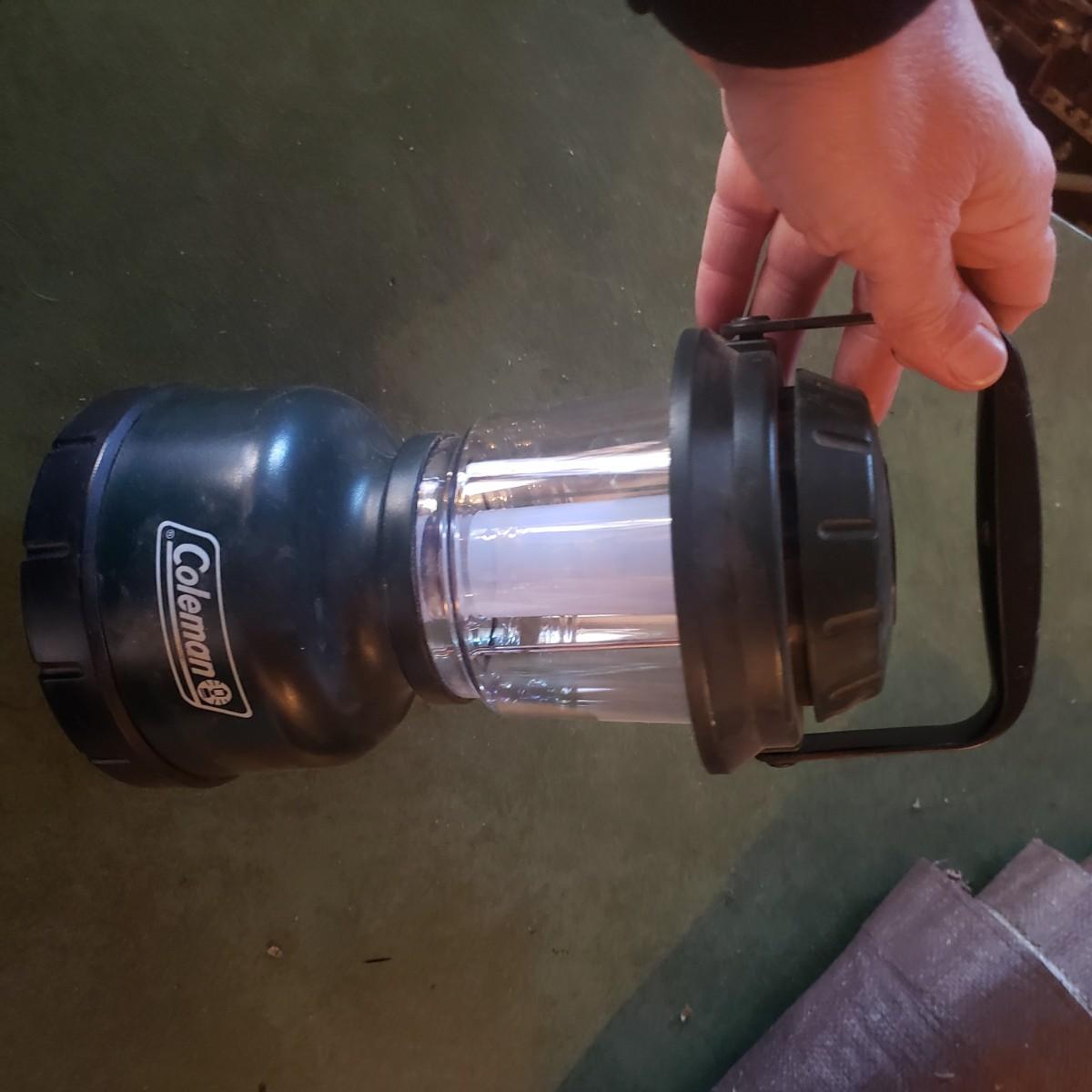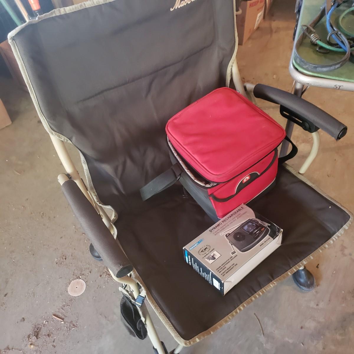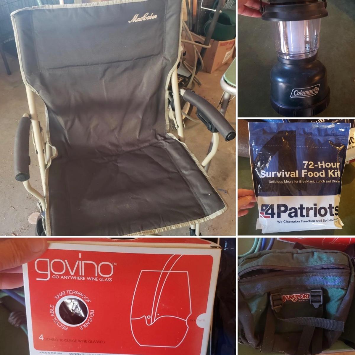 This lot contains bungee cords, two tarps and plastic sheeting, and a Coleman battery lantern. We couldn't test the lantern as it needs D batteries. Two packages of Patriot survival food will fill you up. The Jansen fanny pack has a cup holder. The two MacCabee fold up camping chairs appear barely used. They have a sturdy feel to them. Both come in a strapped carrying case.