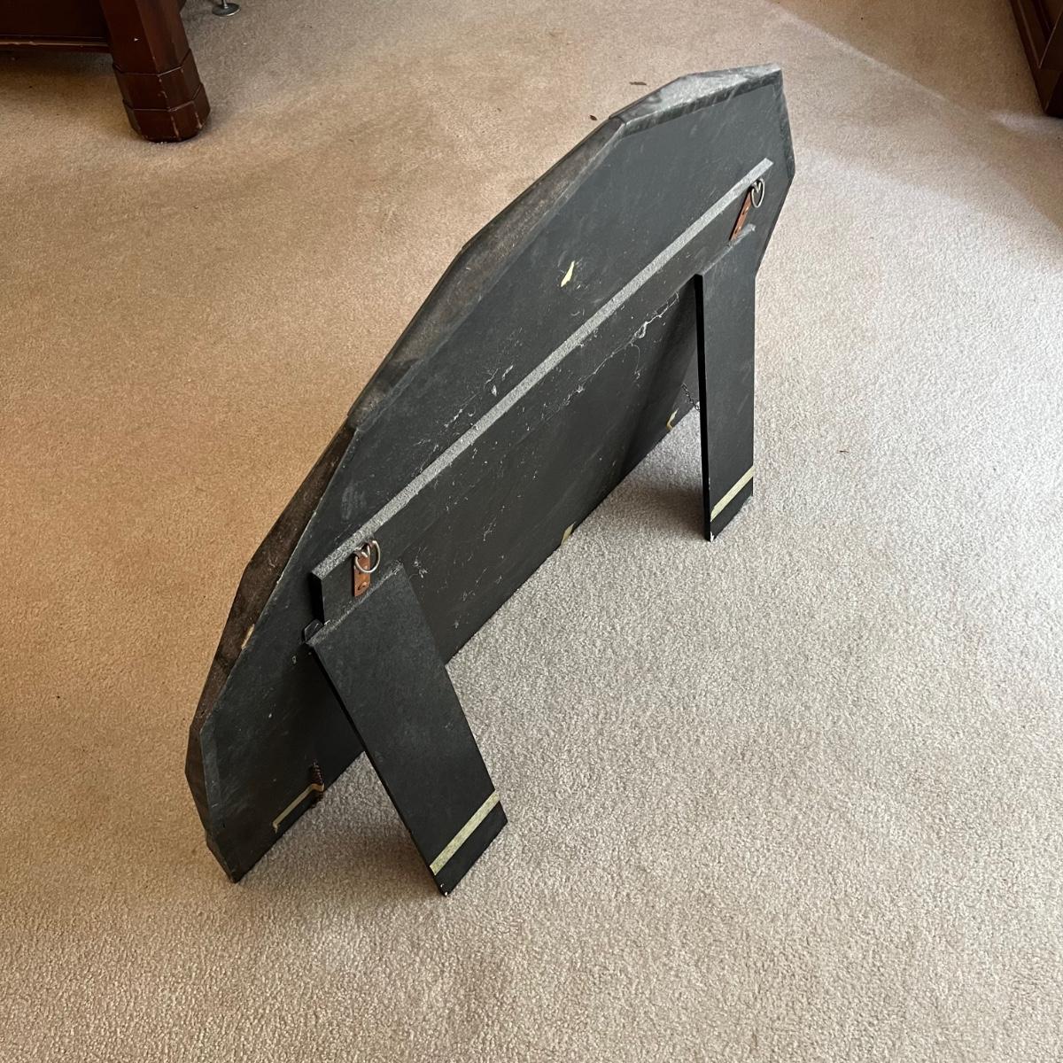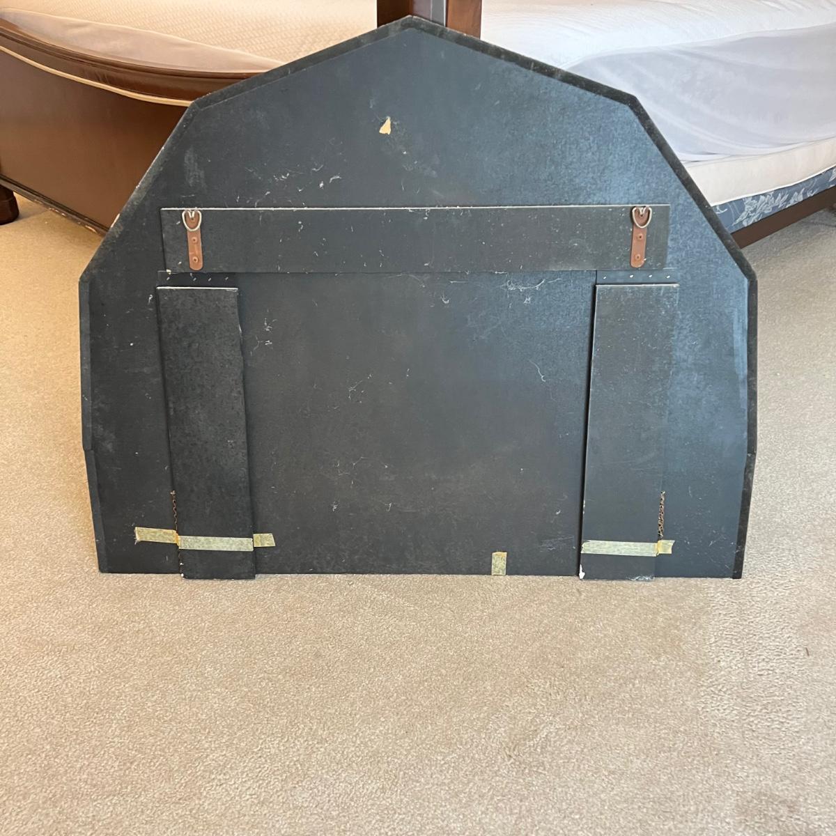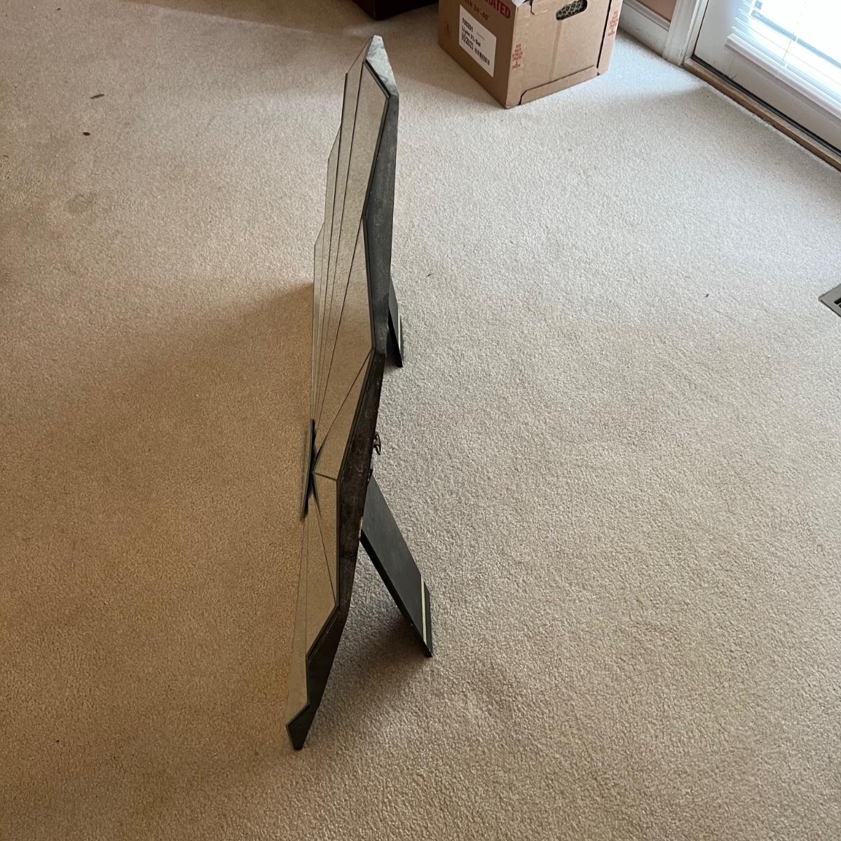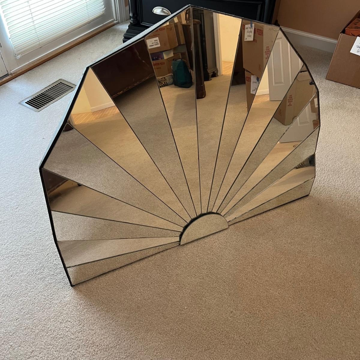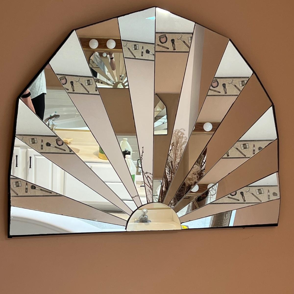 This mirror, designed to appear like a fan or perhaps sunrise measures 36” x 8” x 29”H. It can hang or has the ability to free-stand, as shown in the photos.