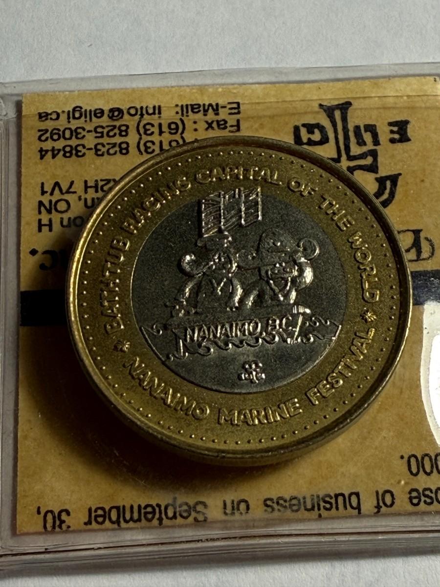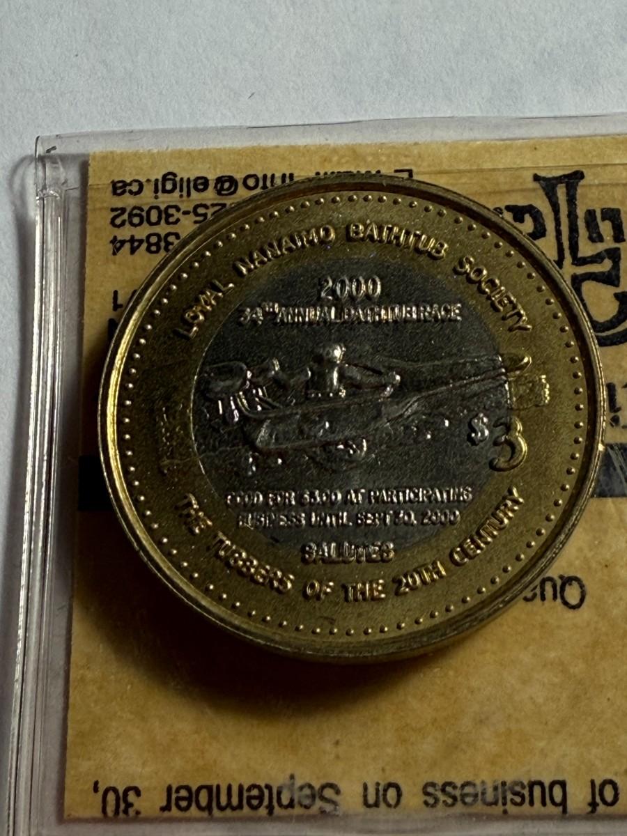 CANADA NANAIMO BC BATHTUB RACES 2000 BI-METALLIC $3 TOKEN MINTAGE-2000 AS PICTURED. $5 DOMESTIC SHIPPING.