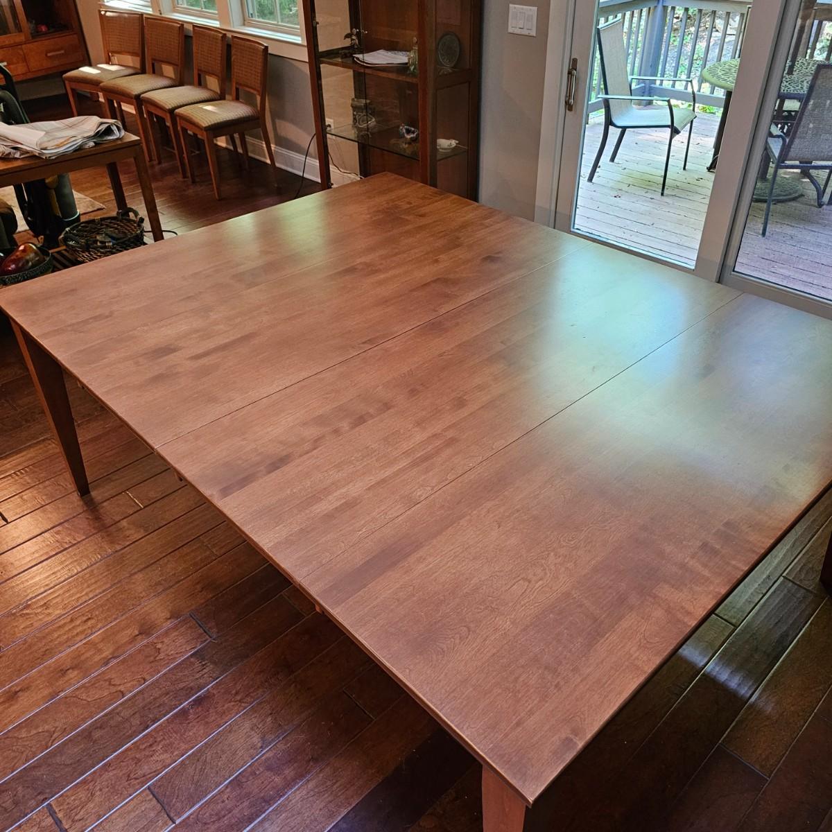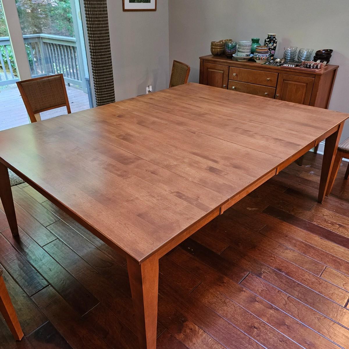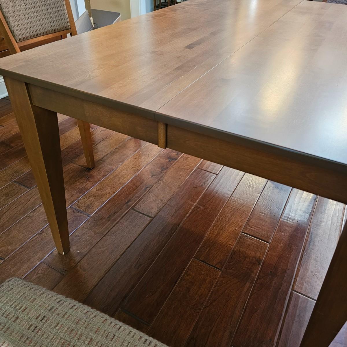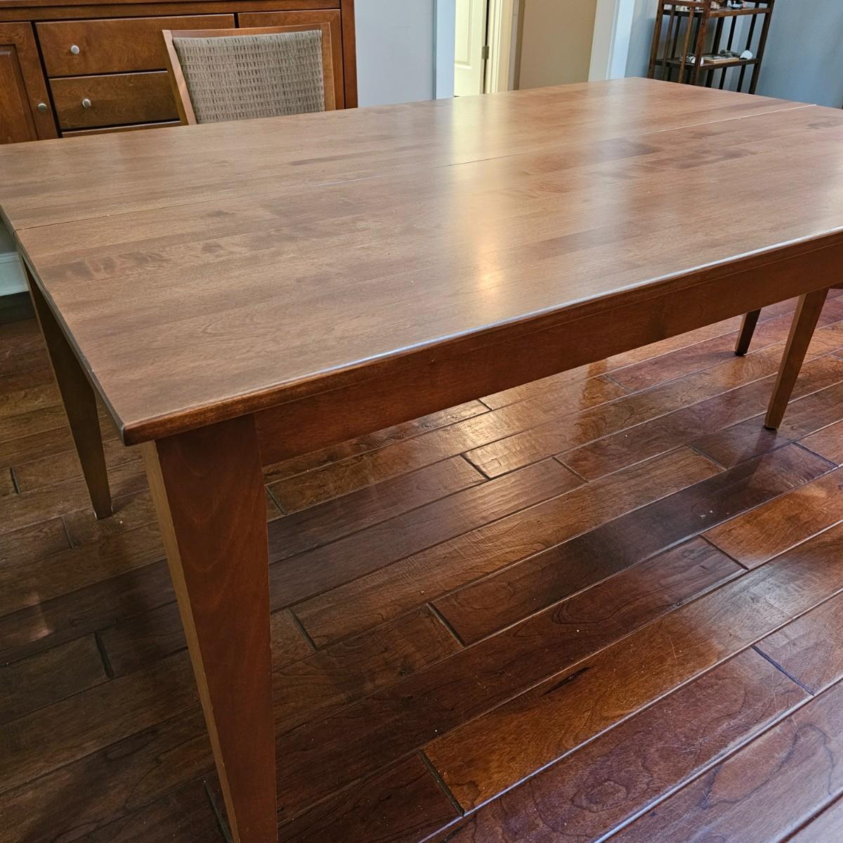 Beautiful maple dining table by Canadel of Canada. Table has natural color finish, tapered legs, and measures 40" x 60" x 30"H. With the addition of the two 20" leaves it expands to 80" x 60" x 30"H. See photos for details. Also see separate listing for dining room chairs in this auction. Local pickup only. Winning bidder must bring assistance to help move and load this item due to its weight and/or size.