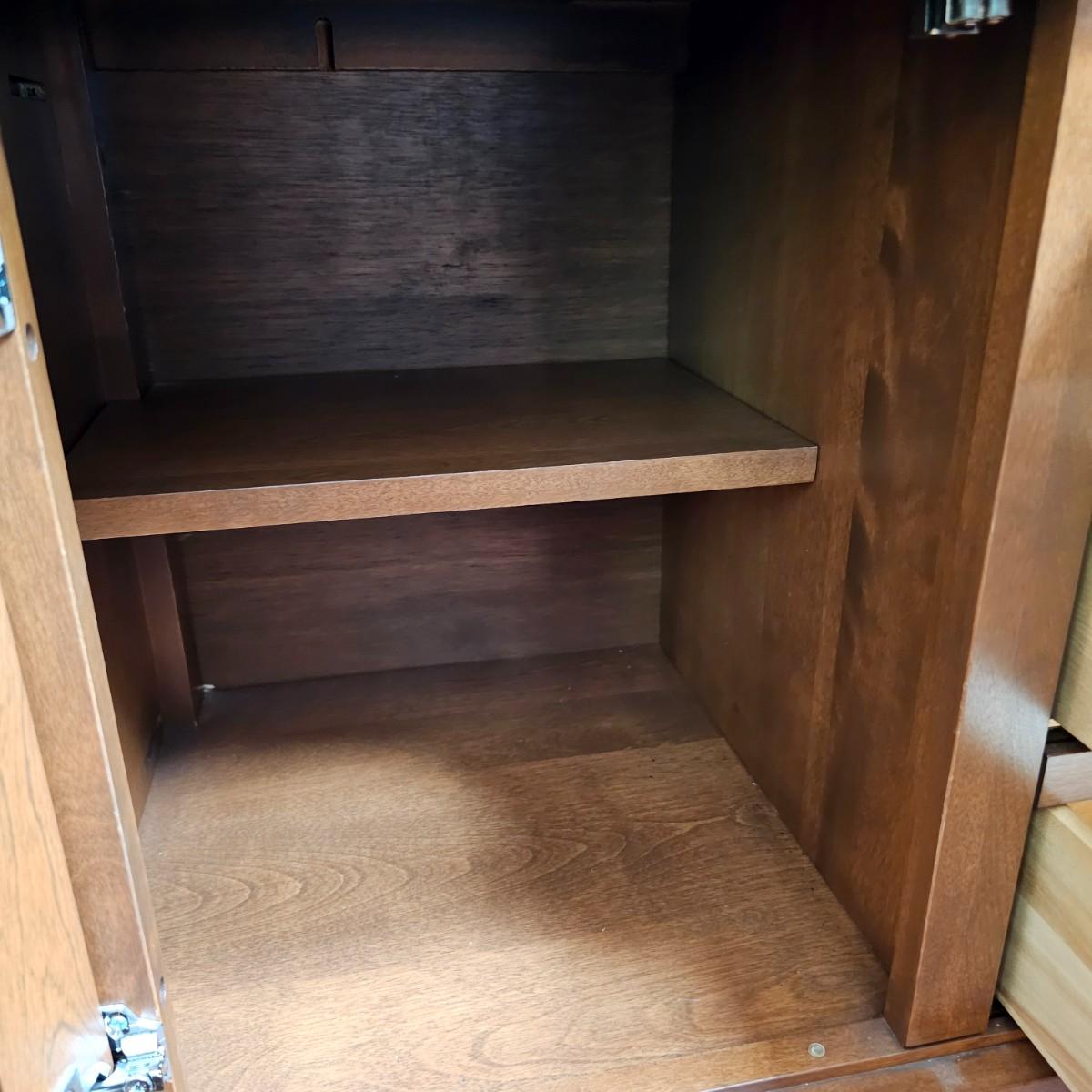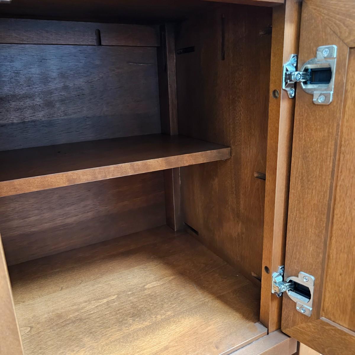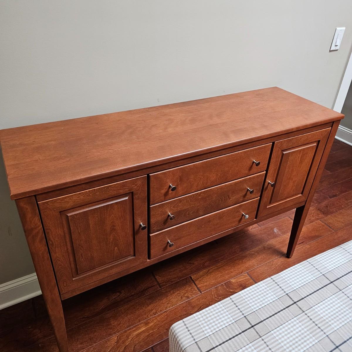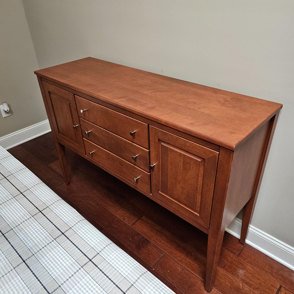 Solid wood sideboard or buffet for the dining room by Canadel of Canada. Decorative side door compartments with shelf inside, three center drawers with dovetail joints. Piece measures 54"x 17" x 36.5"H. See photos for details. Local pickup only. Winning bidder must bring assistance to help move and load this item due to its weight and/or size. Item will need to be moved down three steps.